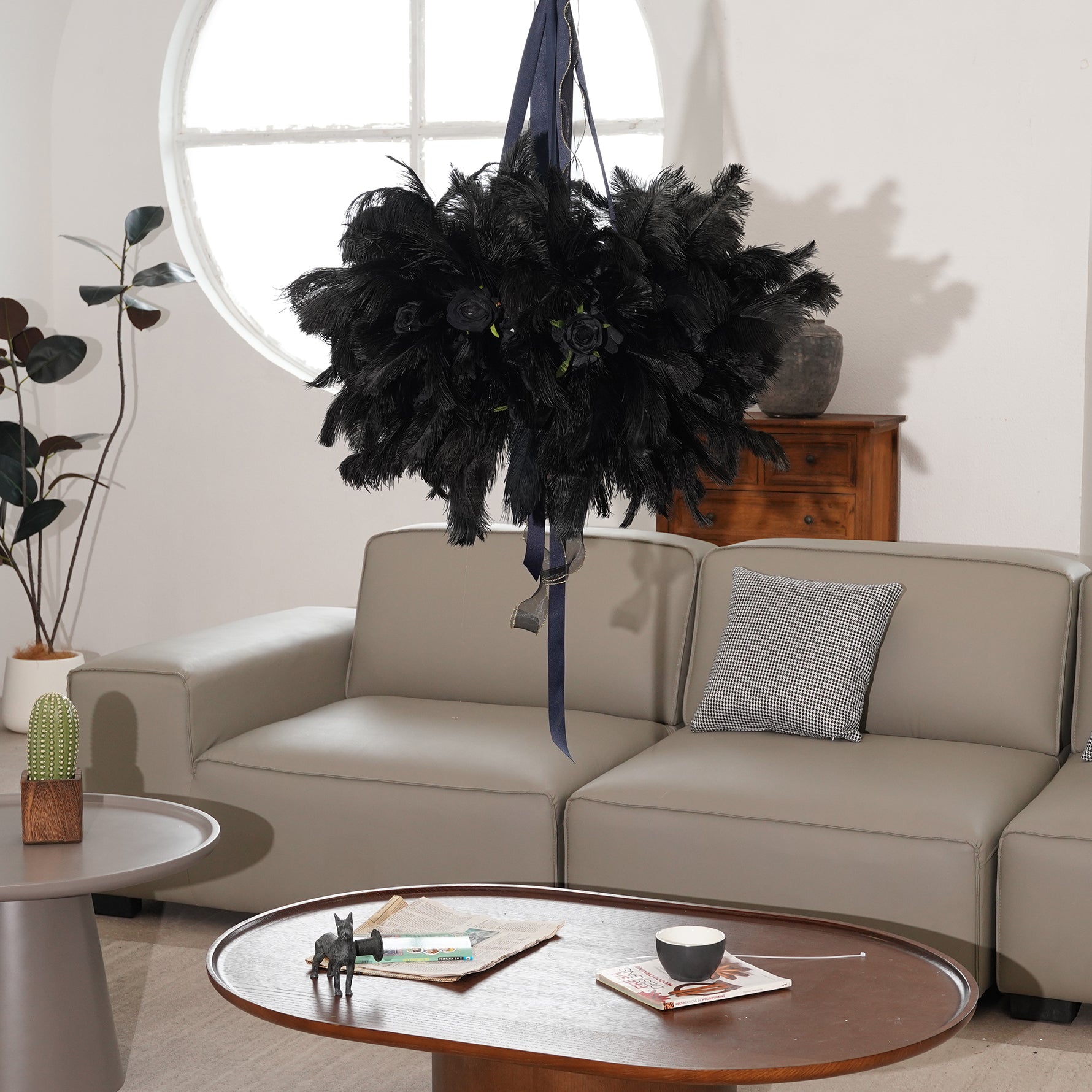 Inspiration: Hanging wreath made of feathers and flowers from the ceiling adds a natural element and unique beauty to the space. It creates a warm and cozy atmosphere in the home and can also be used with other decorations to create a personalized interior design style. In addition, hanging flowers from the ceiling represents hanging beautiful things high up in the air so that they emit more positive energy and bring good luck and happiness to people!