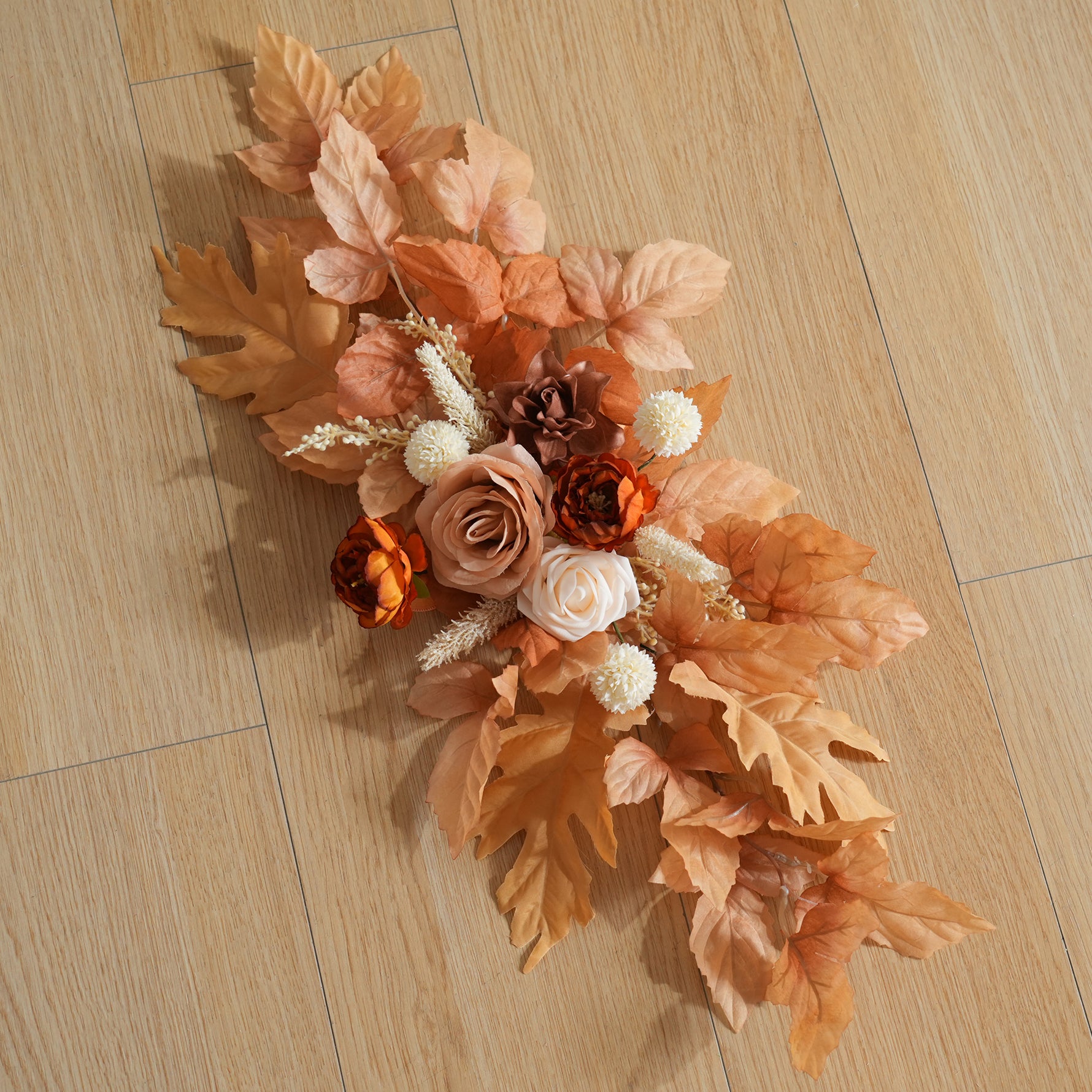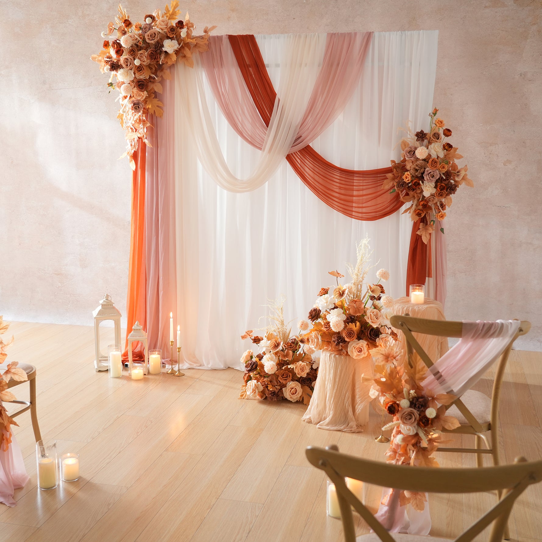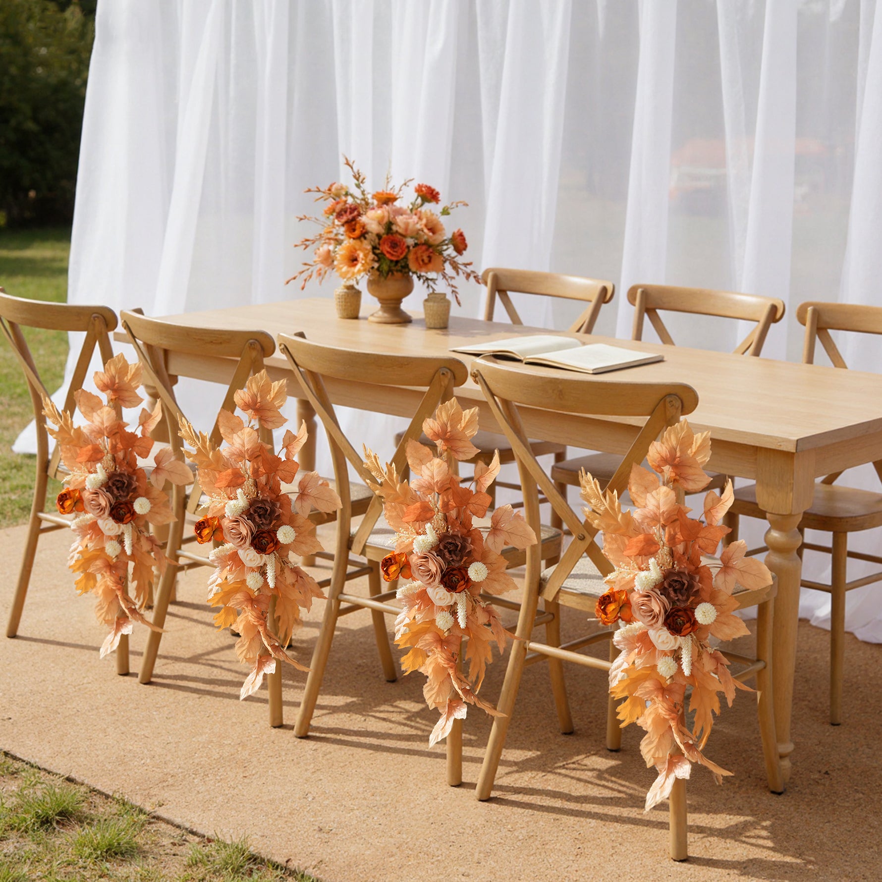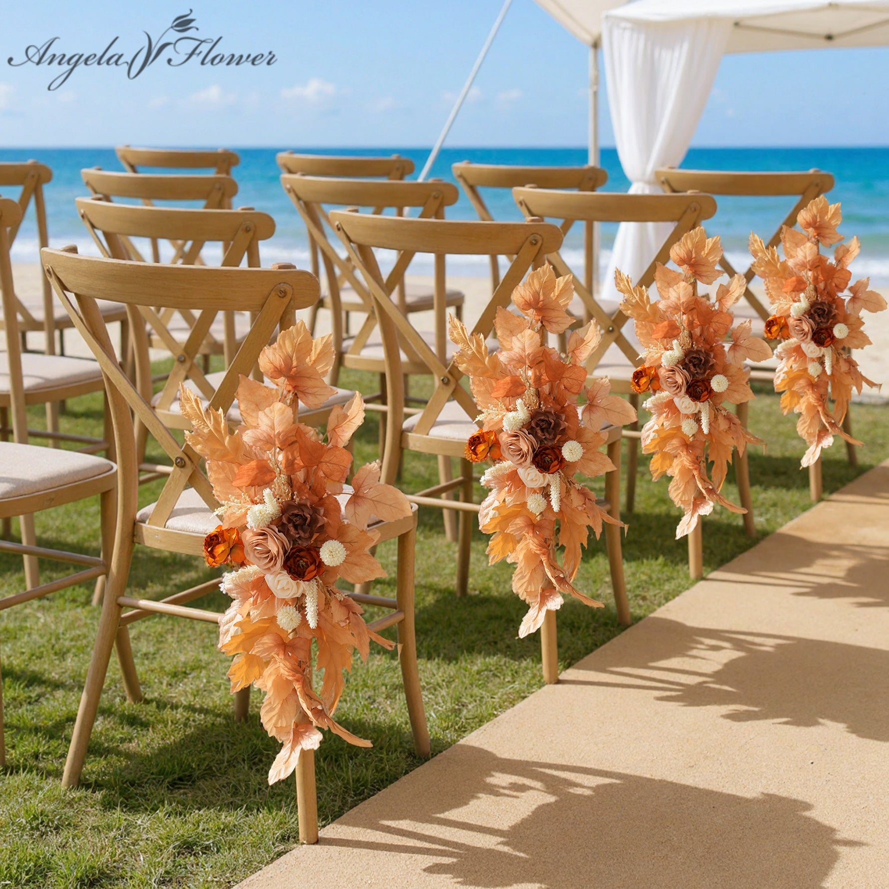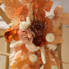 Color Inspiration: “Light Coffee Brown Rose” chair flowers are the ultimate ambiance enhancer for weddings: their warm brown-orange hues envelop guests in relaxed bliss, anchoring the romantic setting. Arranged along the aisle as a sunset-inspired pathway, they instantly create cinematic moments. Complementing every wedding gown, the soft-mist floral materials paired with warm tones form a sophisticated focal point, enveloping guests in gentle warmth the moment they take their seats.