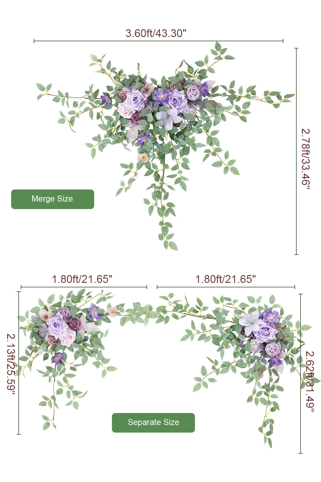 Size: Two artificial flowers can be merged and used together, or they can be used separately, depending on what you like. After the two flowers are combined, the approximate dimensions are 43'' by 33''. One flower corner swag design measures about 21.6"L x 25.5" W, another flower tie measures 21.6"L x 31.4" W.