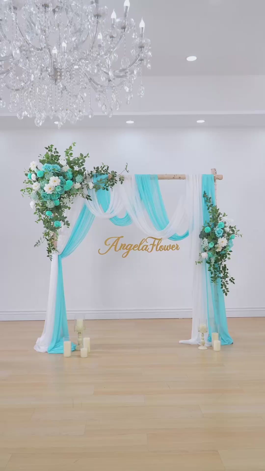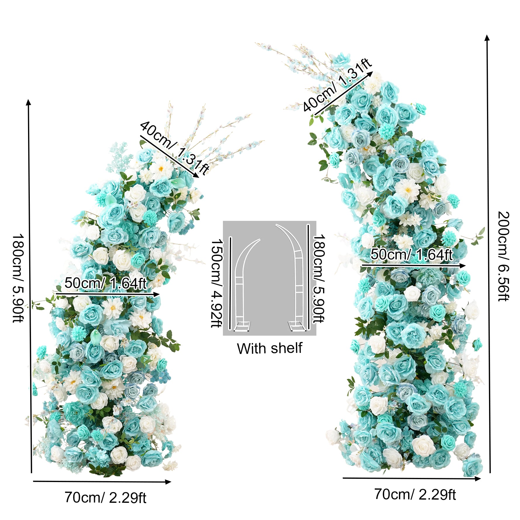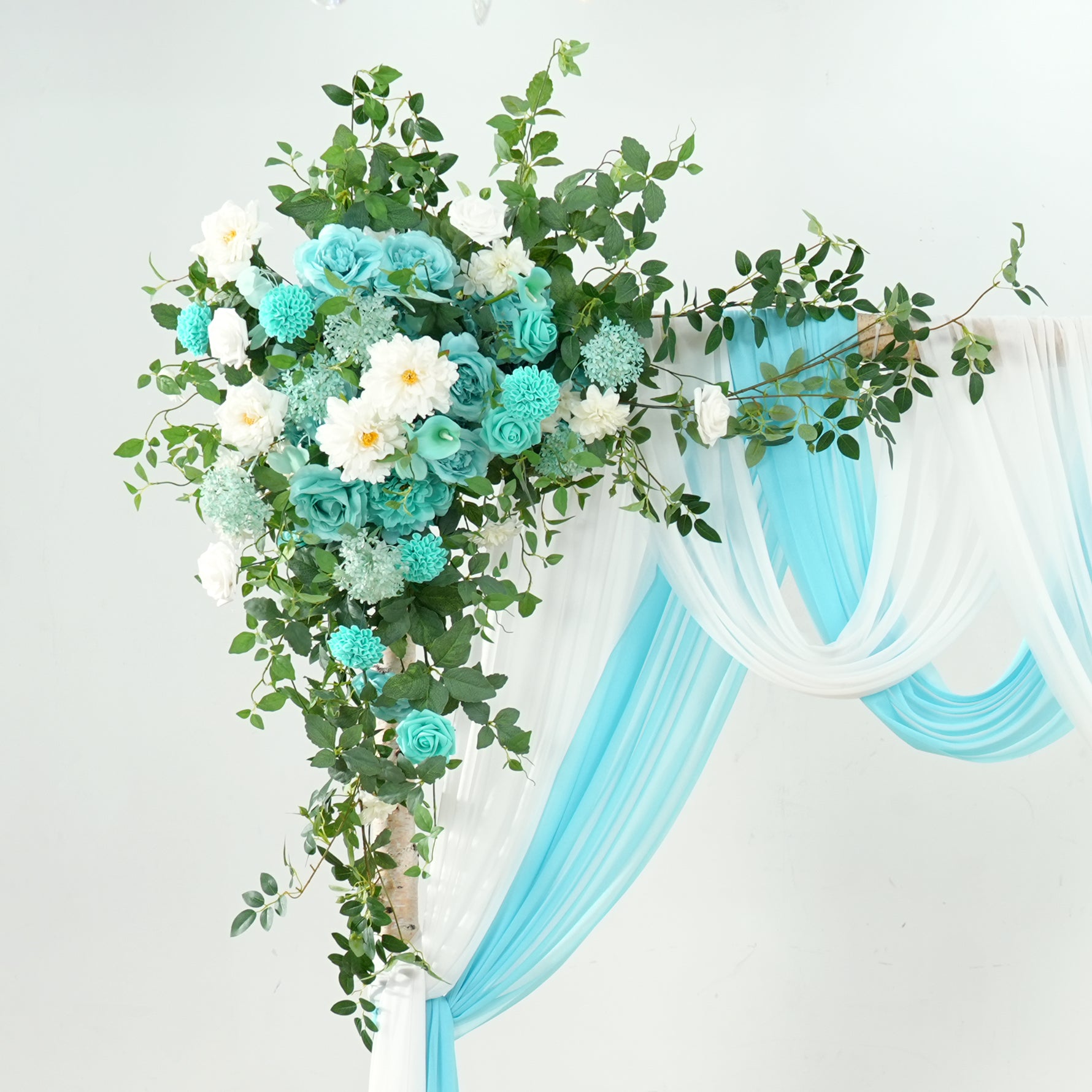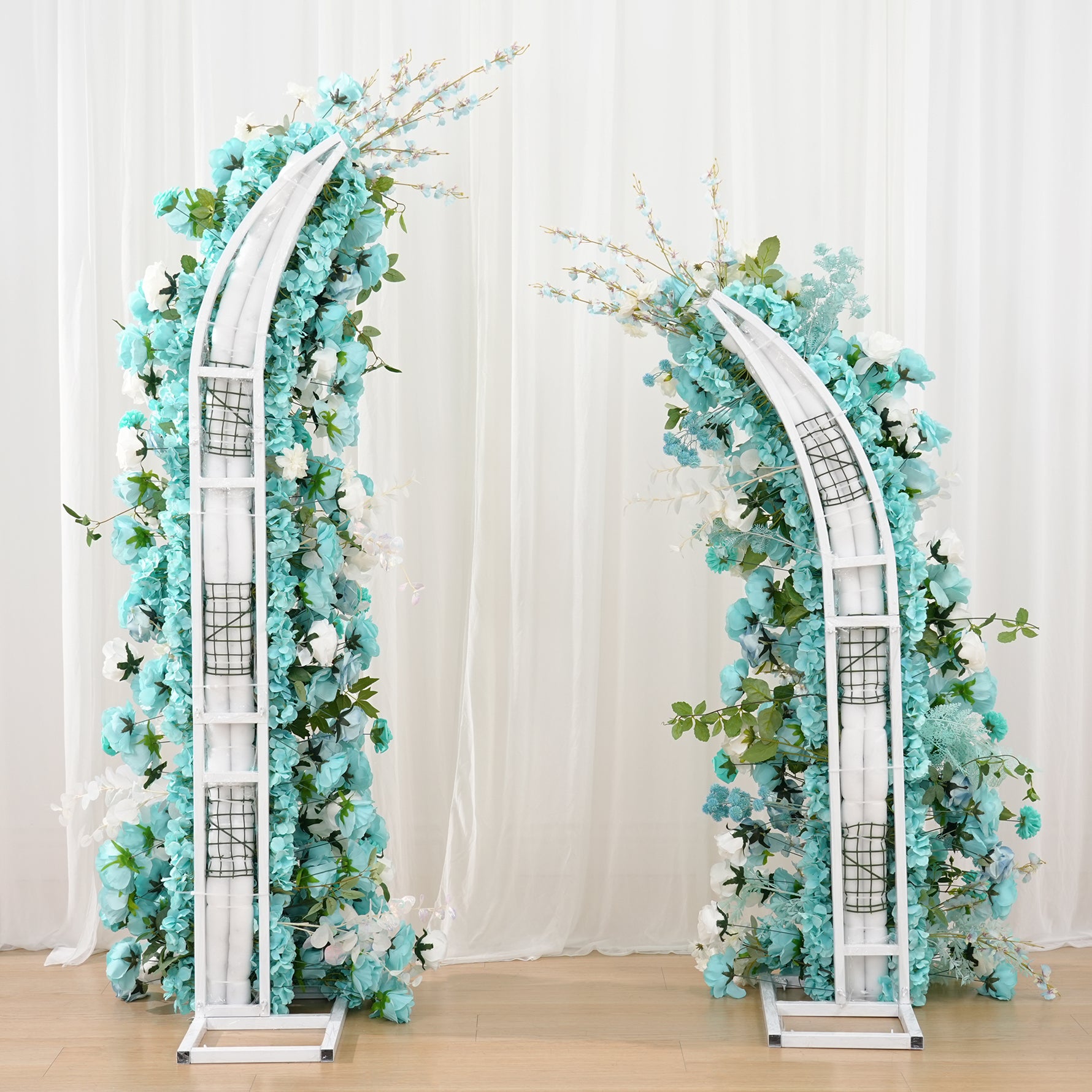 Color Inspiration: Inspired by the serene lake in the garden, if you need a lake blue themed lakeside wedding we recommend this horn arch to go with it, soft sunlight from the green leafy gaps, the sparkling lake and the lake blue arches are skillfully paired to give you a serene and beautiful wedding.