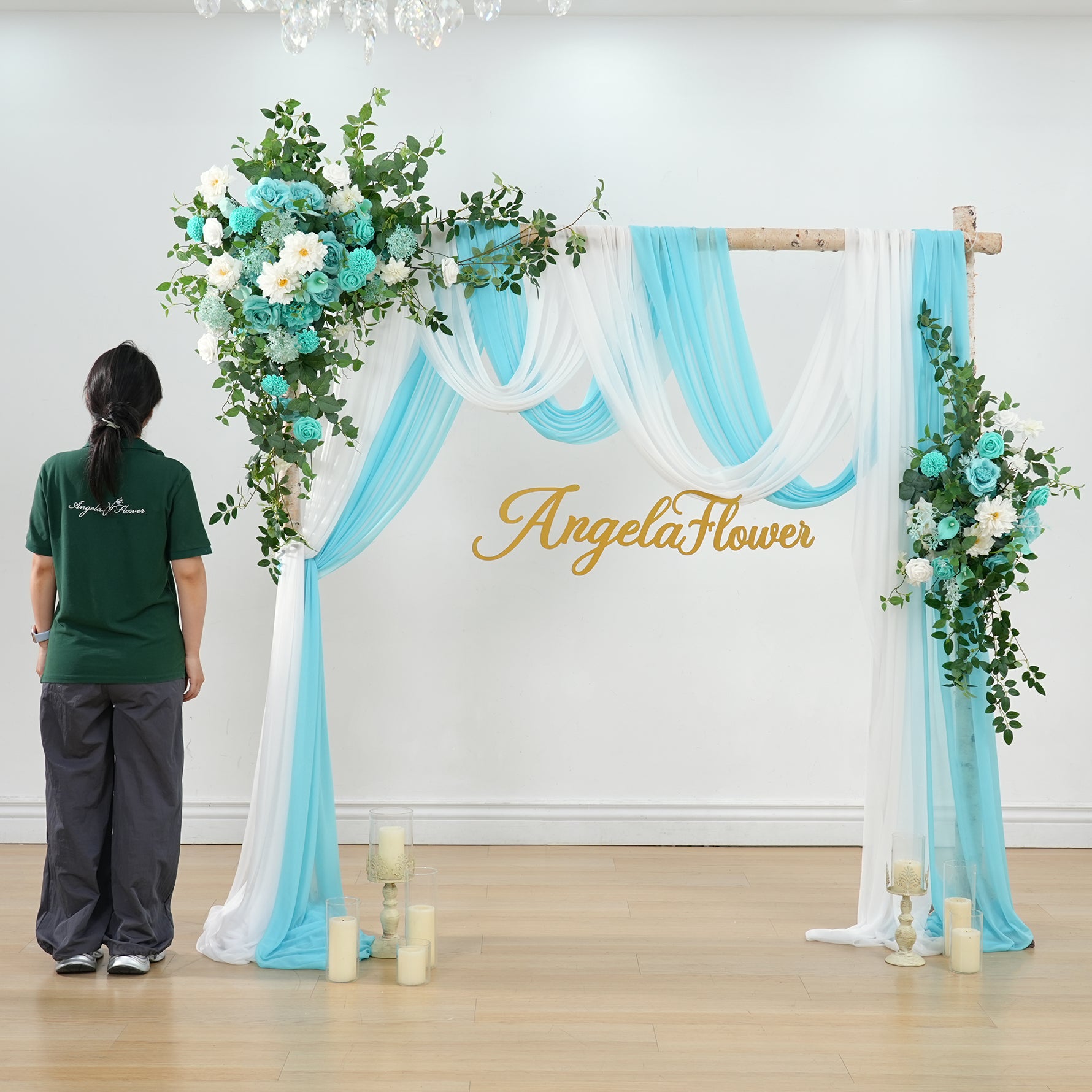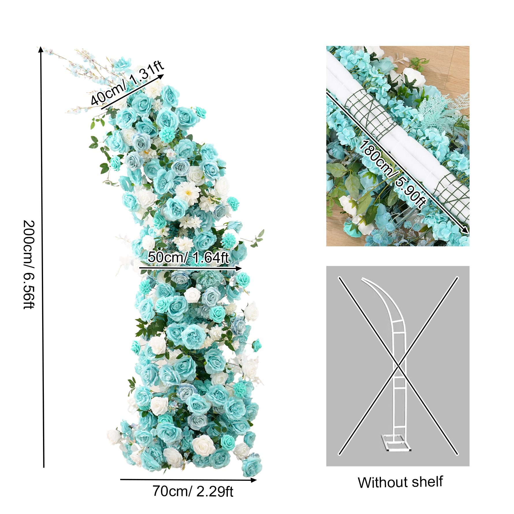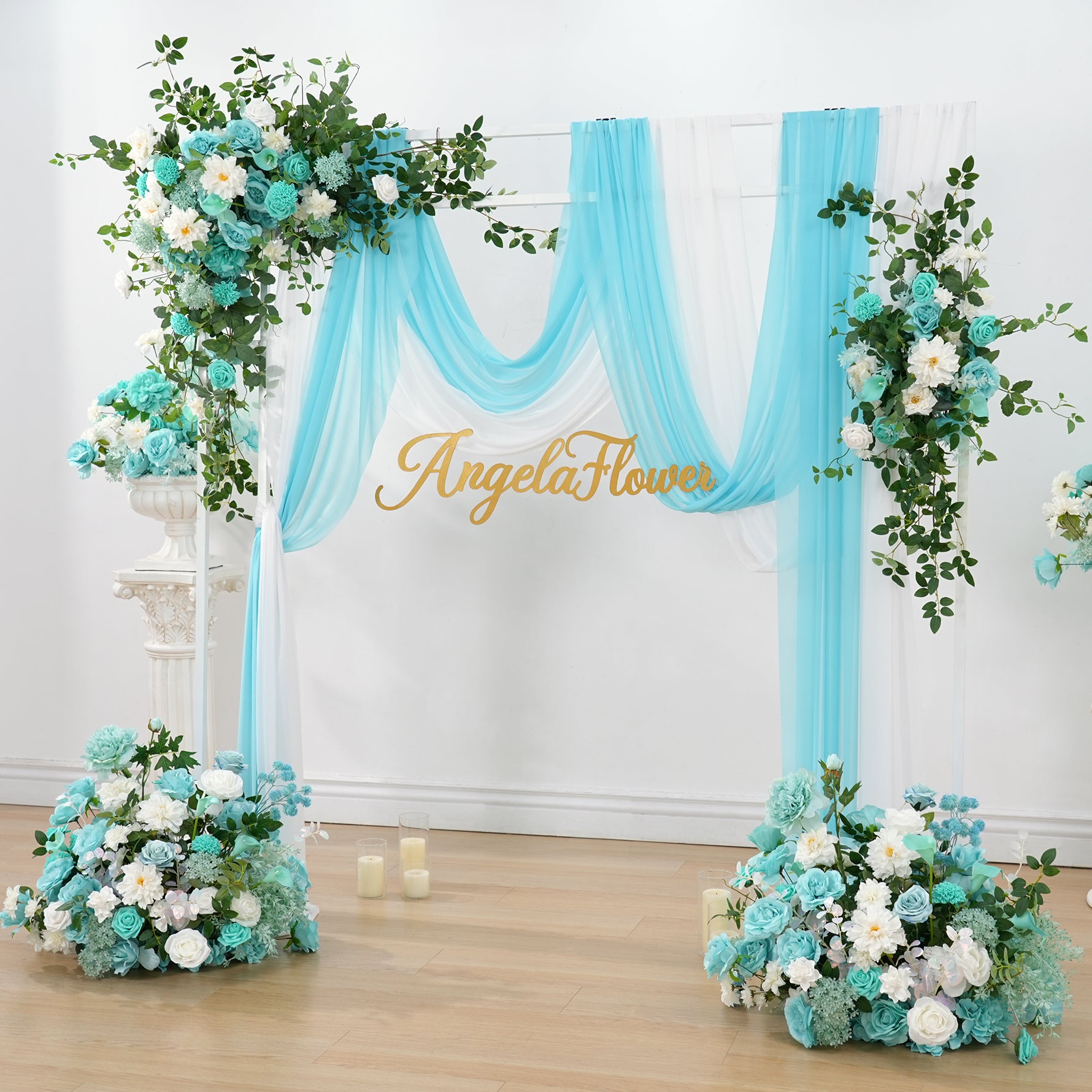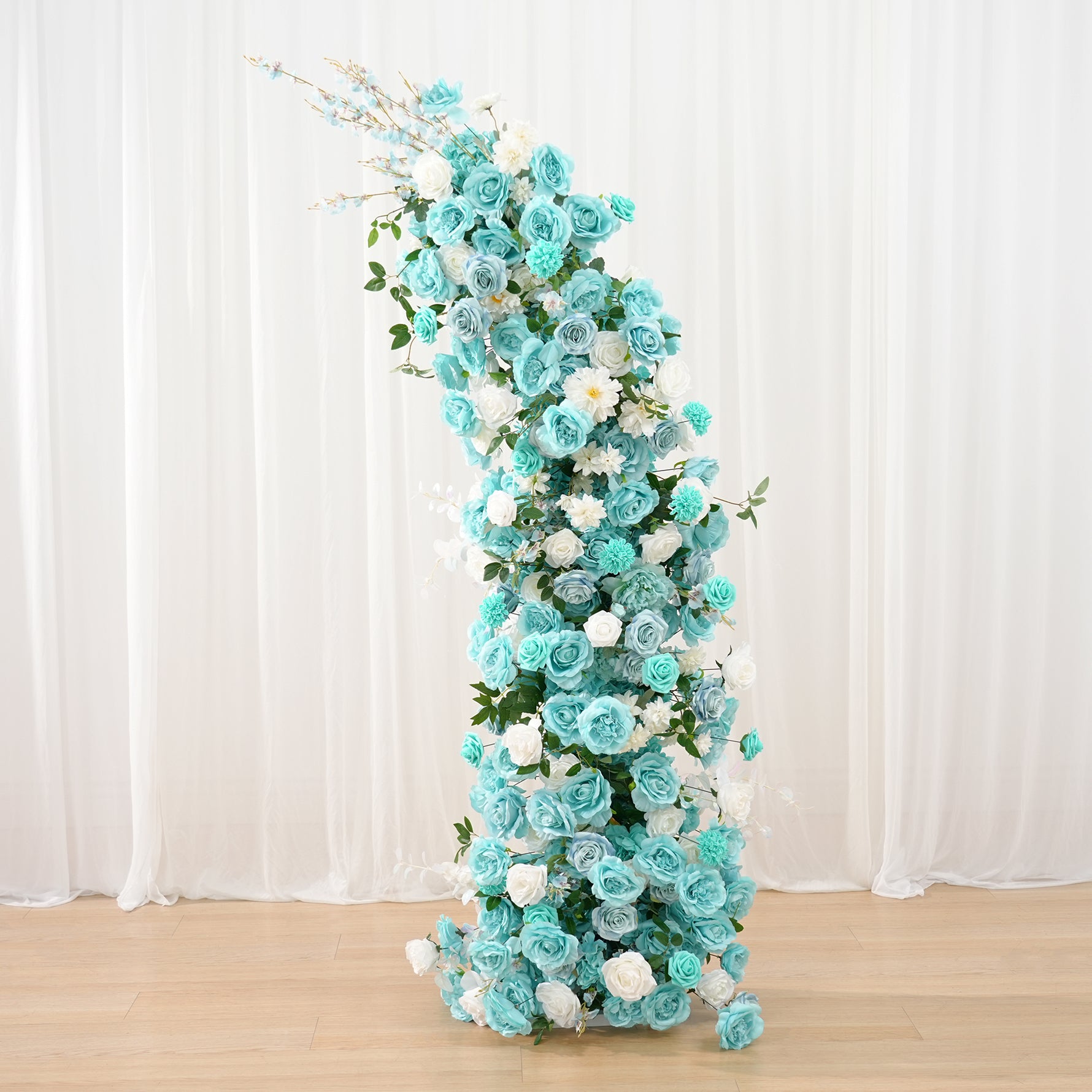 Color Inspiration: Inspired by the serene lake in the garden, if you need a lake blue themed lakeside wedding we recommend this horn arch to go with it, soft sunlight from the green leafy gaps, the sparkling lake and the lake blue arches are skillfully paired to give you a serene and beautiful wedding.