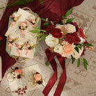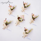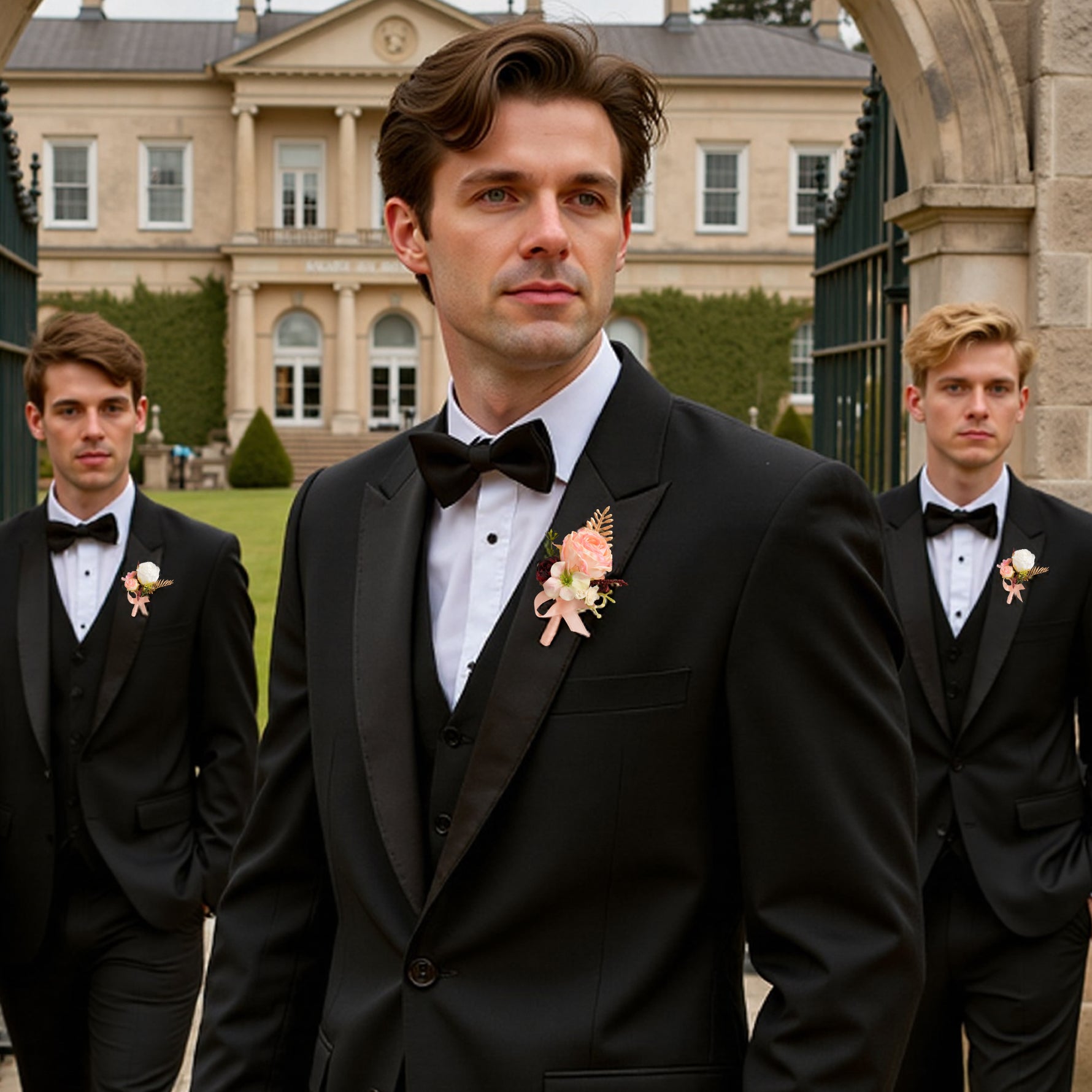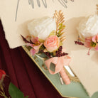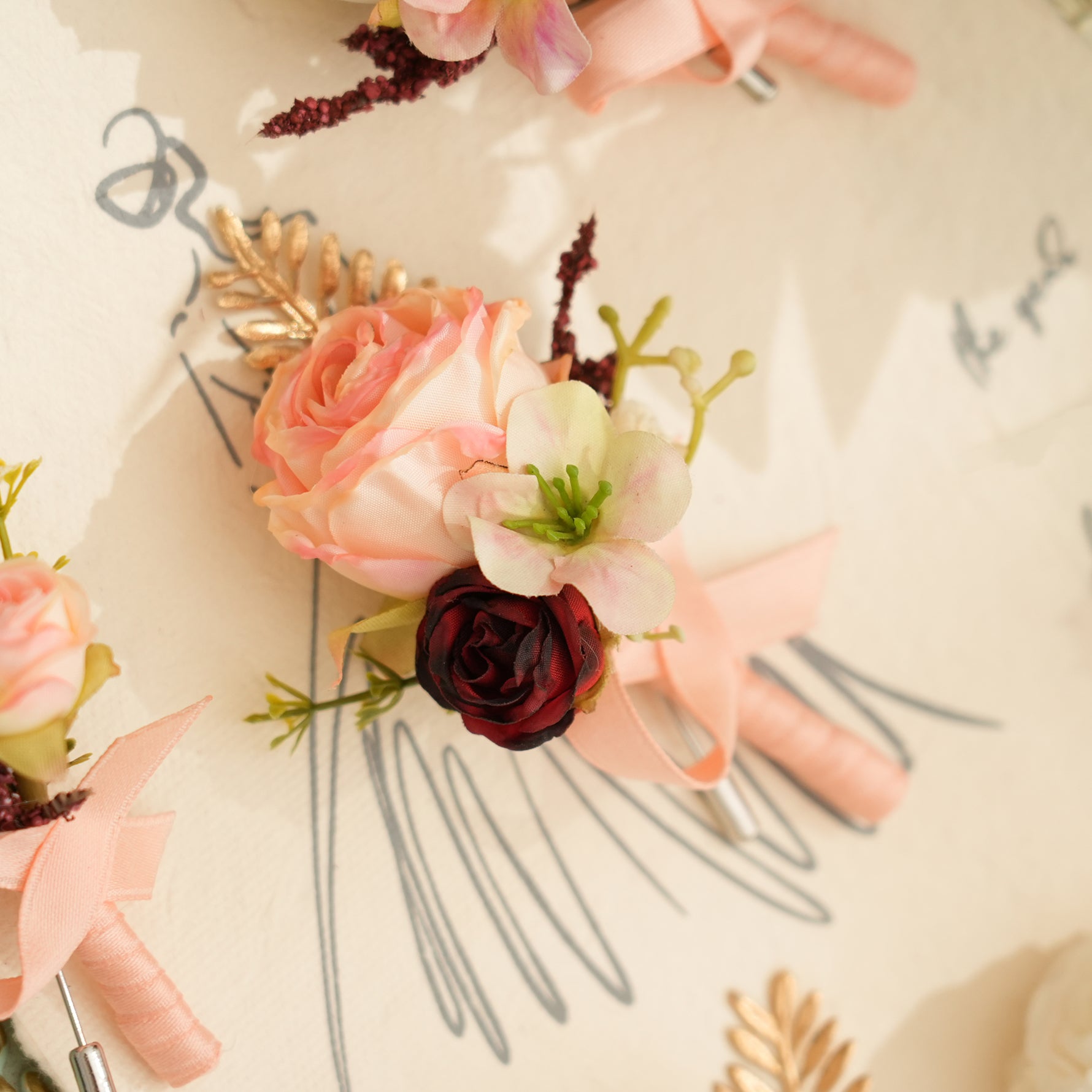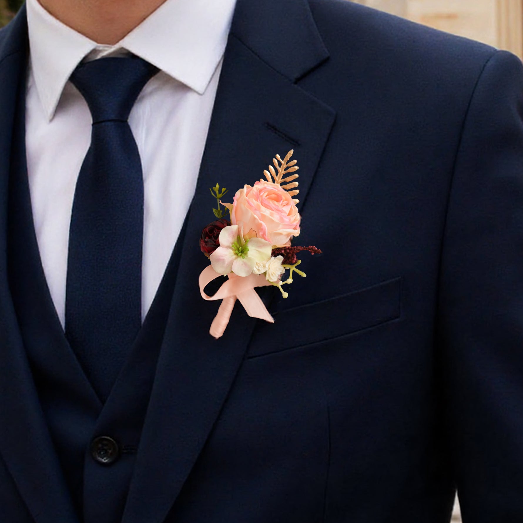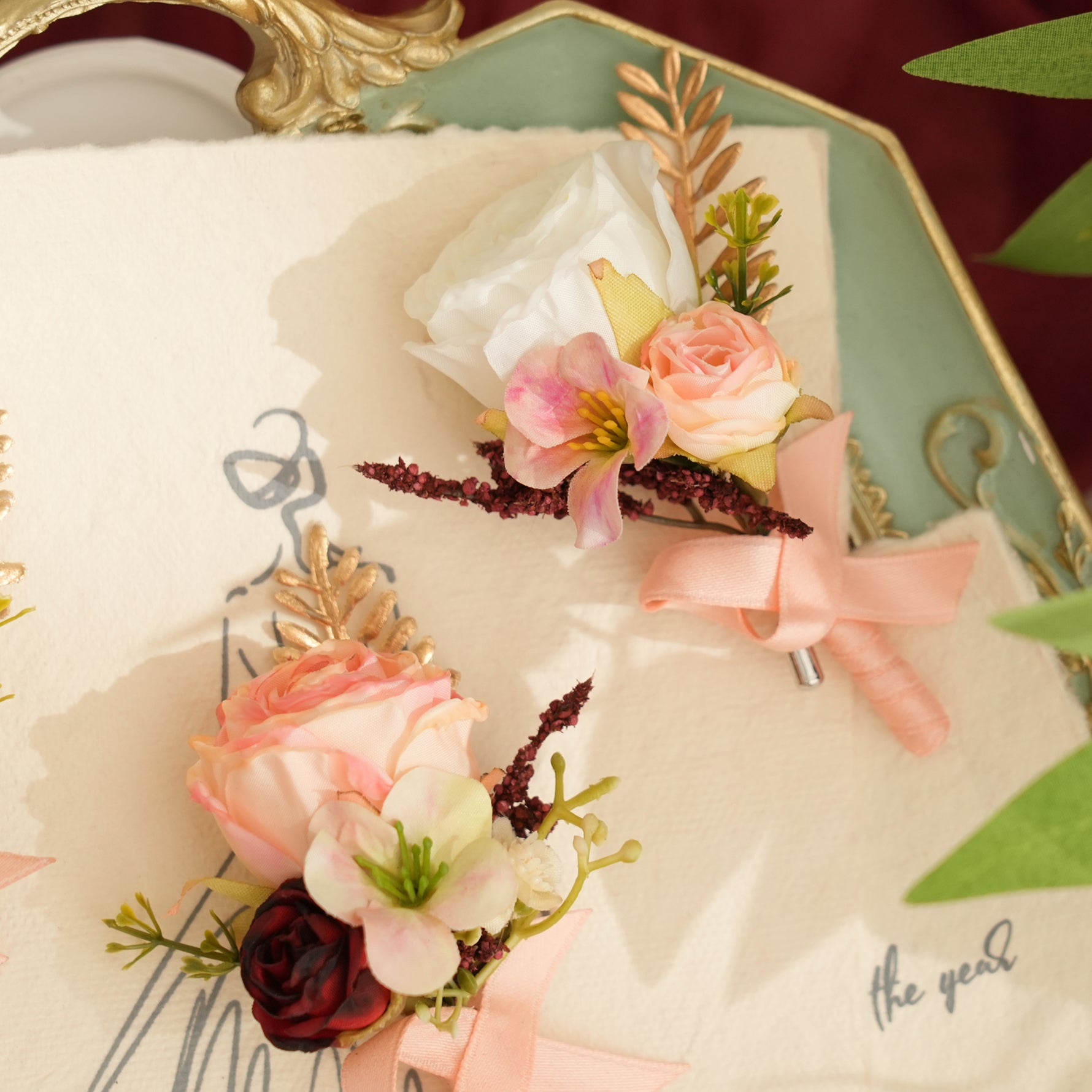 Color Inspiration: Complete the wedding party's look with this elegant 6-piece boutonniere set. Featuring a harmonious blend of classic pink and rich wine-red roses, each piece is crafted with realistic silk flowers and refined faux greenery. Secure and lightweight, they add a cohesive touch of romance and sophistication to suits.