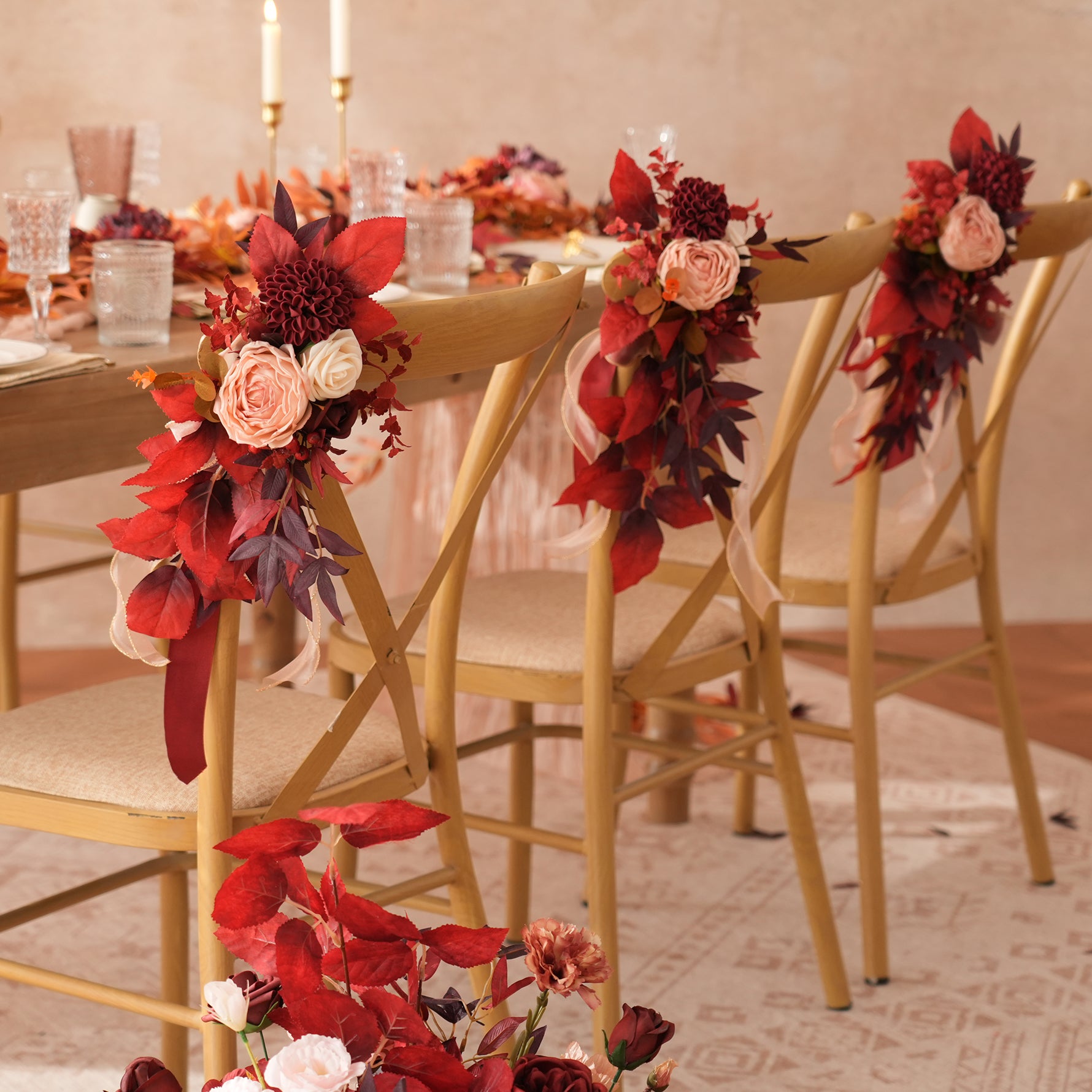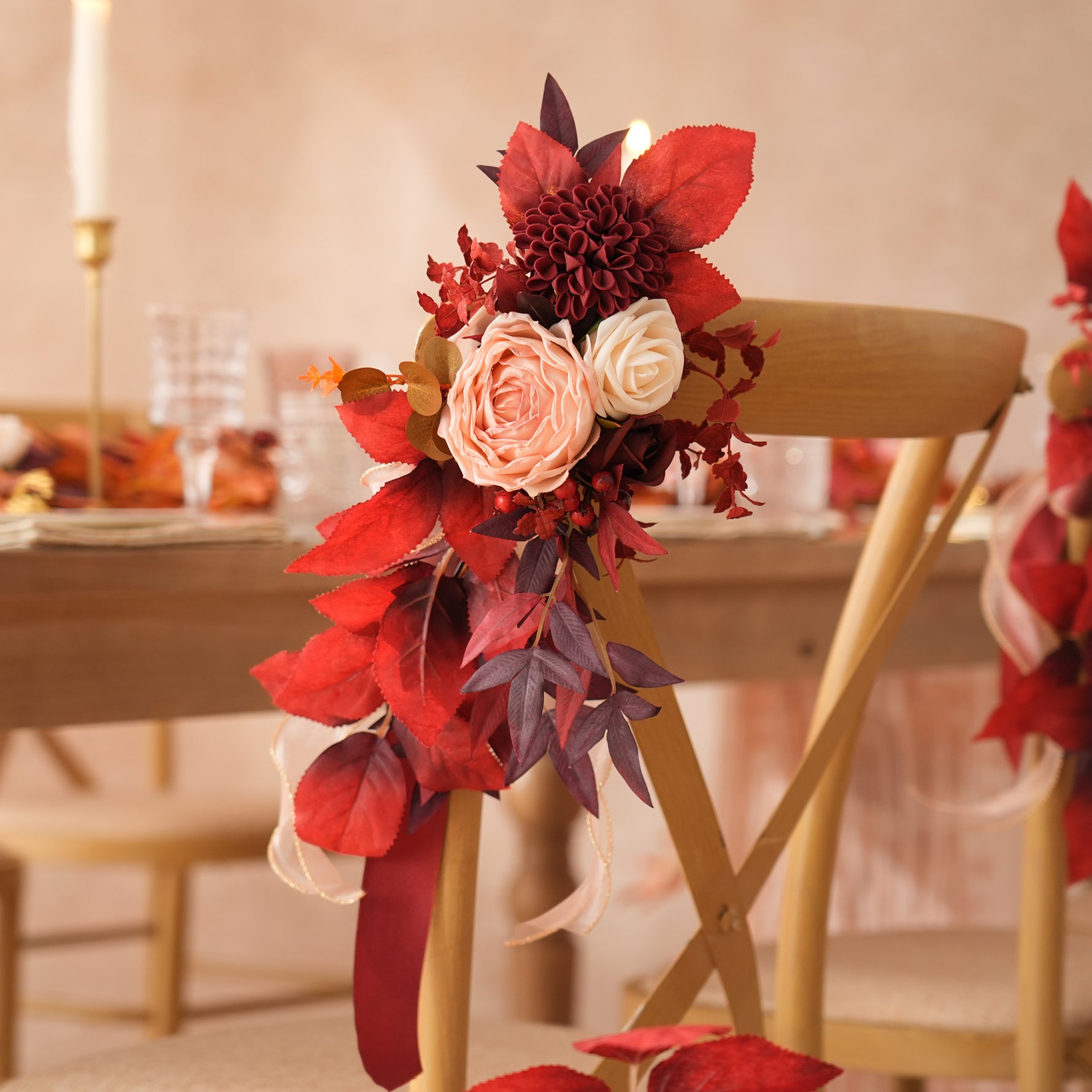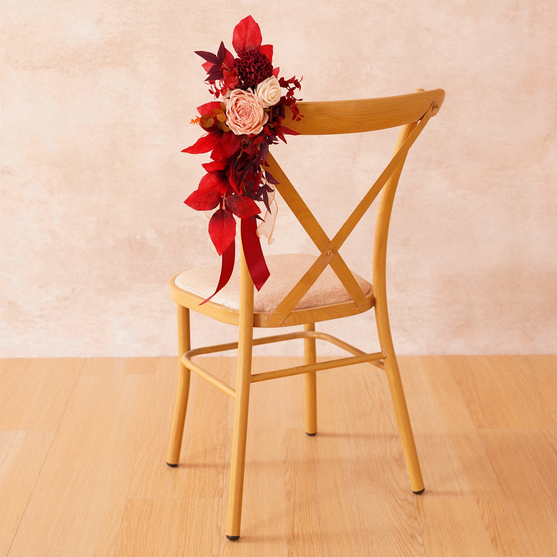 Color Inspiration: Add a romantic and modern touch to your celebration with this 4-piece chair flower set. It features a stylish combination of vibrant red foliage and delicate pink artificial roses, creating a striking contrast. The set offers effortless elegance for decorating chairs at weddings, parties, or garden events.