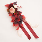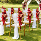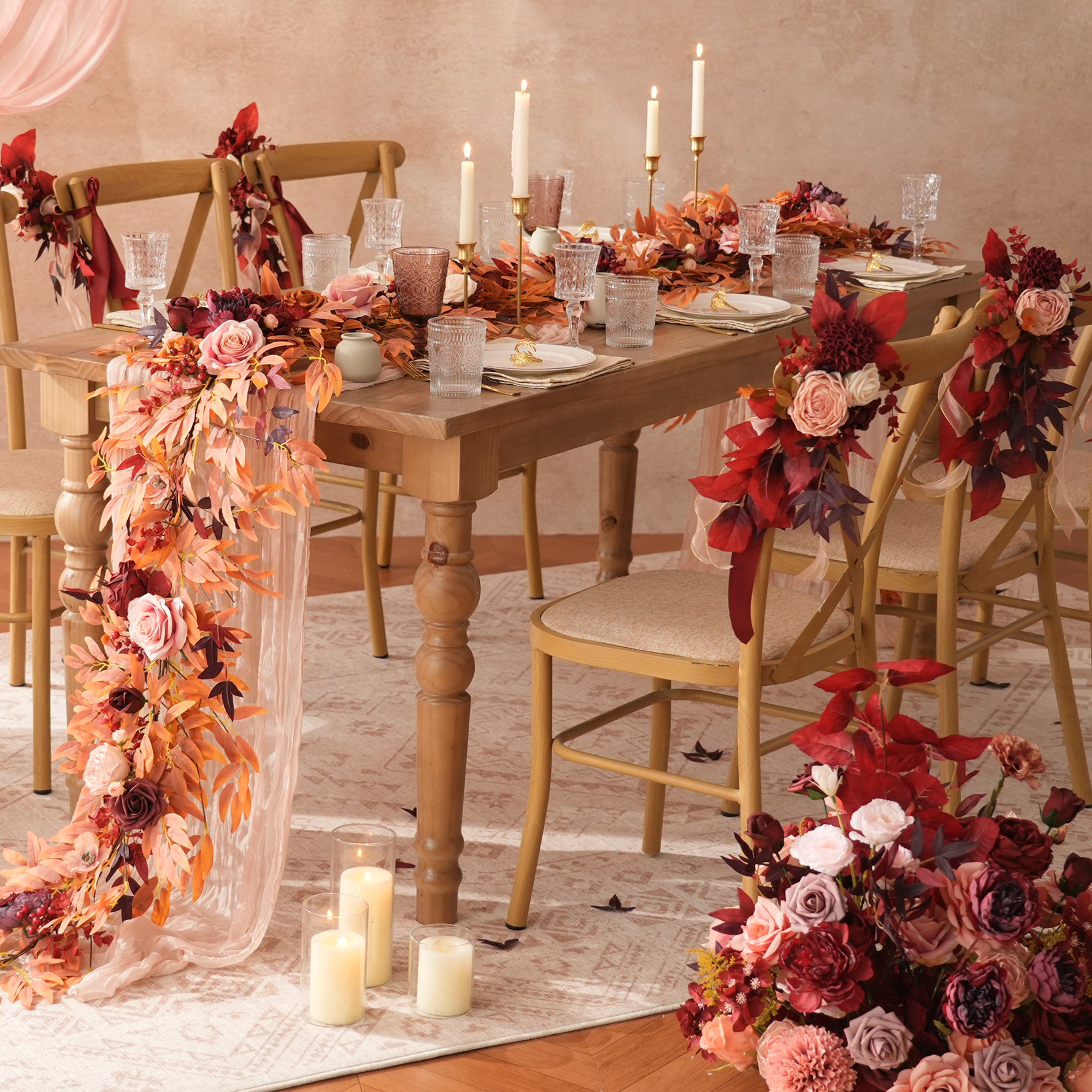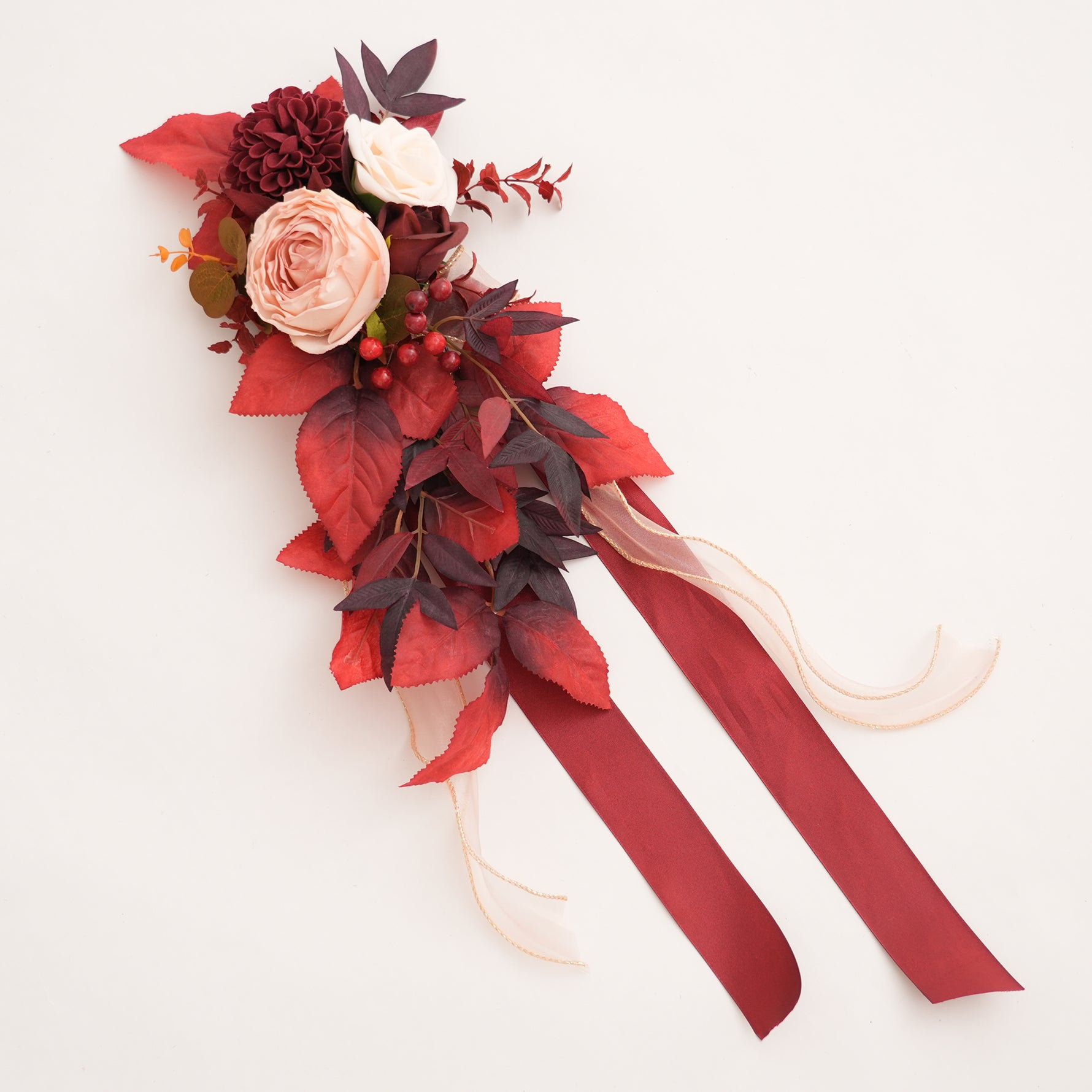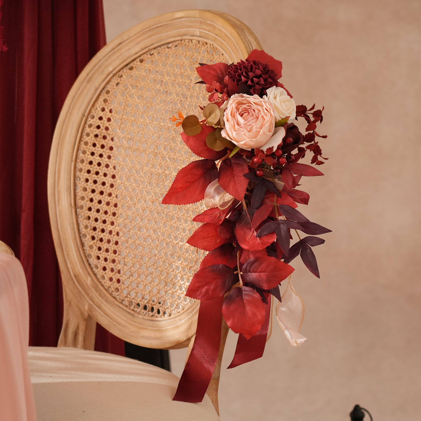 Color Inspiration: Add a romantic and modern touch to your celebration with this 4-piece chair flower set. It features a stylish combination of vibrant red foliage and delicate pink artificial roses, creating a striking contrast. The set offers effortless elegance for decorating chairs at weddings, parties, or garden events.