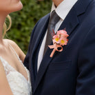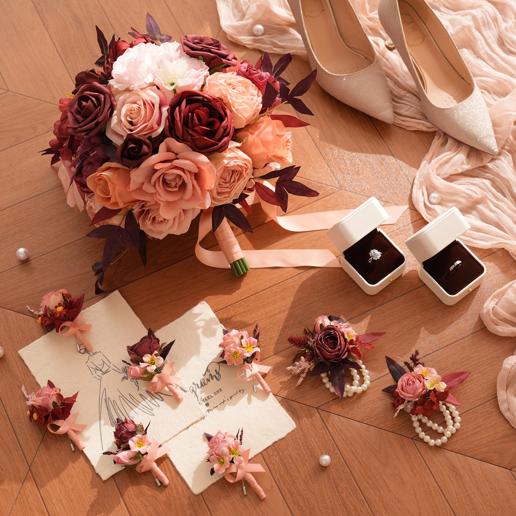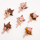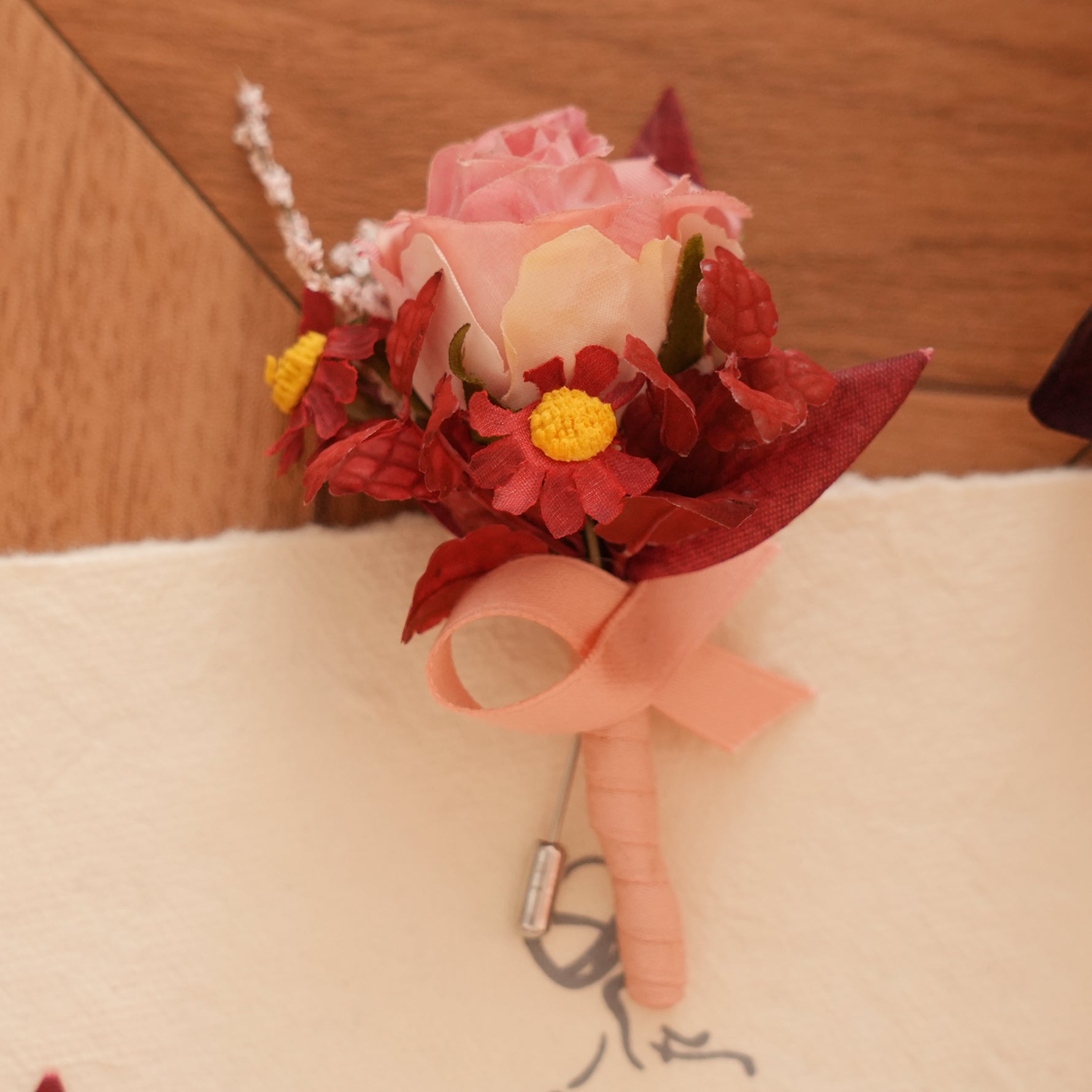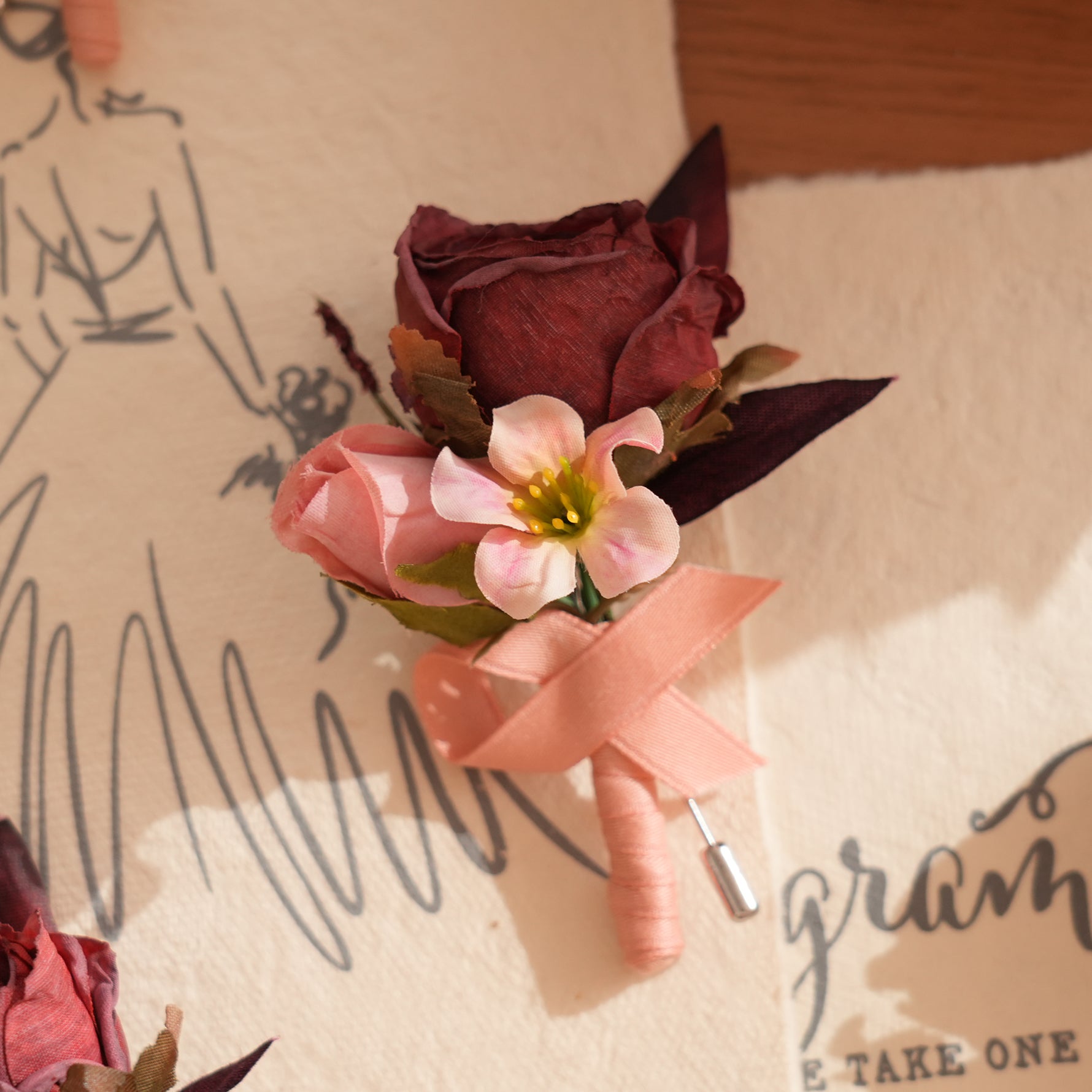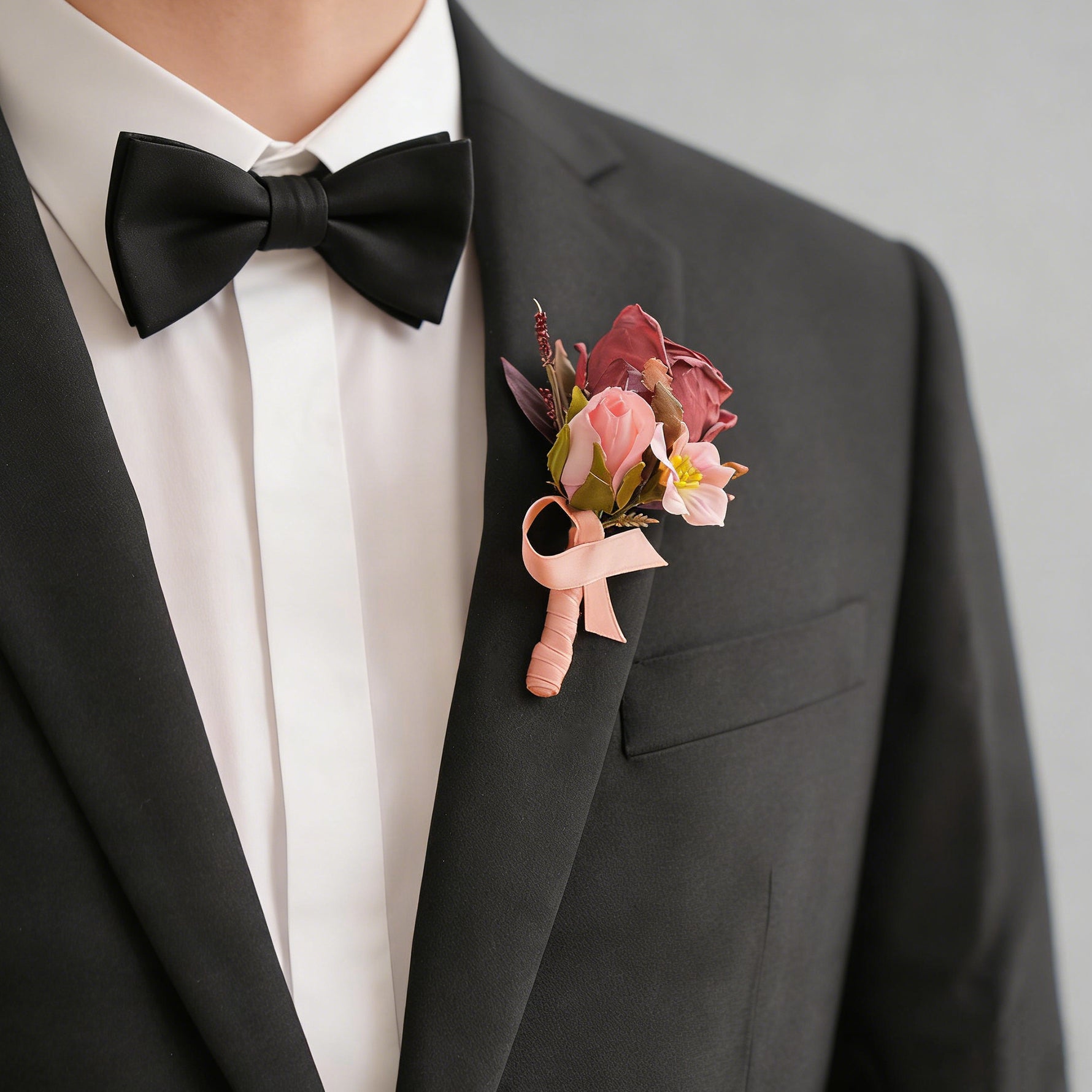 Color Inspiration: This elegant 6-piece groomsmen boutonniere set features beautiful faux roses in classic red and romantic blush pink. Perfect for weddings, each piece is meticulously crafted with lifelike petals, soft greenery, damage-free attachment.