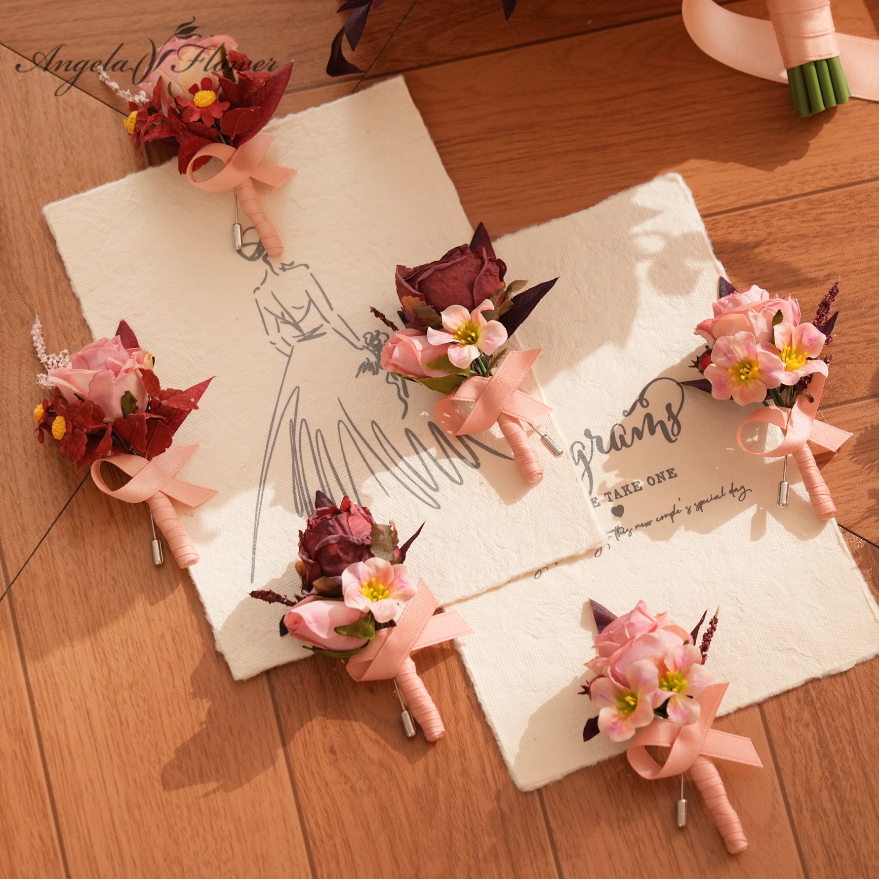 A9063 6pcs/set Artificial Pink Red Rose Boutonniere Set Corsage Flower Wedding Supplies
