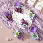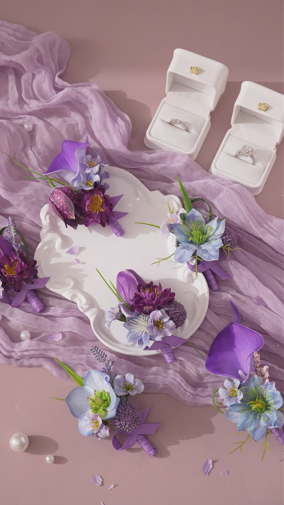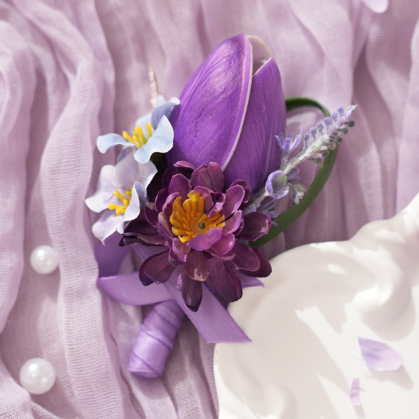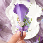 Color Inspiration: Elevate your wedding party's style with our 6-piece set of purple tulip and calla lily boutonnières. These elegant floral accents feature realistic, handcrafted blooms. The sophisticated purple hue complements various suit colors, adding a touch of refined charm.