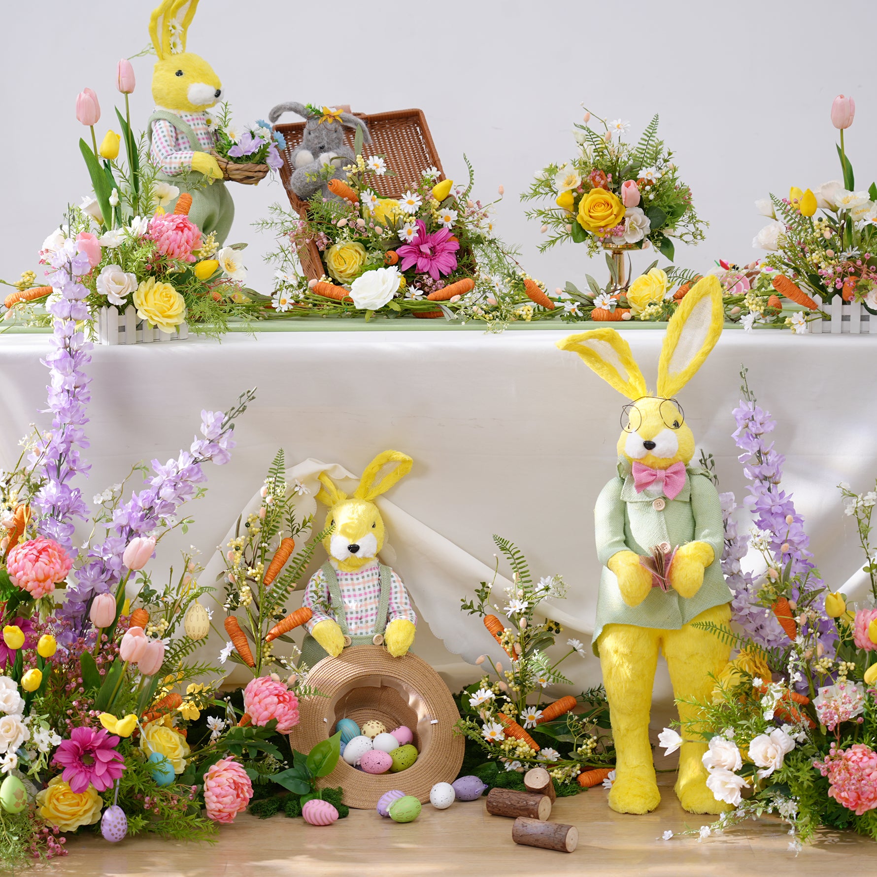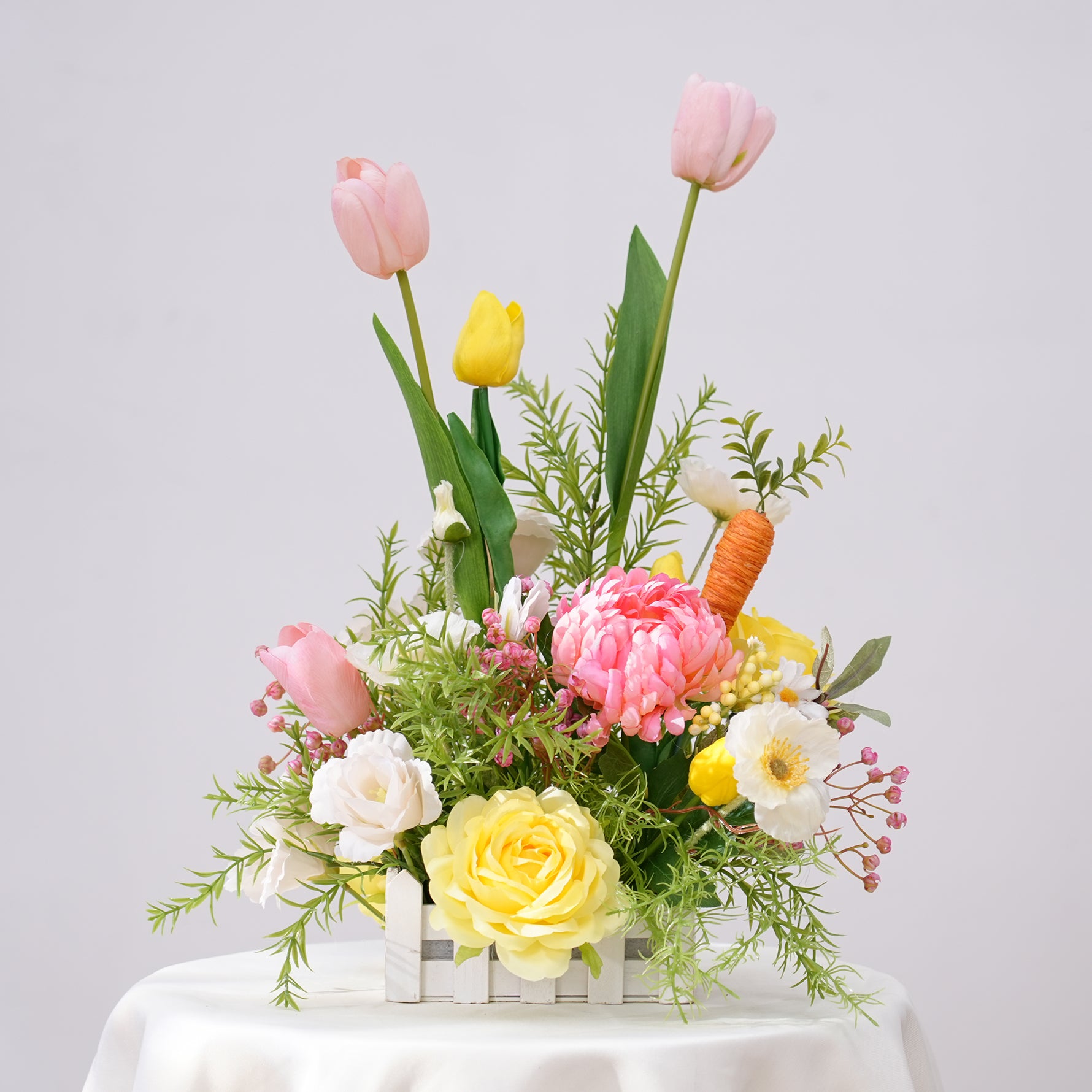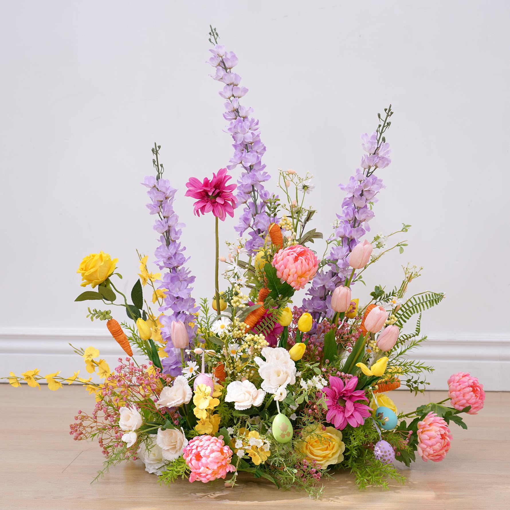 Color Inspiration: Flower arrangement consisting of various colorful flowers with cute radish decorations in lively and cute Easter tones, meet all your Easter dress up needs and give you a memorable Easter party.