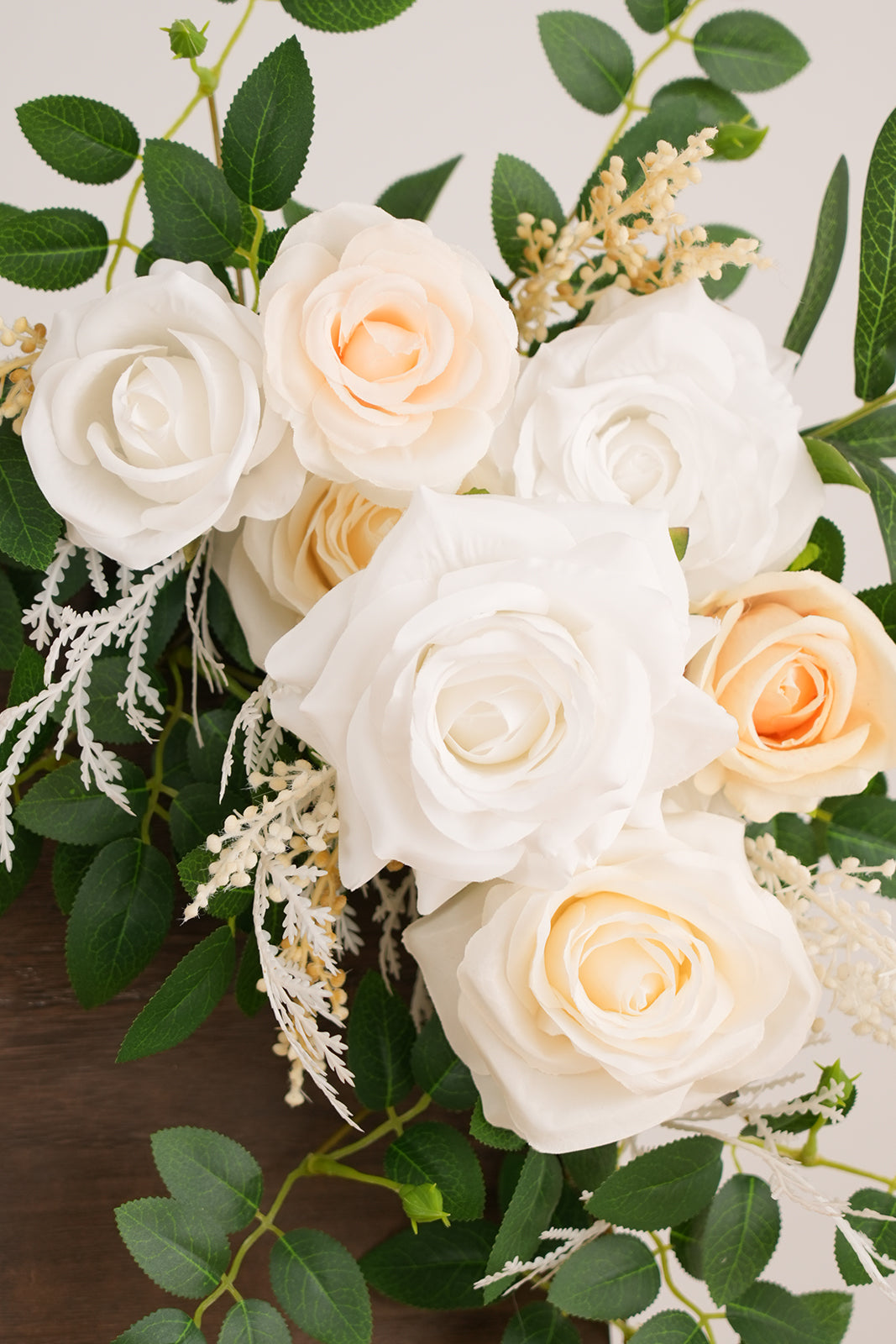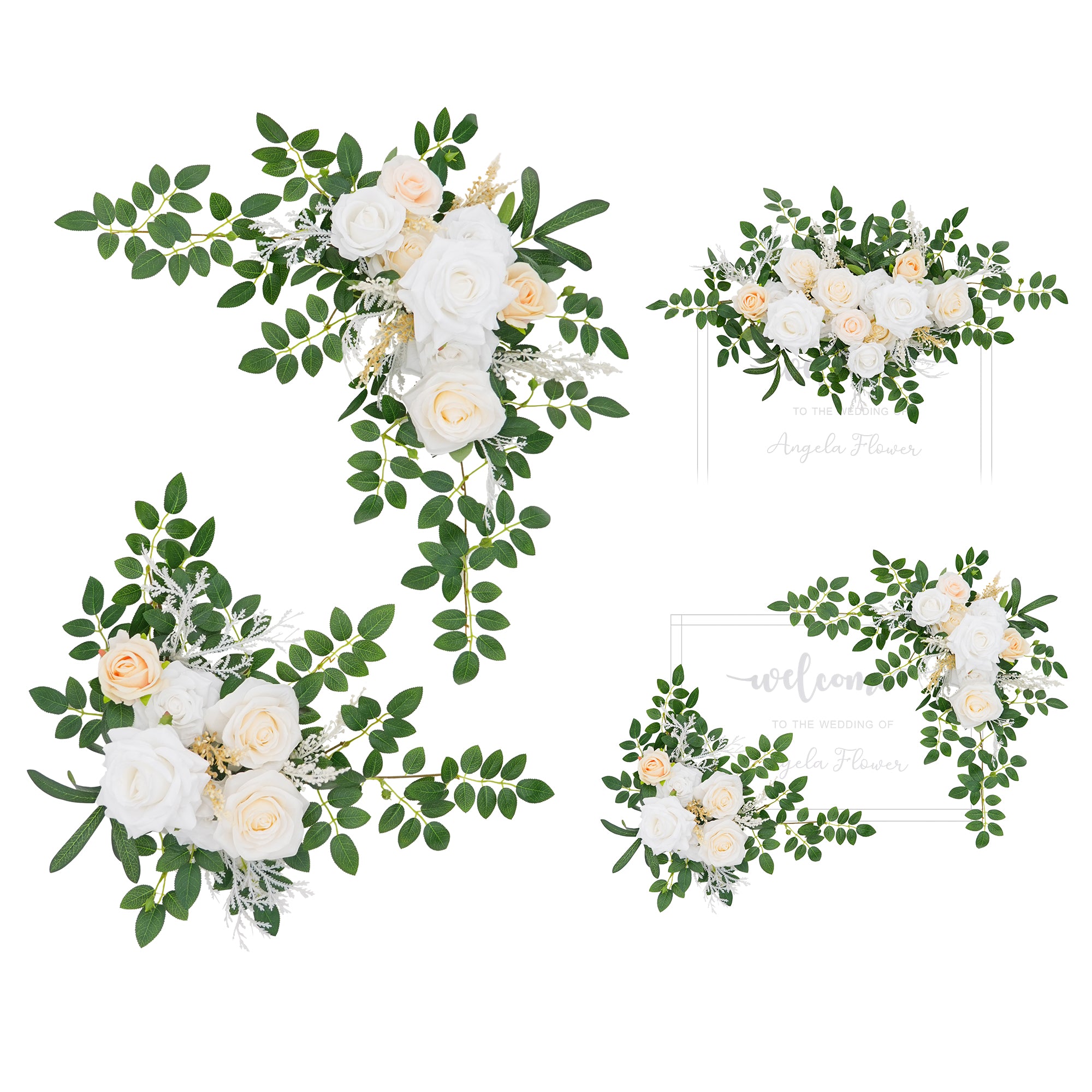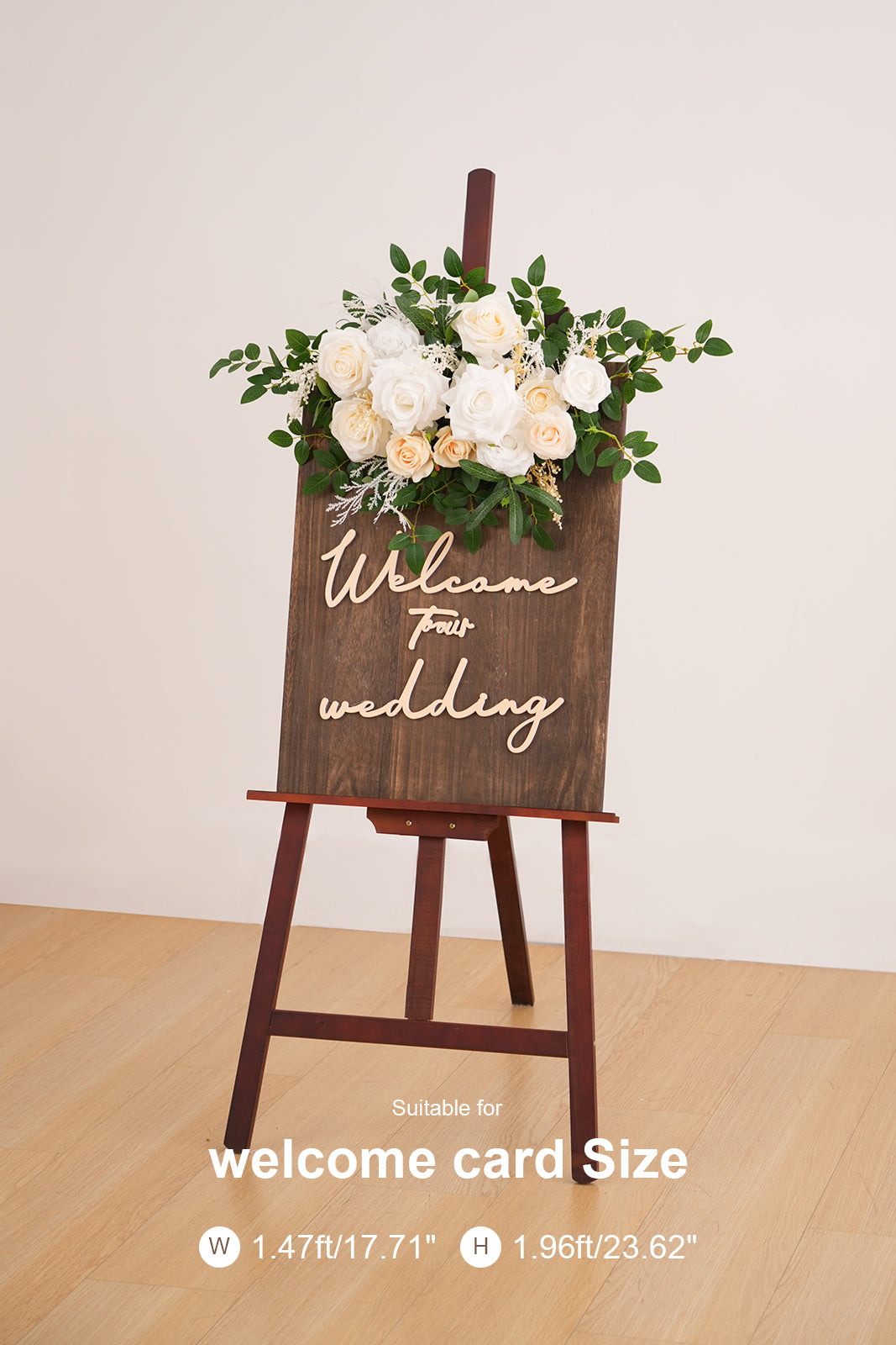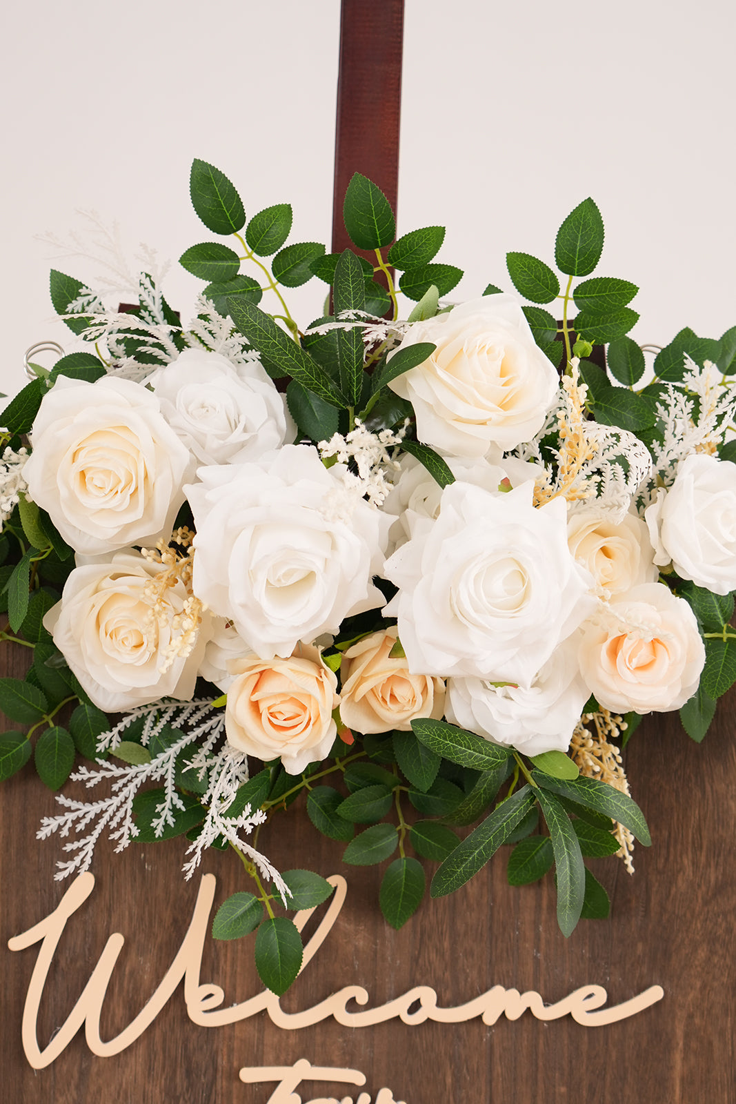 Color Inspiration: Create a picture-perfect wedding entrance with our champagne white rose welcome sign flower. This versatile floral decor piece is ideal for welcome signs, arches, and more. The classic color palette of champagne and white complements any wedding theme, bringing a touch of elegance to your celebration. Easy to attach, it provides a simple yet stunning way to enhance your venue.