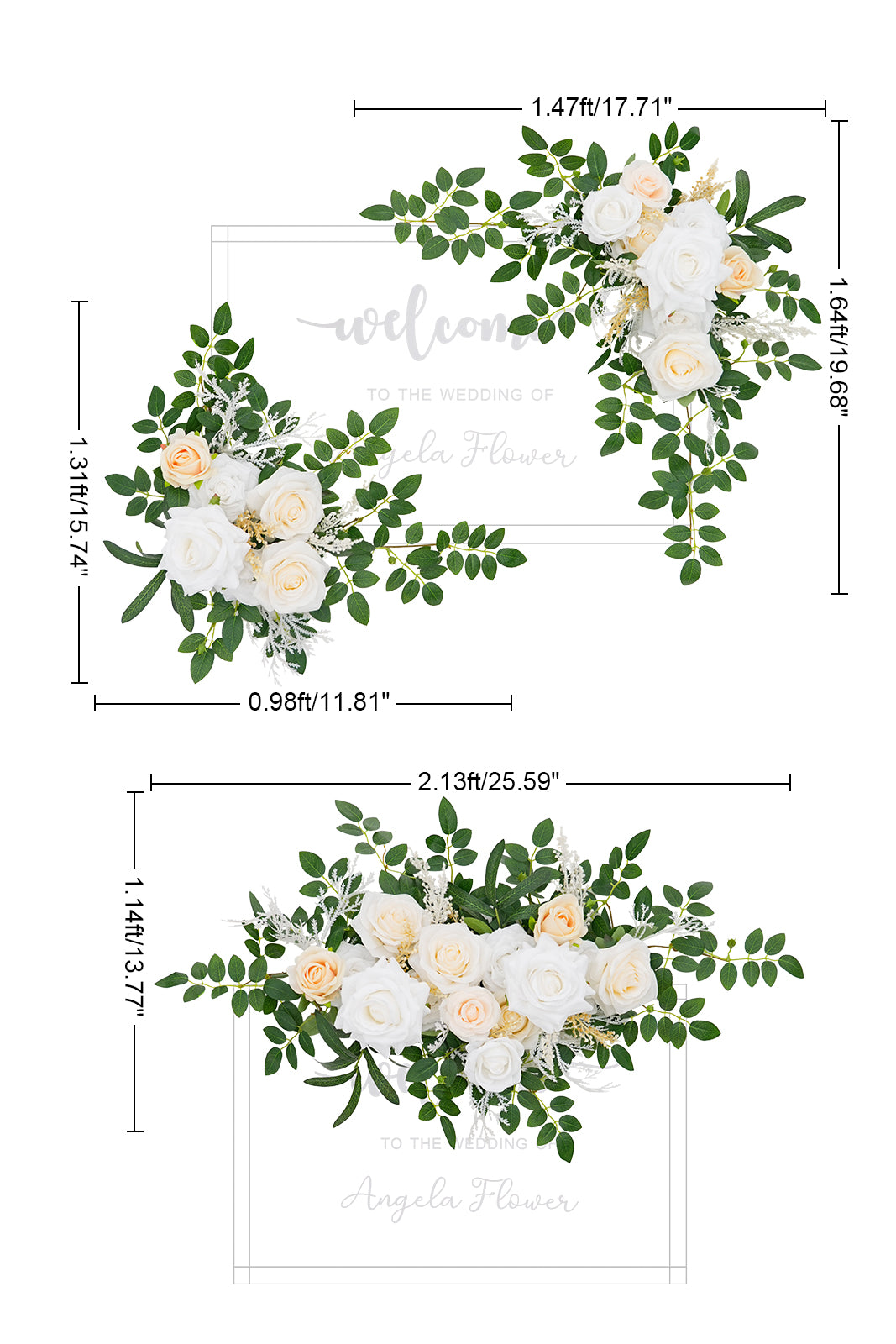 Size: Two artificial flowers can be merged and used together, or they can be used separately, depending on what you like. After the two flowers are combined, the approximate dimensions are 25'' by 13''. One flower corner swag design measures about 19.6"L x 17.7" W, another flower tie measures 15.7"L x 11.8" W. Fits decorative board/easel/panels 18-24 inches long and 12-18 inches wide.