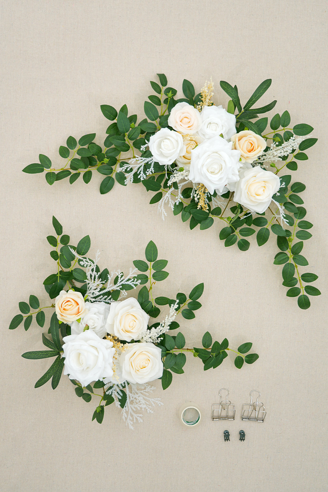 Package: Pre-fabricated flower swag x 2 metal clips x2, green plastic clip x2, double-sided tapex1 (not include wooden sign & stand).