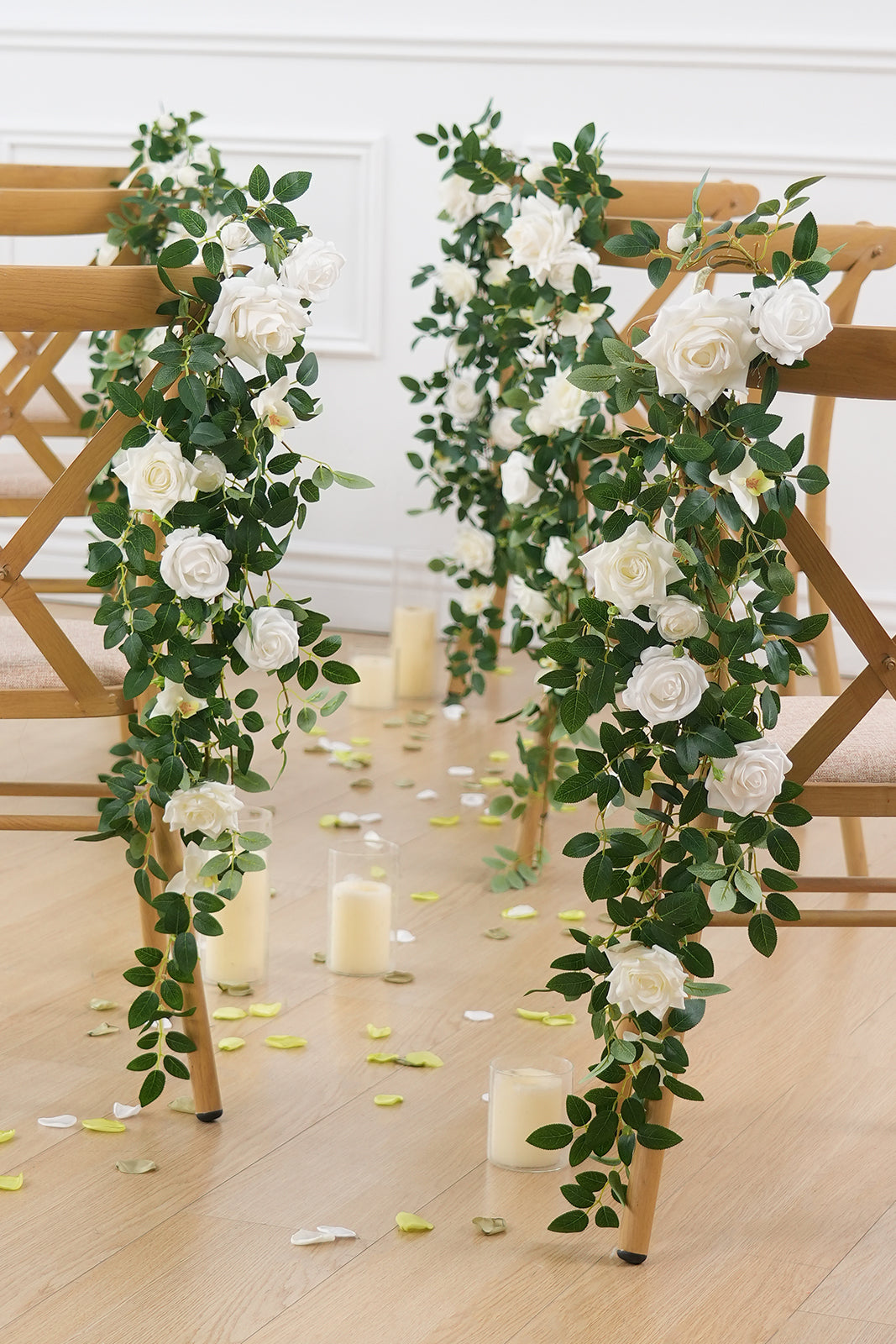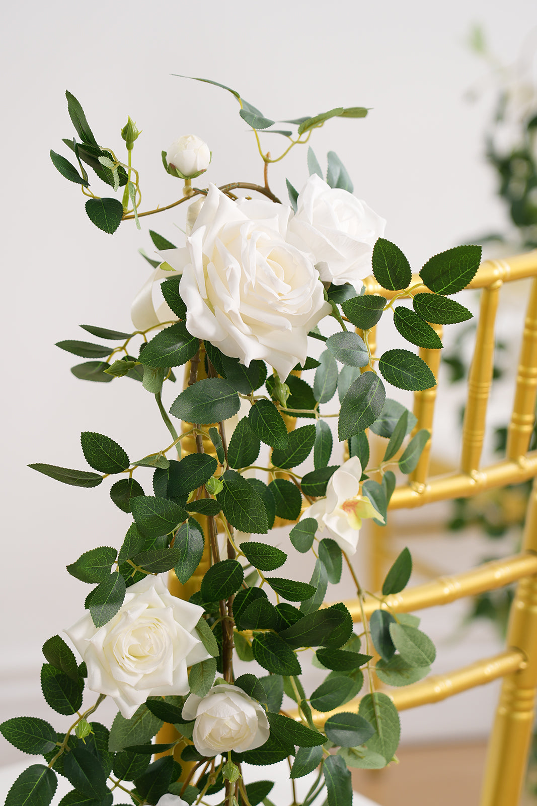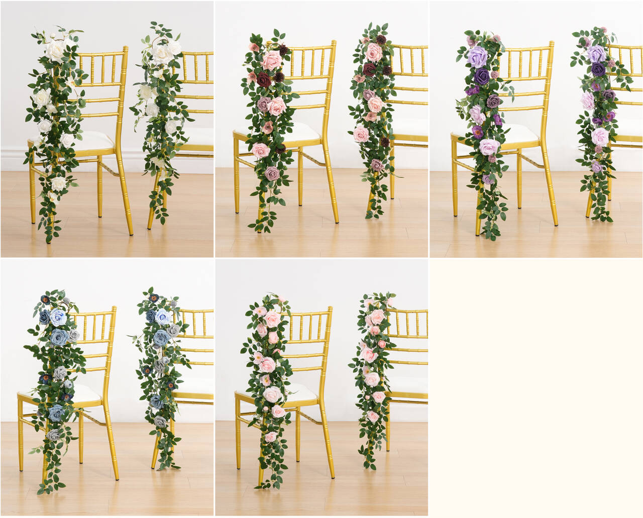Color Inspiration: Adorn your reception with our exquisite Chair Flower Set! This 4-piece collection, handcrafted by professional florists, features silk roses, rose buds, foam roses, real touch orchids, and verdant rose vines. The rich layers and realistic texture present a romantic and exquisite visual feast. For an added touch of natural elegance, complement these chair decorations with our eucalyptus garland wedding decorations for reception.