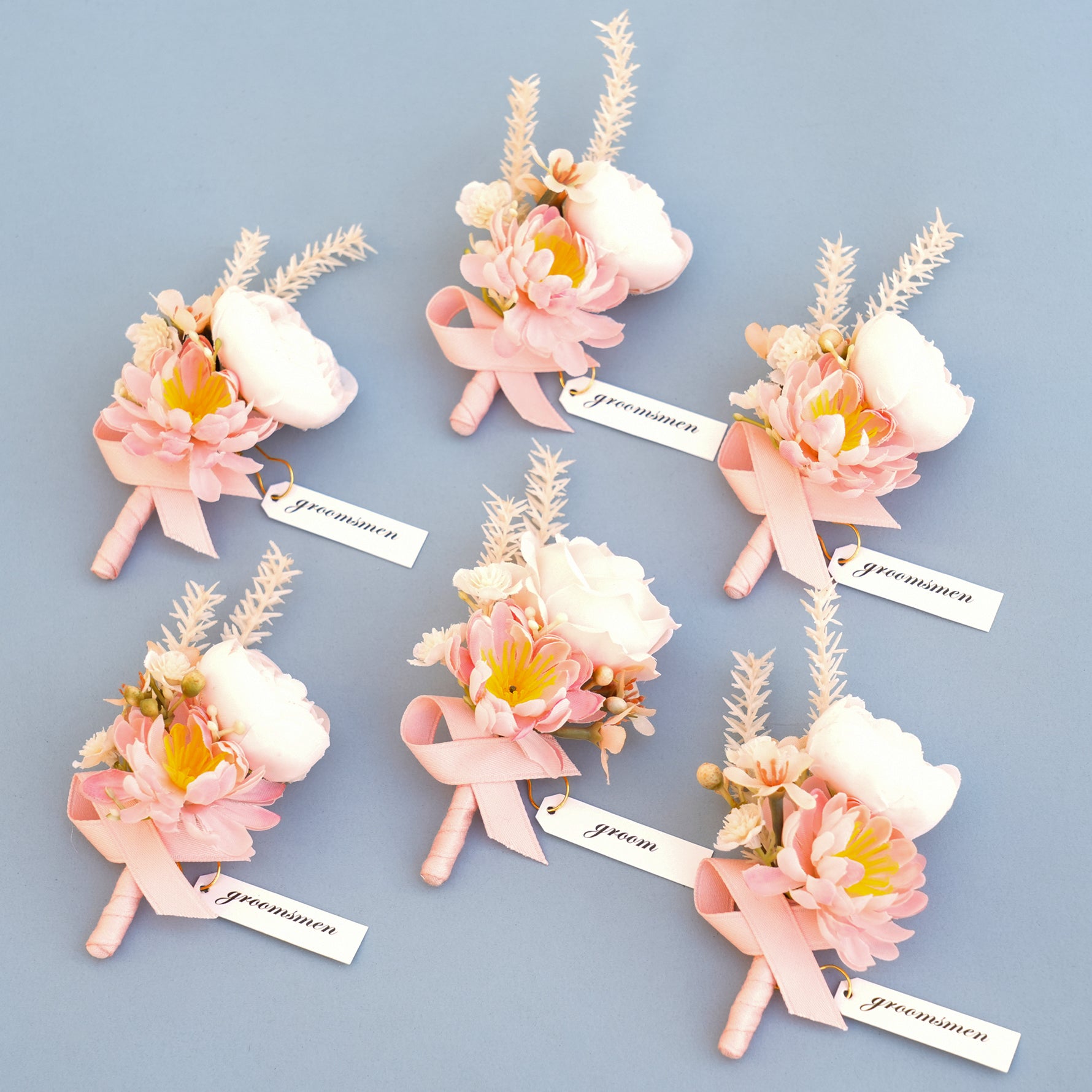 A9007 6pcs Artificial Pink Corsages Set Wedding Anniversary Celebration Props