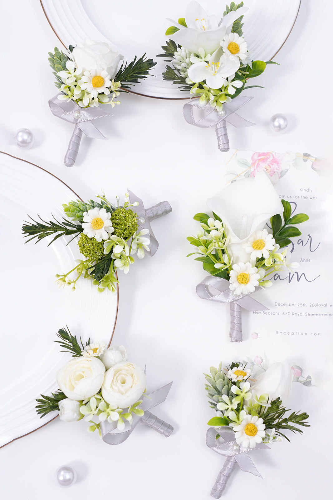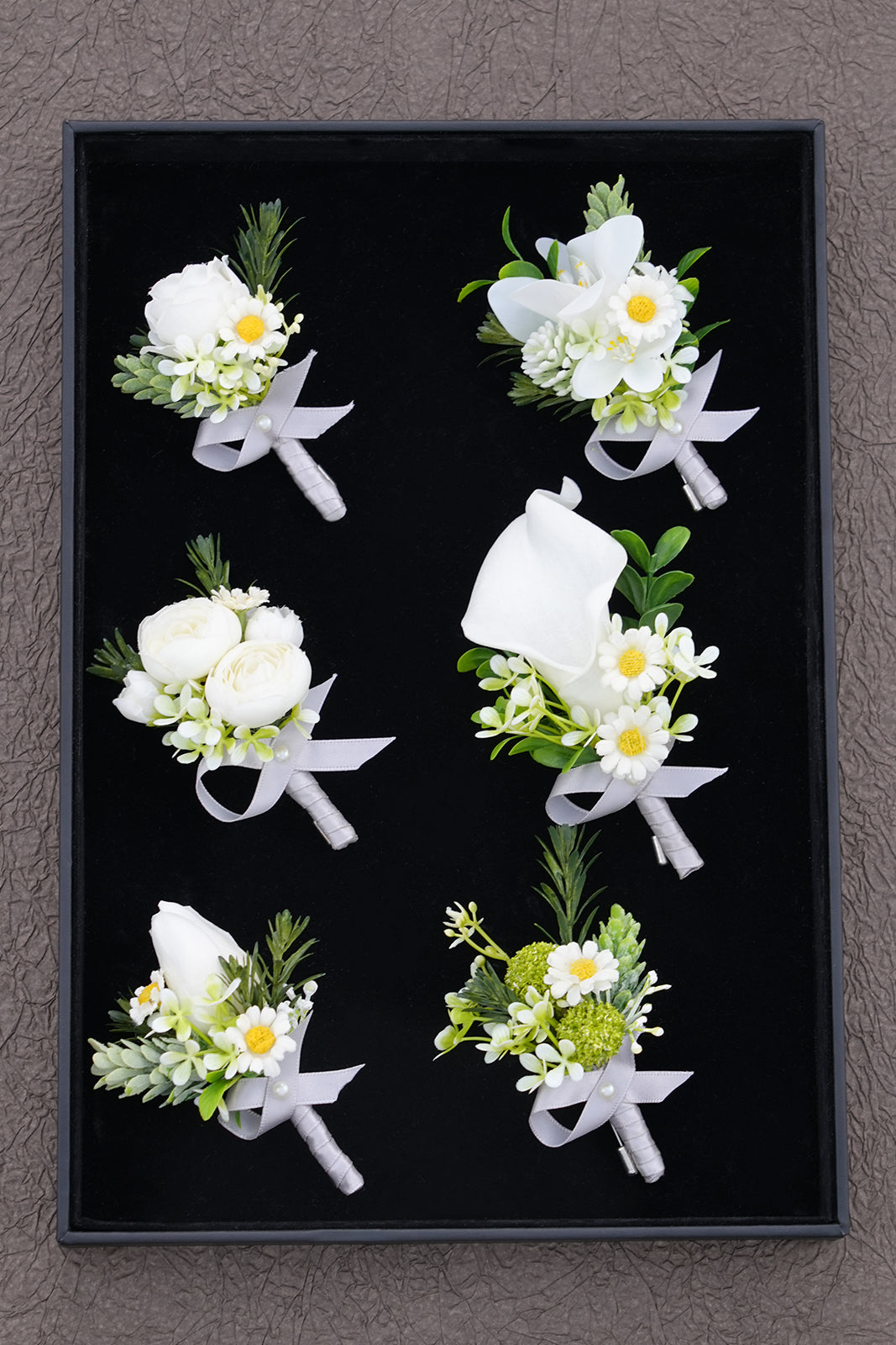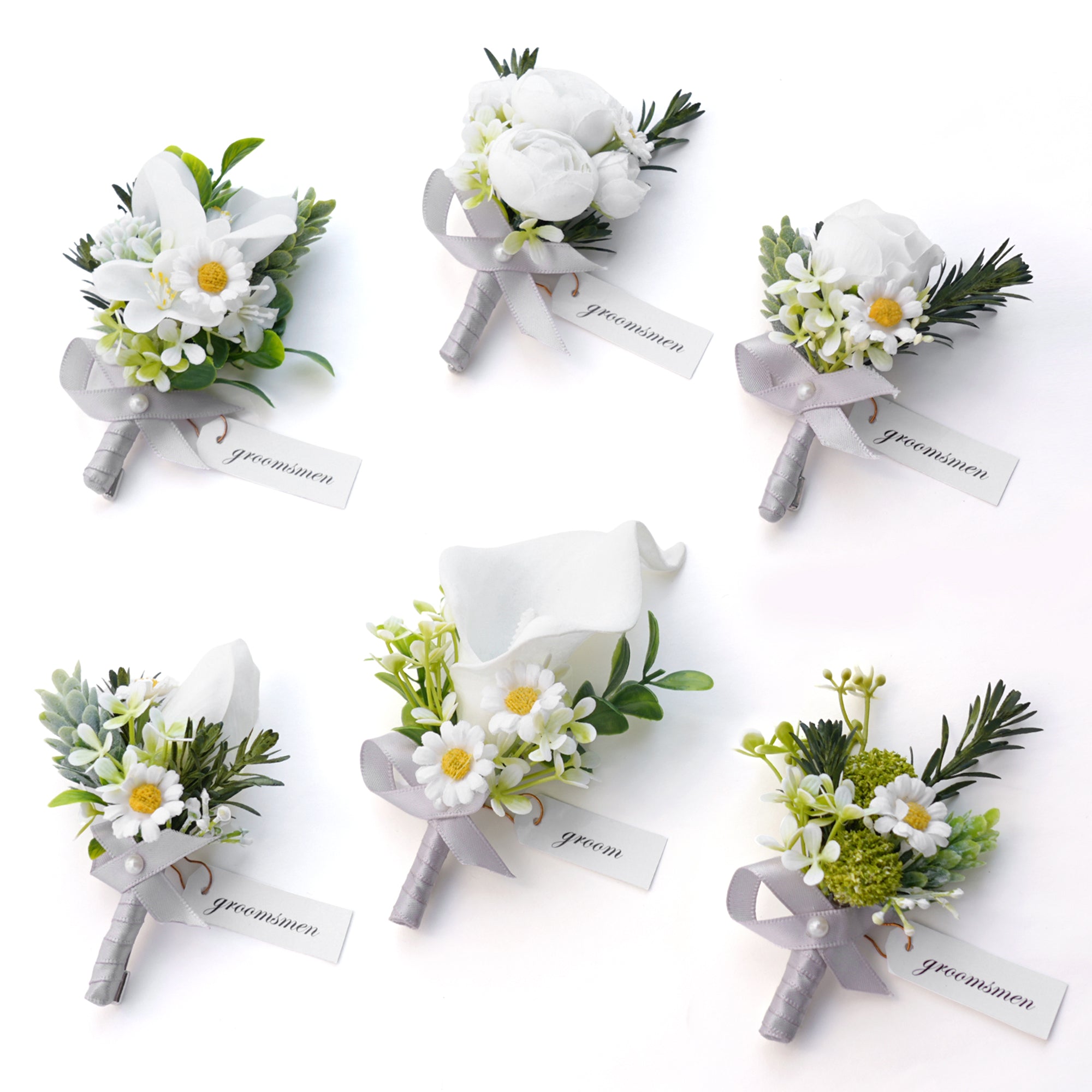 A8978 6pcs/set White Daisy Greenery Corsage Flowers Bridegroom Event Accessories