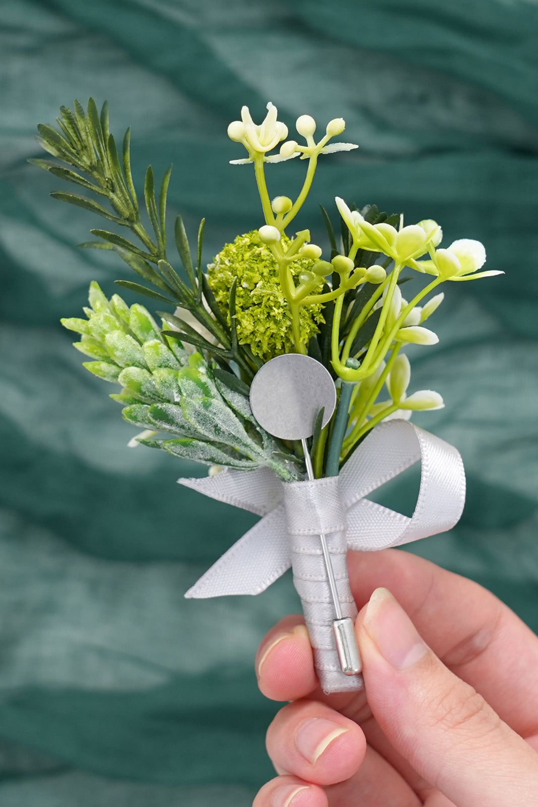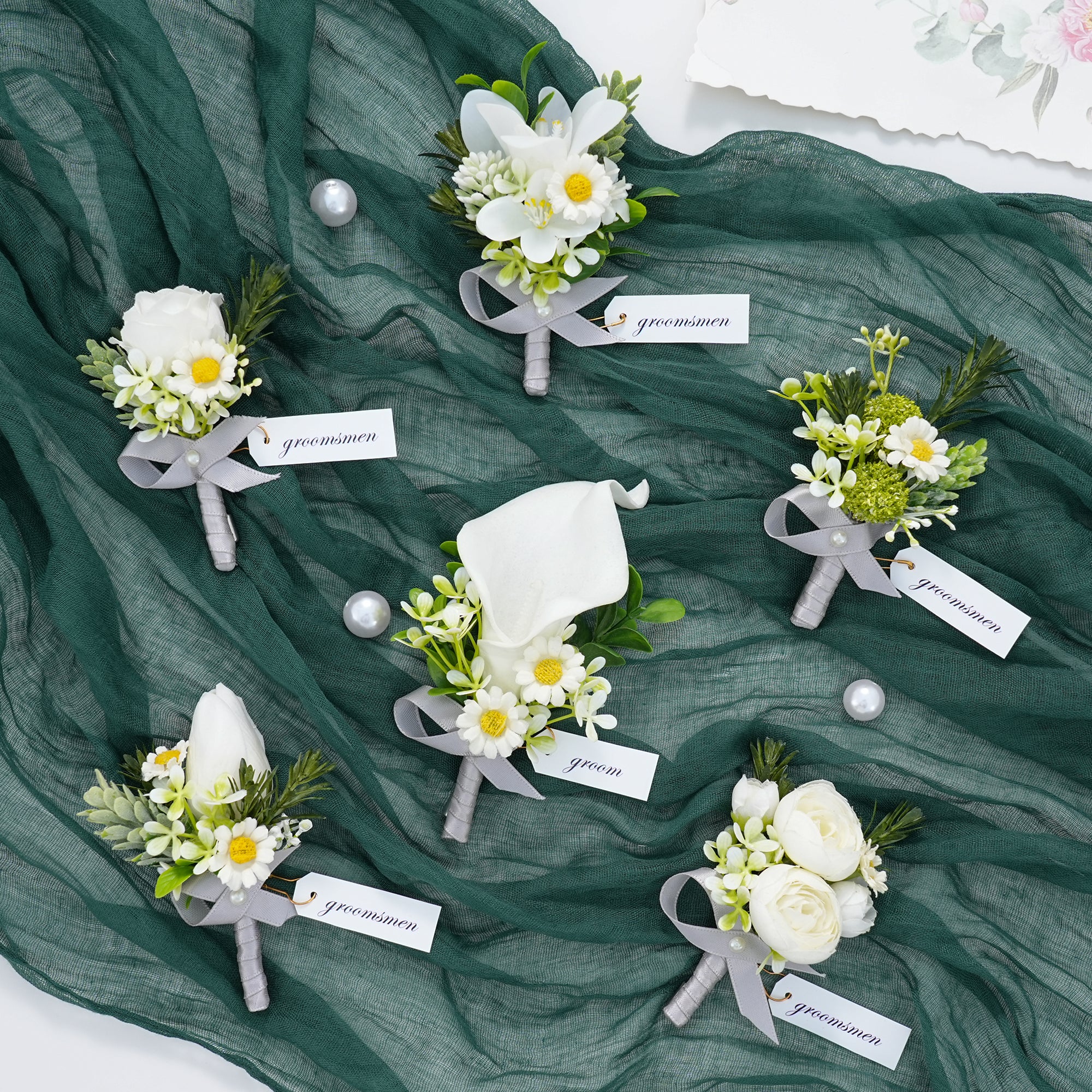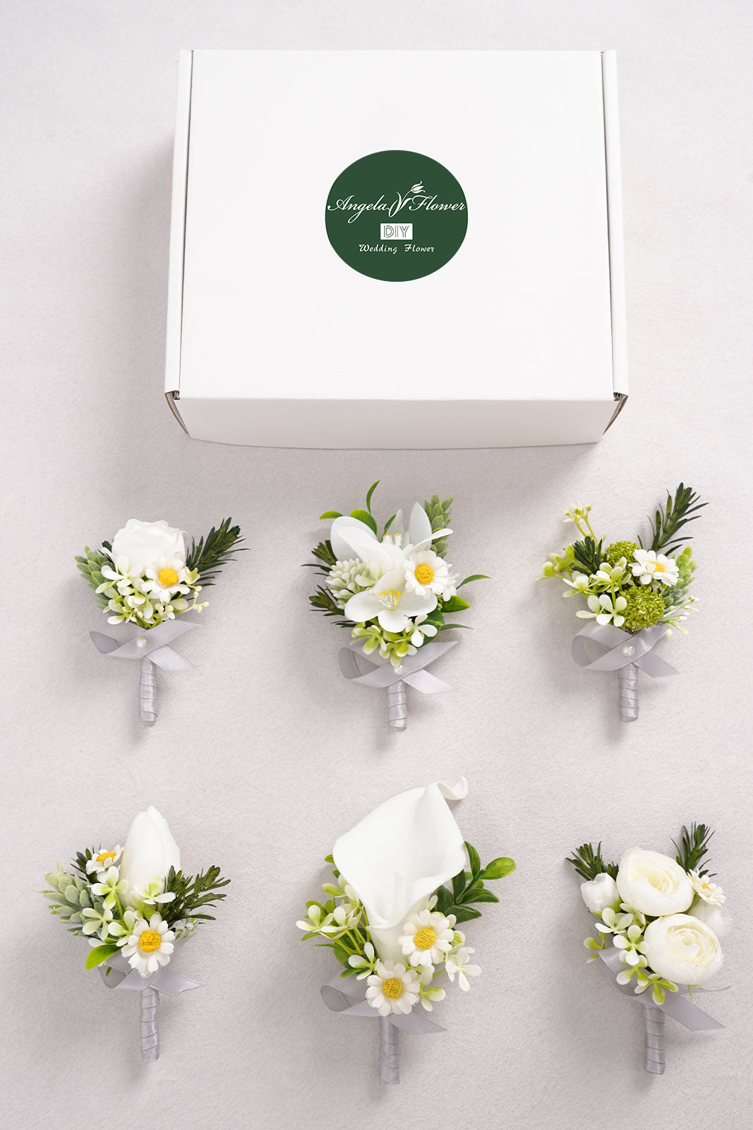 Size and package: Each boutonniere is approx. 3.1'' W x 3.9'' H, suitable for all men; The set includes six boutonnieres in total, with 6 different styles. 1 for Groom, and others for groomsmen or any important guest.