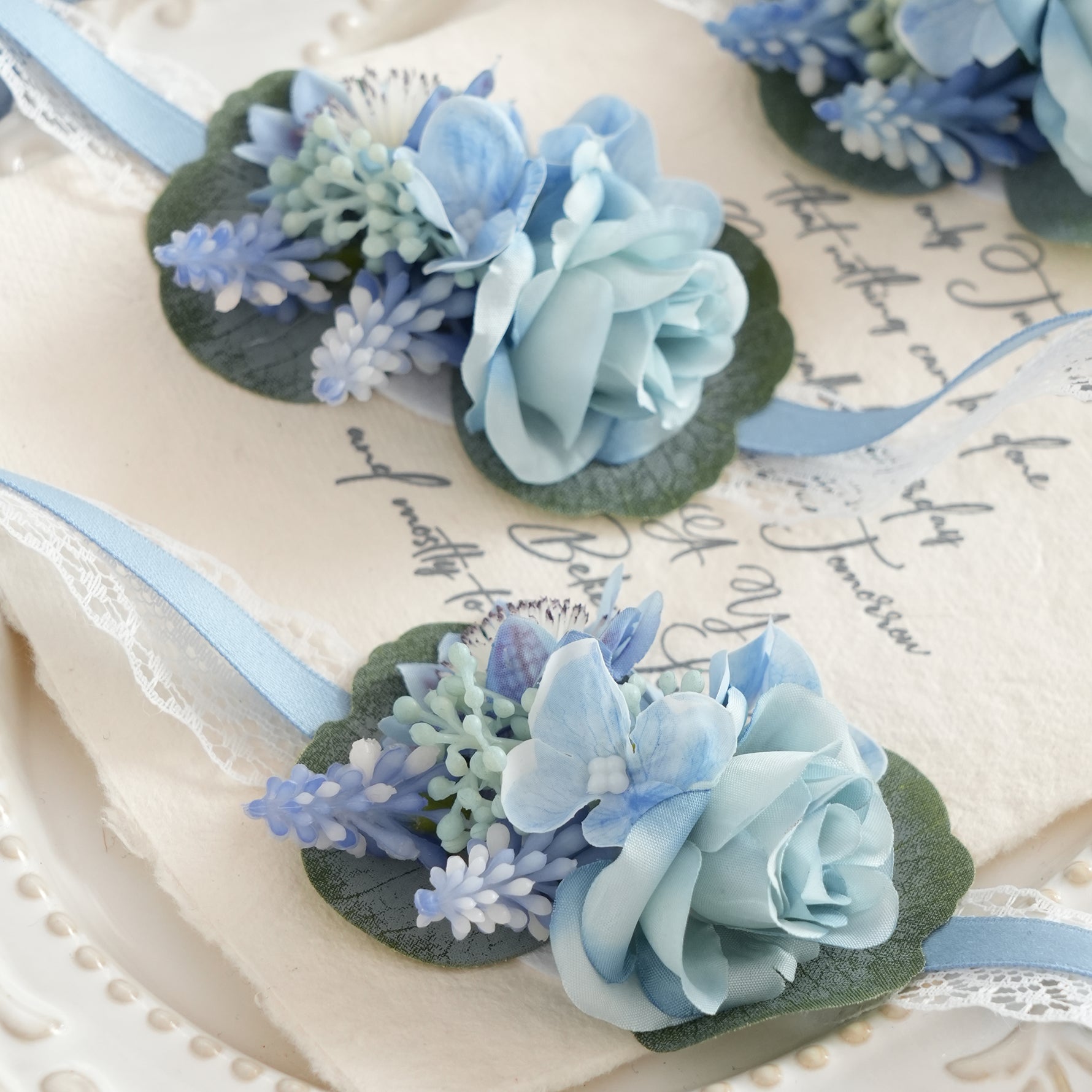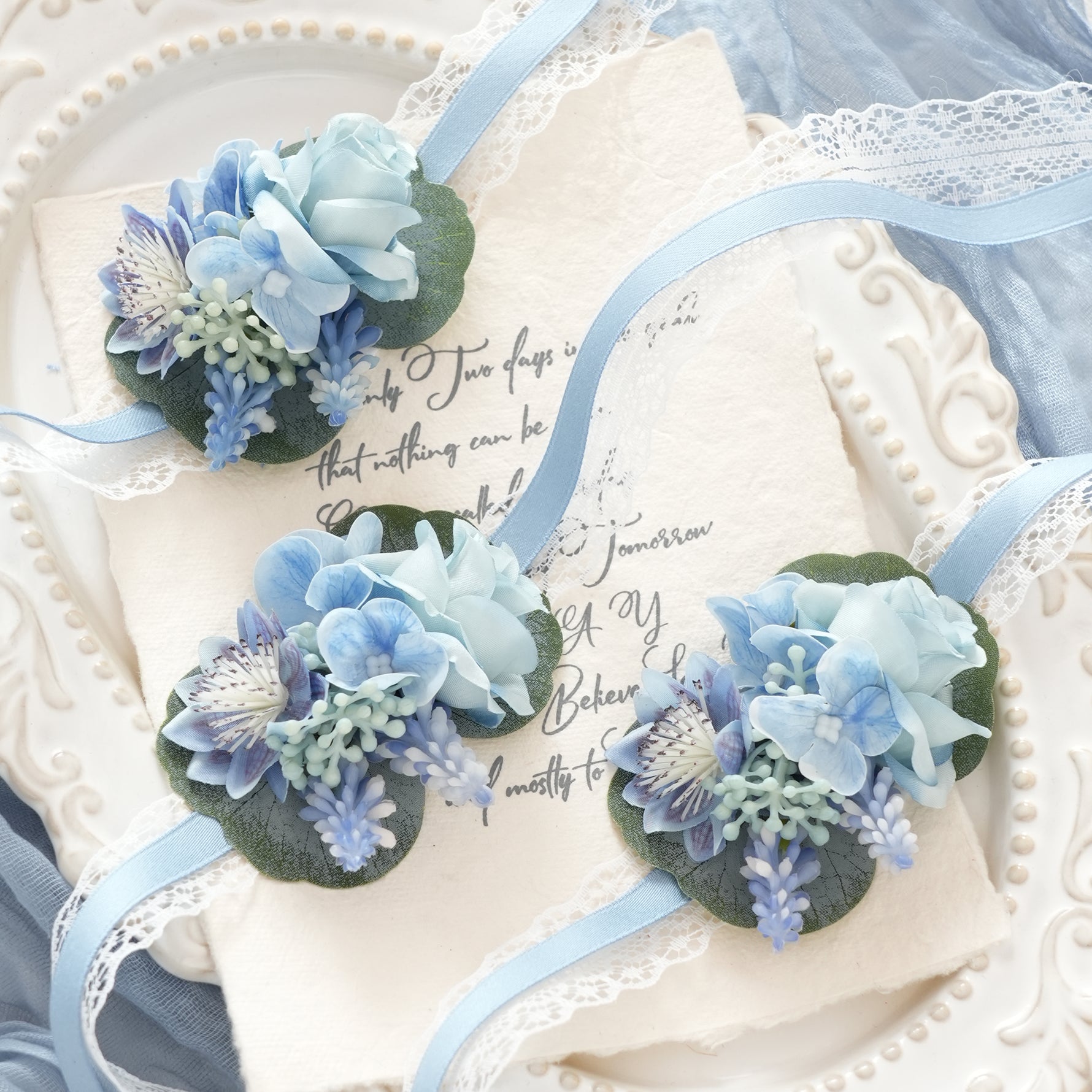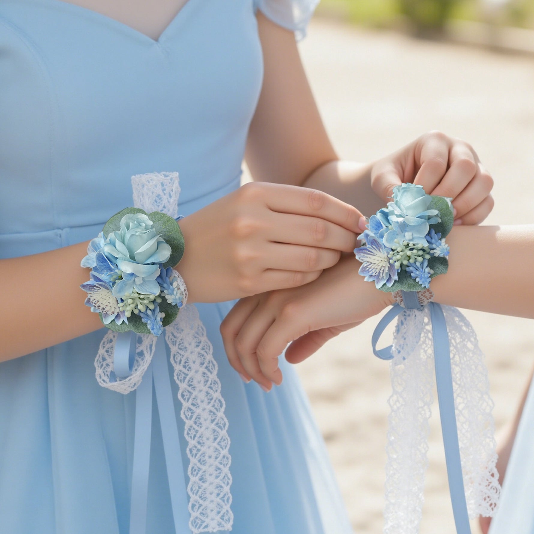 Color Inspiration: Immerse in this serene 2-piece wrist corsage set. This cool-toned elegance adds a touch of sophisticated freshness to any formal occasion, perfect for weddings, proms, and bridal parties.