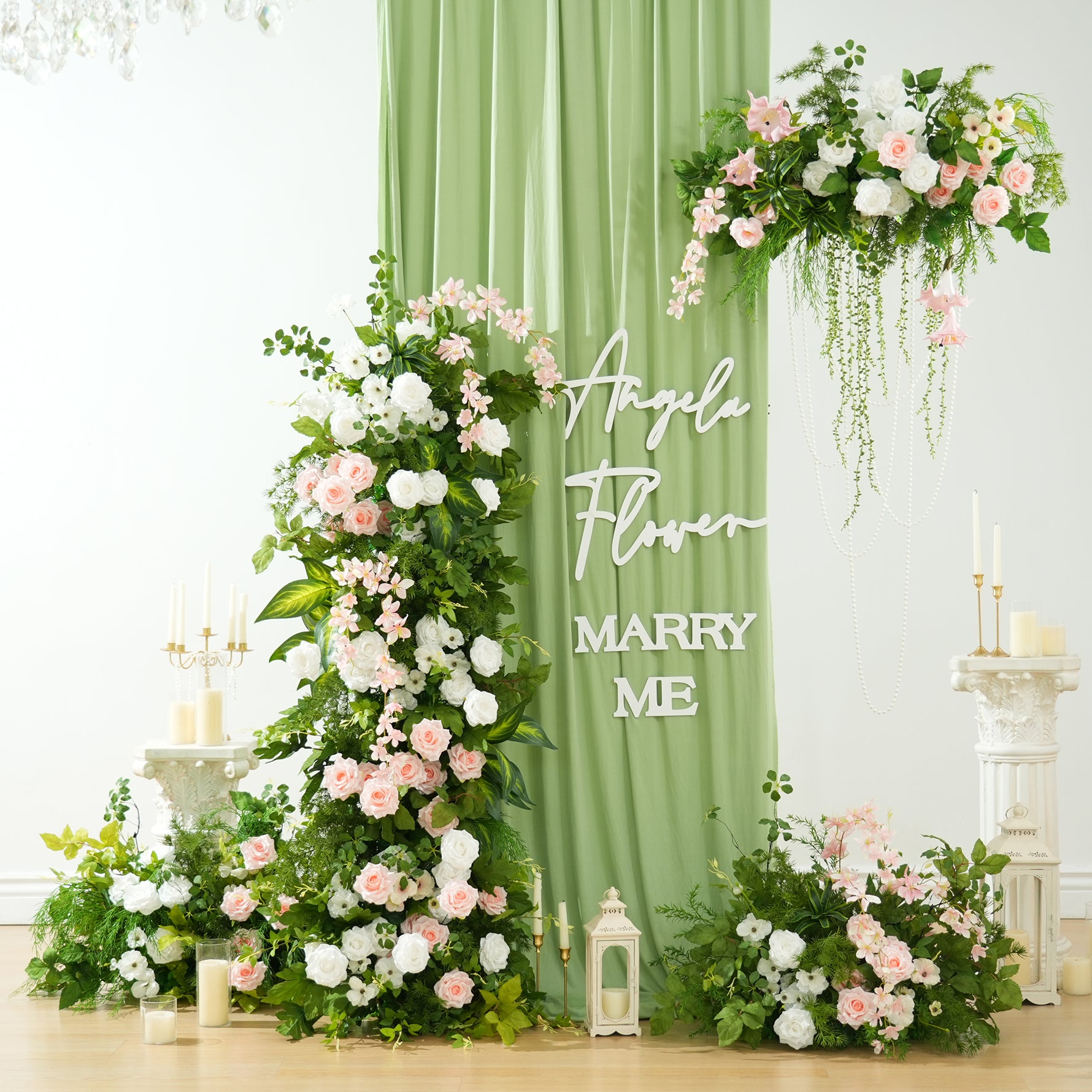 Color Inspiration: Transform any aisle or space with our artificial flowers. This elegant collection features a soft blend of light pink and white blooms, accented by lush greenery. Perfect for weddings, events, or home décor, these faux botanicals add a touch of natural beauty without the hassle. Durable and reusable, they offer long-lasting charm.