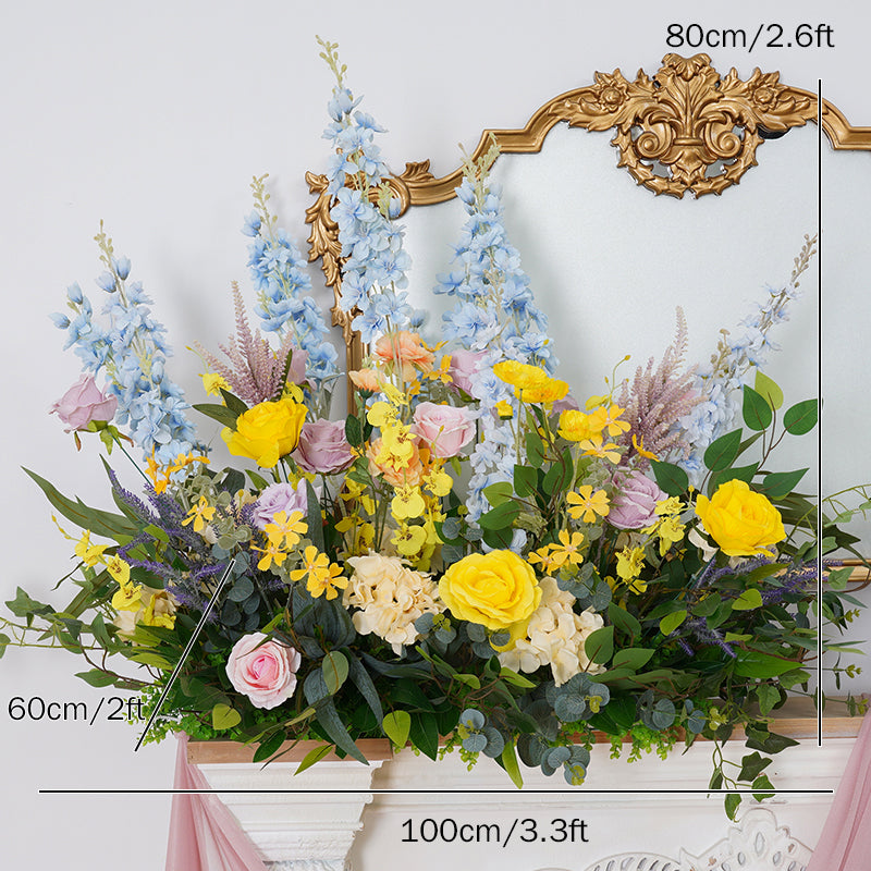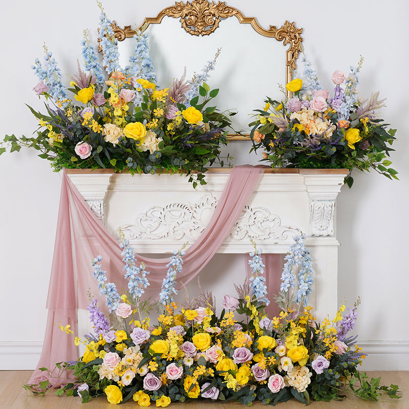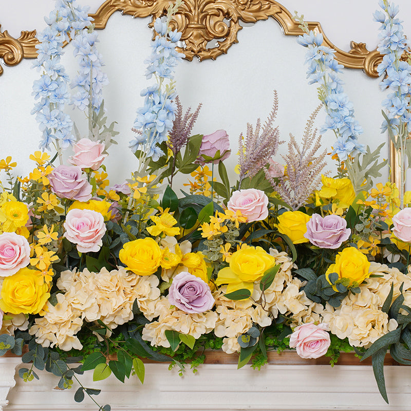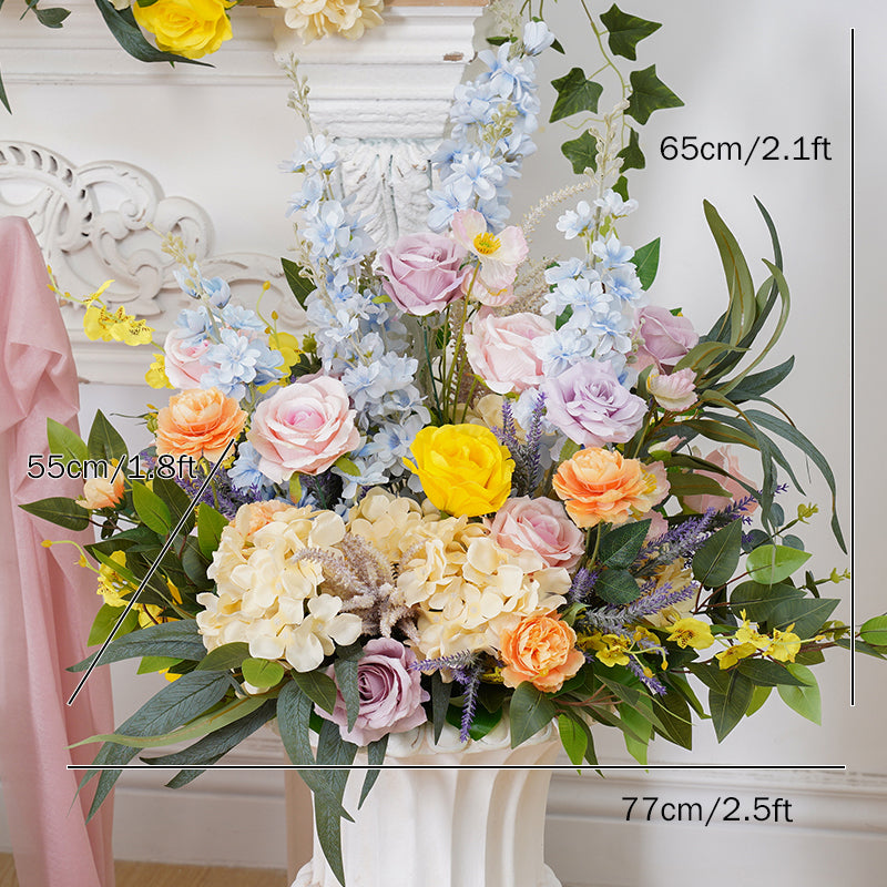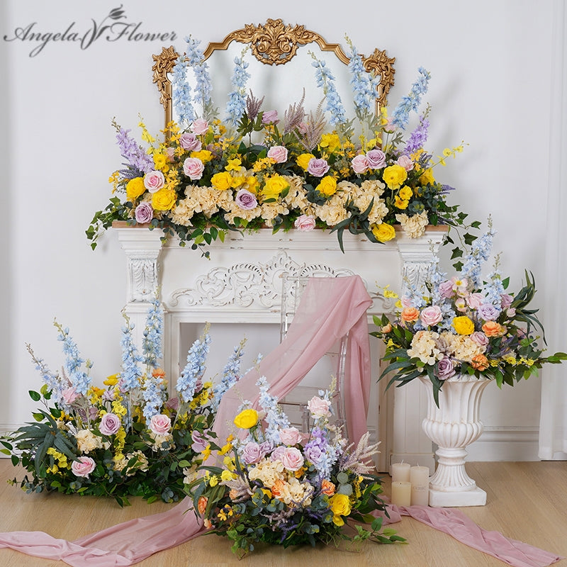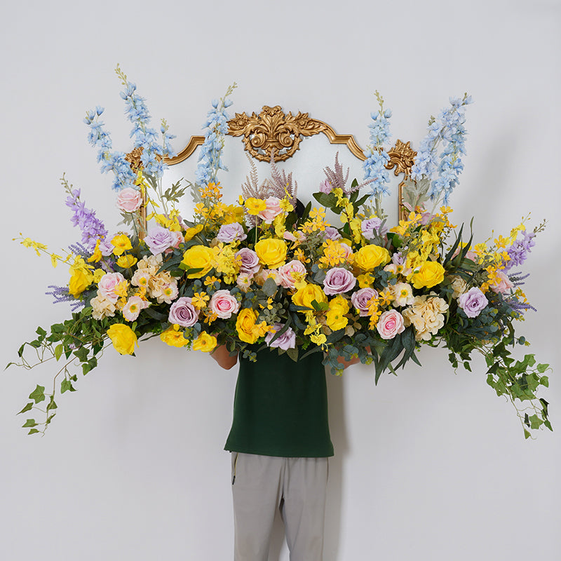 A8196 Yellow Purple Hyacinth Rose Green Leaves Floral Arrangement Wedding Backdrop