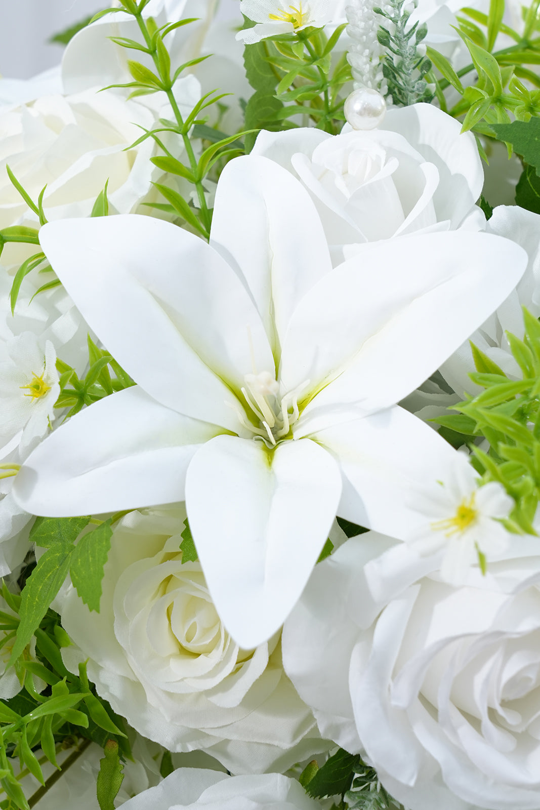 Color Inspiration: Elevate your wedding with our White Floral Ball Set! These elegant wedding centerpieces for tables feature lilies, roses, and greenery, offering centerpiece ideas for a stunning display. The classic white palette creates a timeless and sophisticated ambiance. This affordable 2-piece set is perfect for adding a touch of romance and charm to your special day without exceeding your budget.