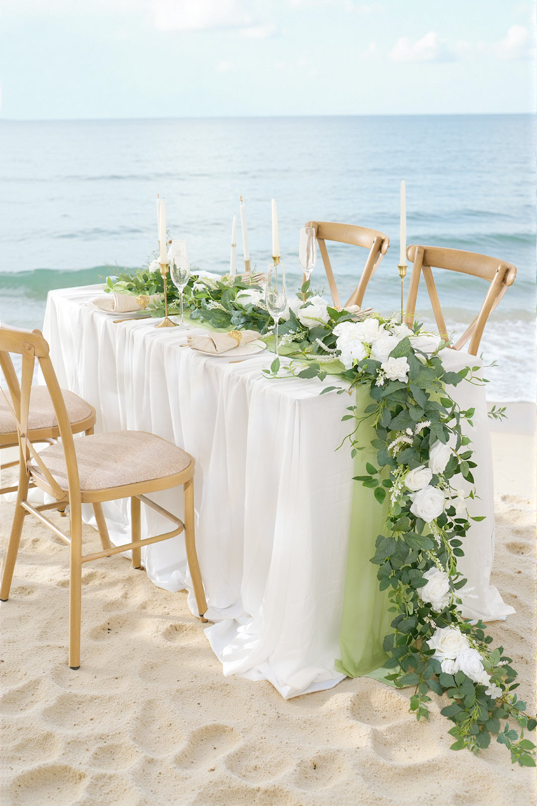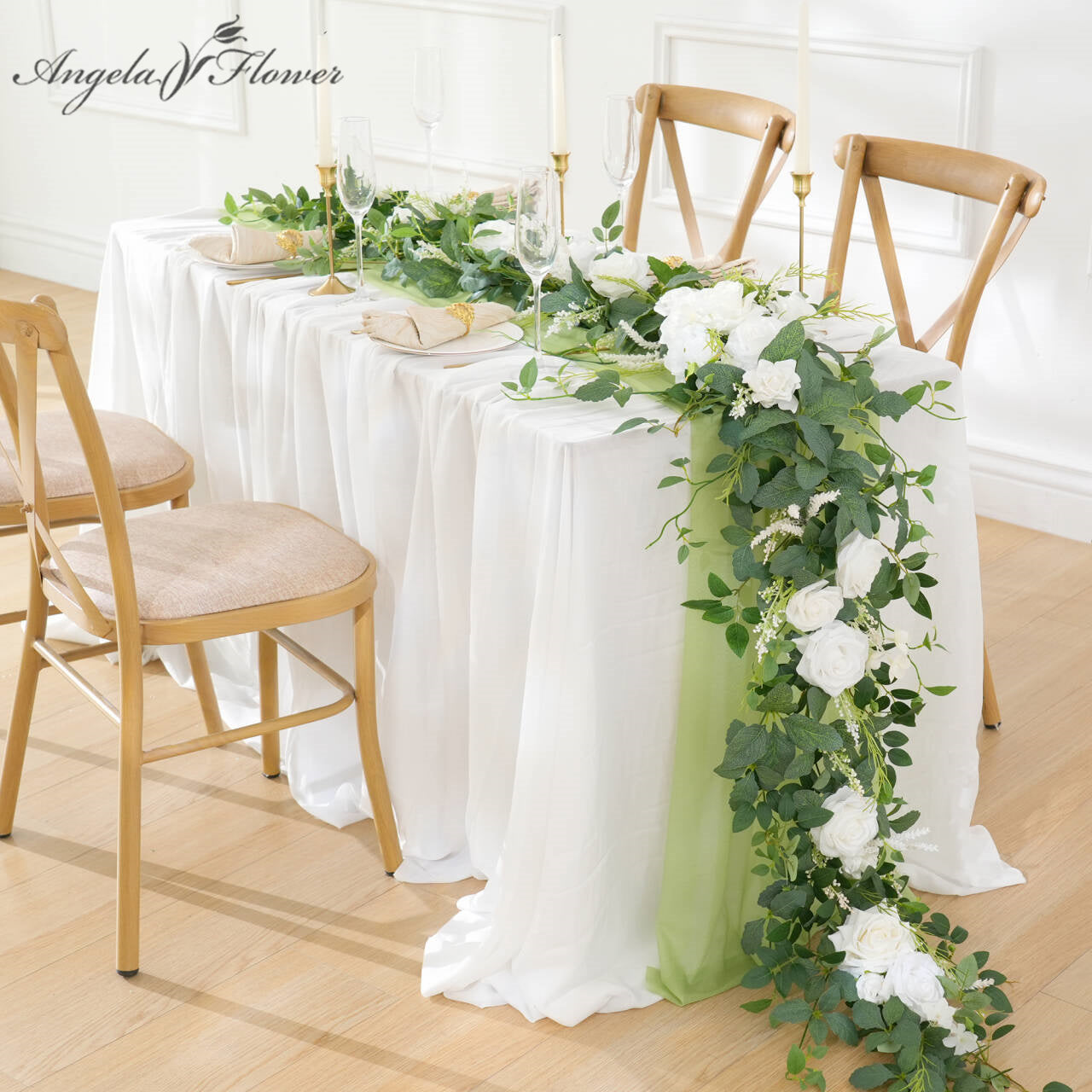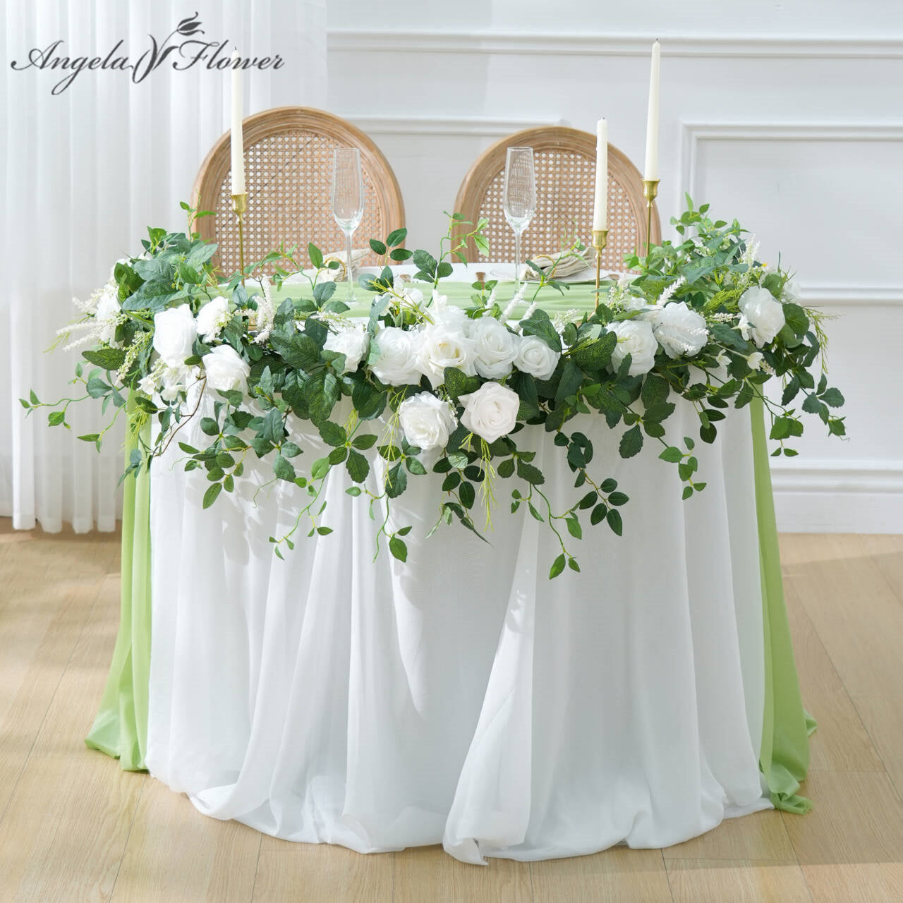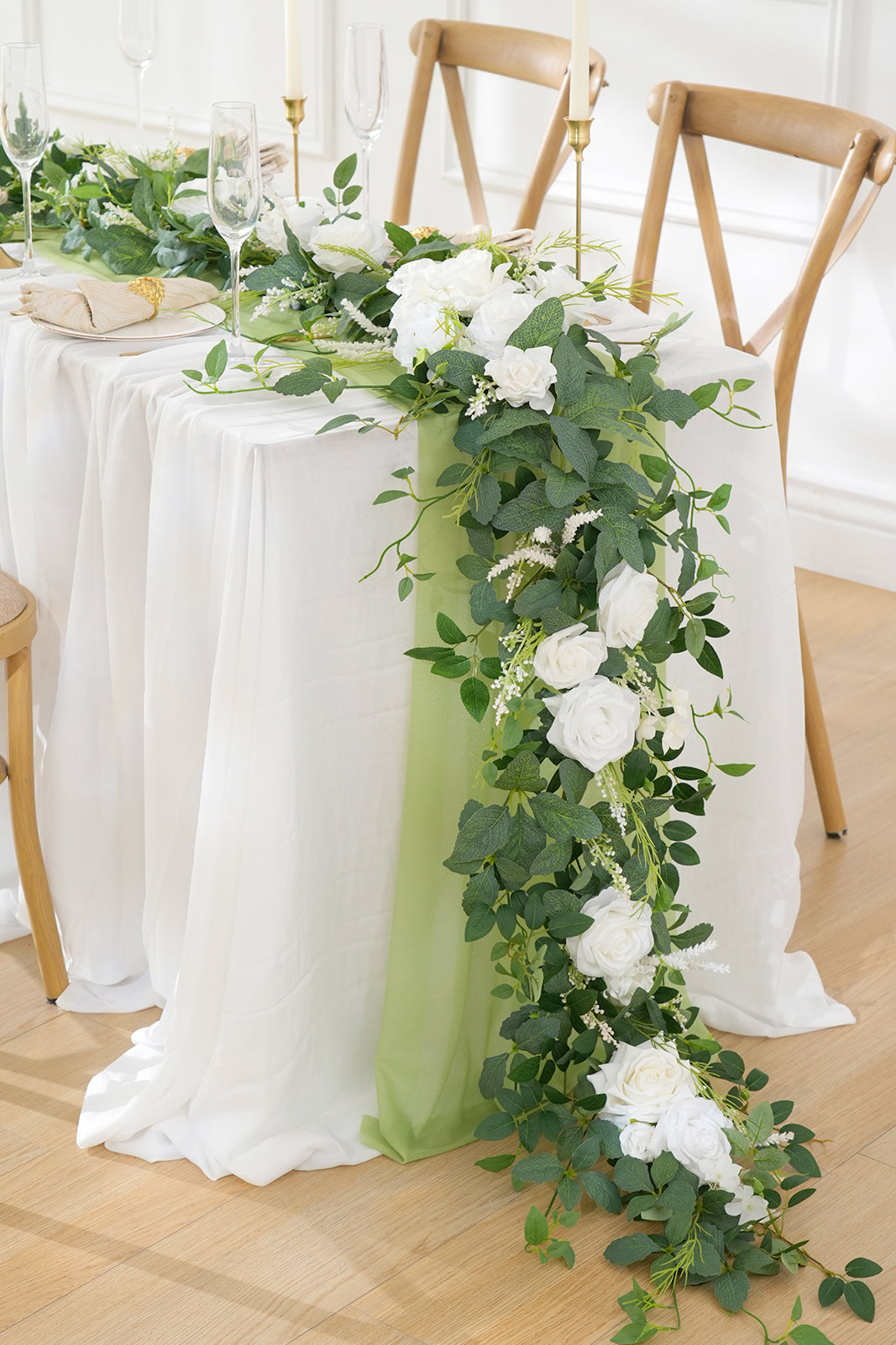 Color Inspiration: Transform any space with our exquisitely crafted floral garland. Featuring premium materials like lifelike silk roses, delicate willow vines, airy baby's breath, and vibrant eucalyptus leaves, this garland embodies natural beauty. The pure white roses create a striking contrast against the emerald green foliage, evoking a fresh, woodland aesthetic. Drape it across mantels, arches, or tables for an elegant touch.