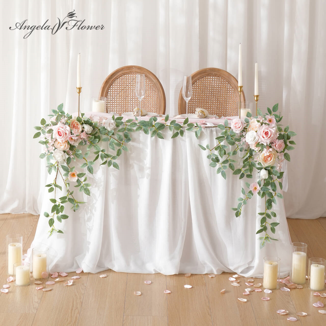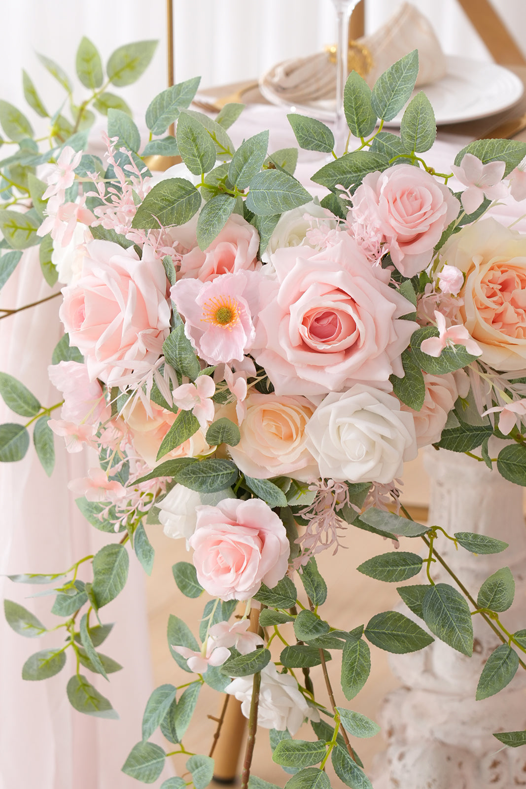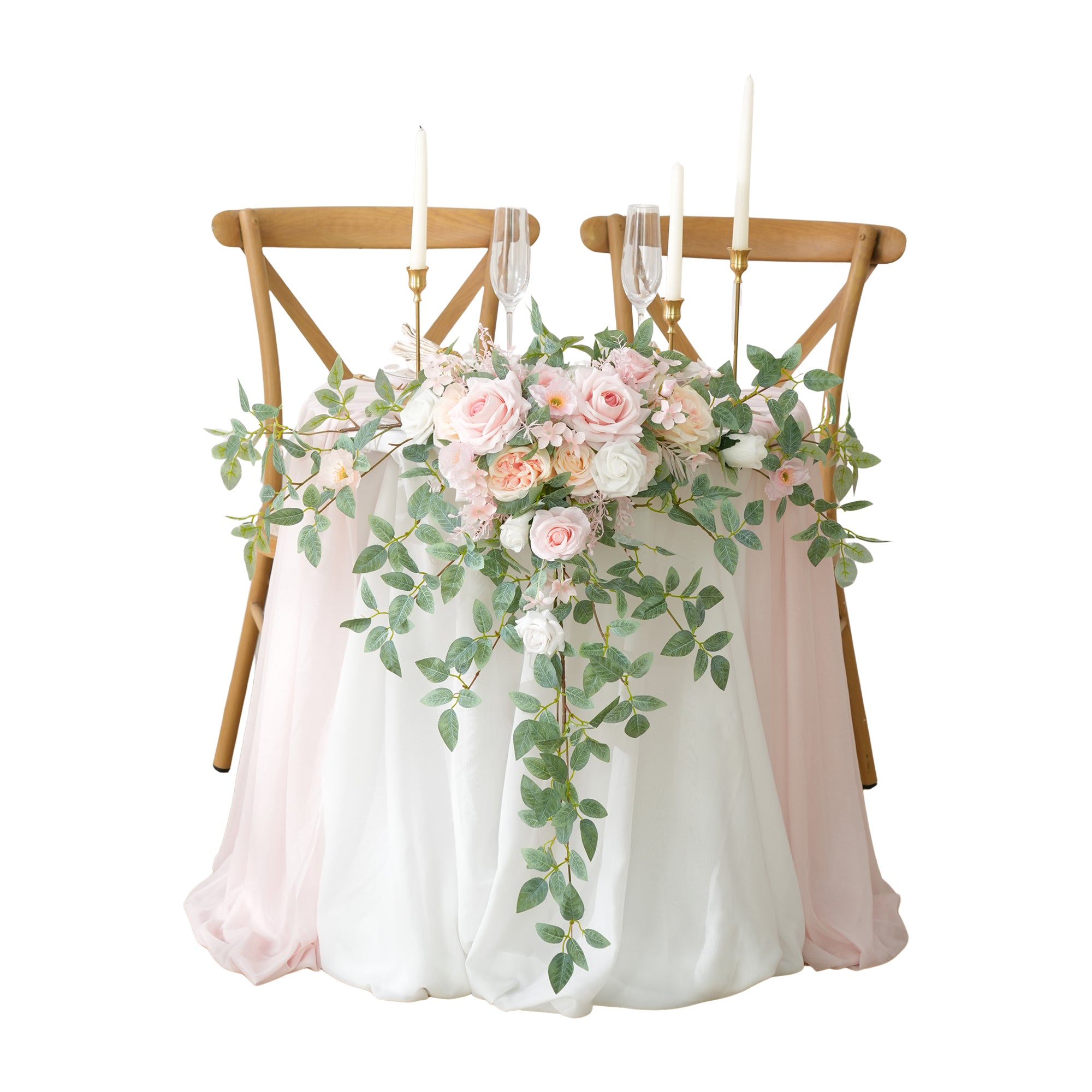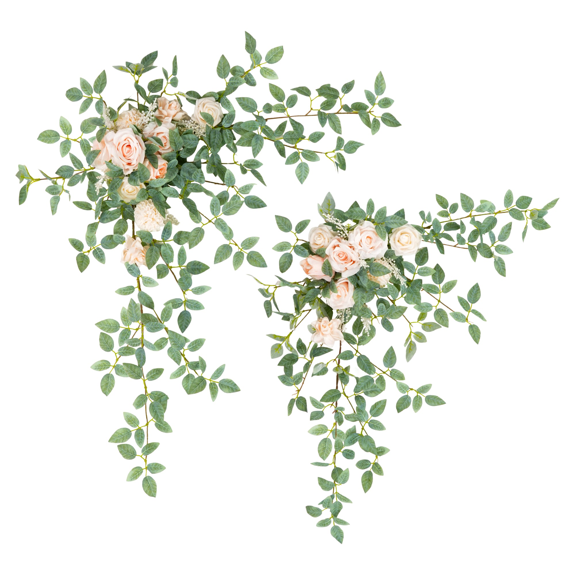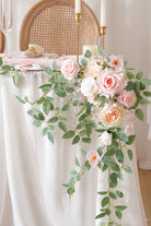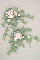 Color Inspiration: This lovely two-piece pink and greenery garland flower arrangement set can be joined to create an enchanting table decor. Made from high-quality artificial roses and lush foliage, it features soft pink blooms with subtle champagne accents set against abundant greenery. Perfect for weddings, parties, or everyday home styling.