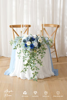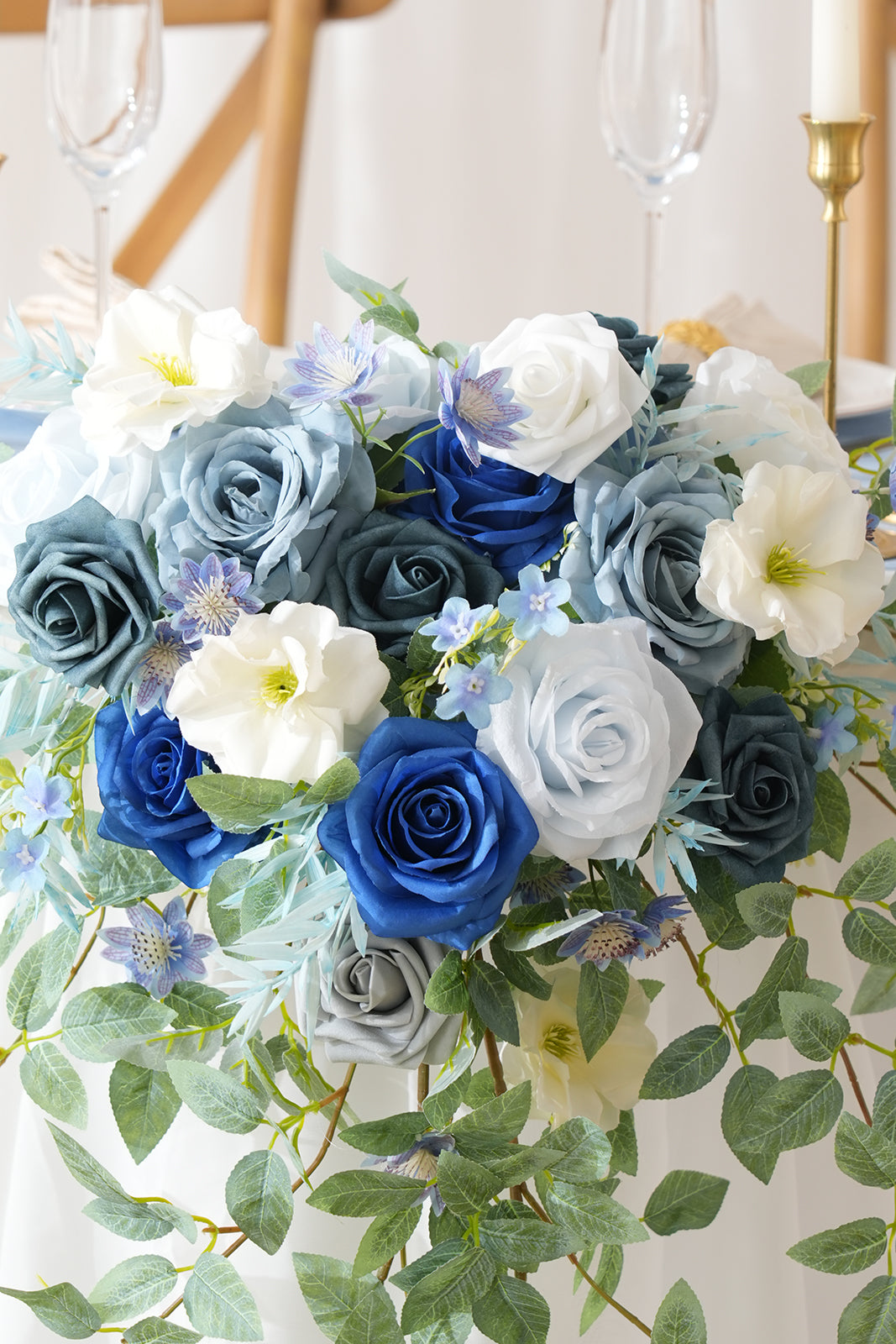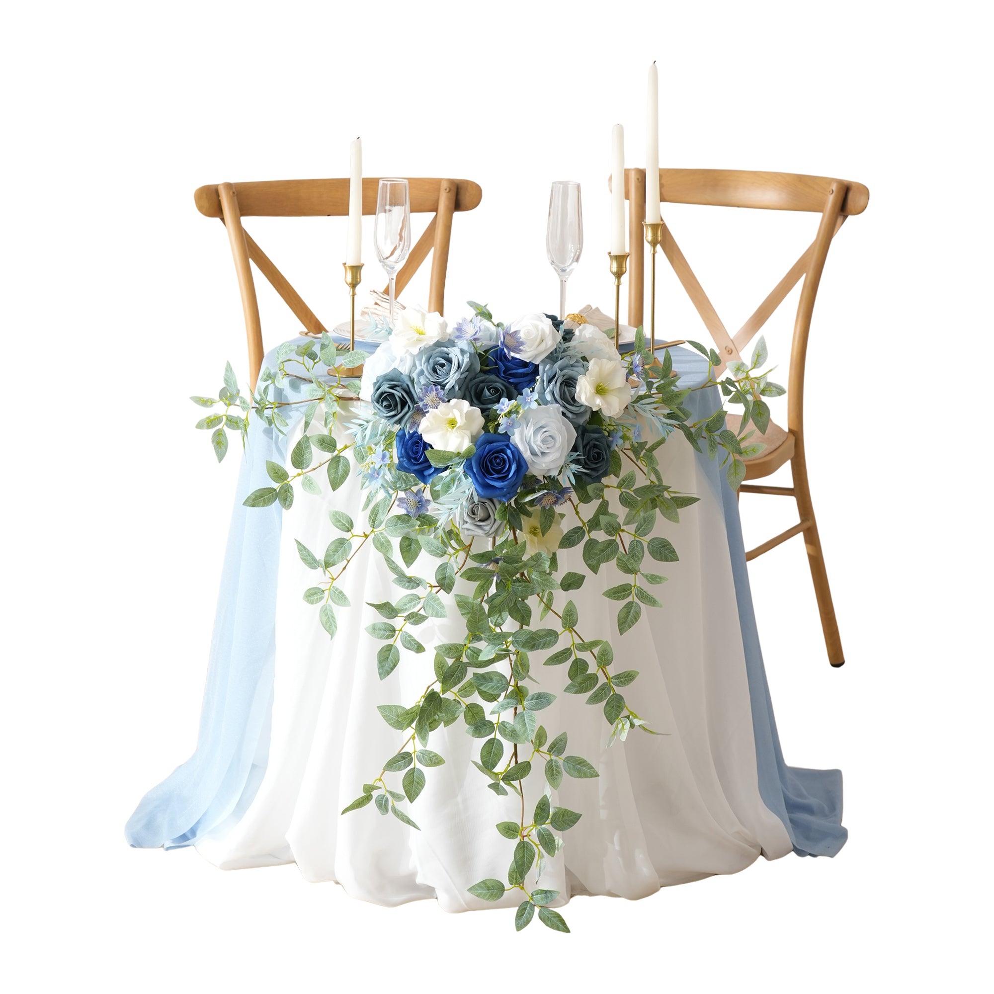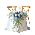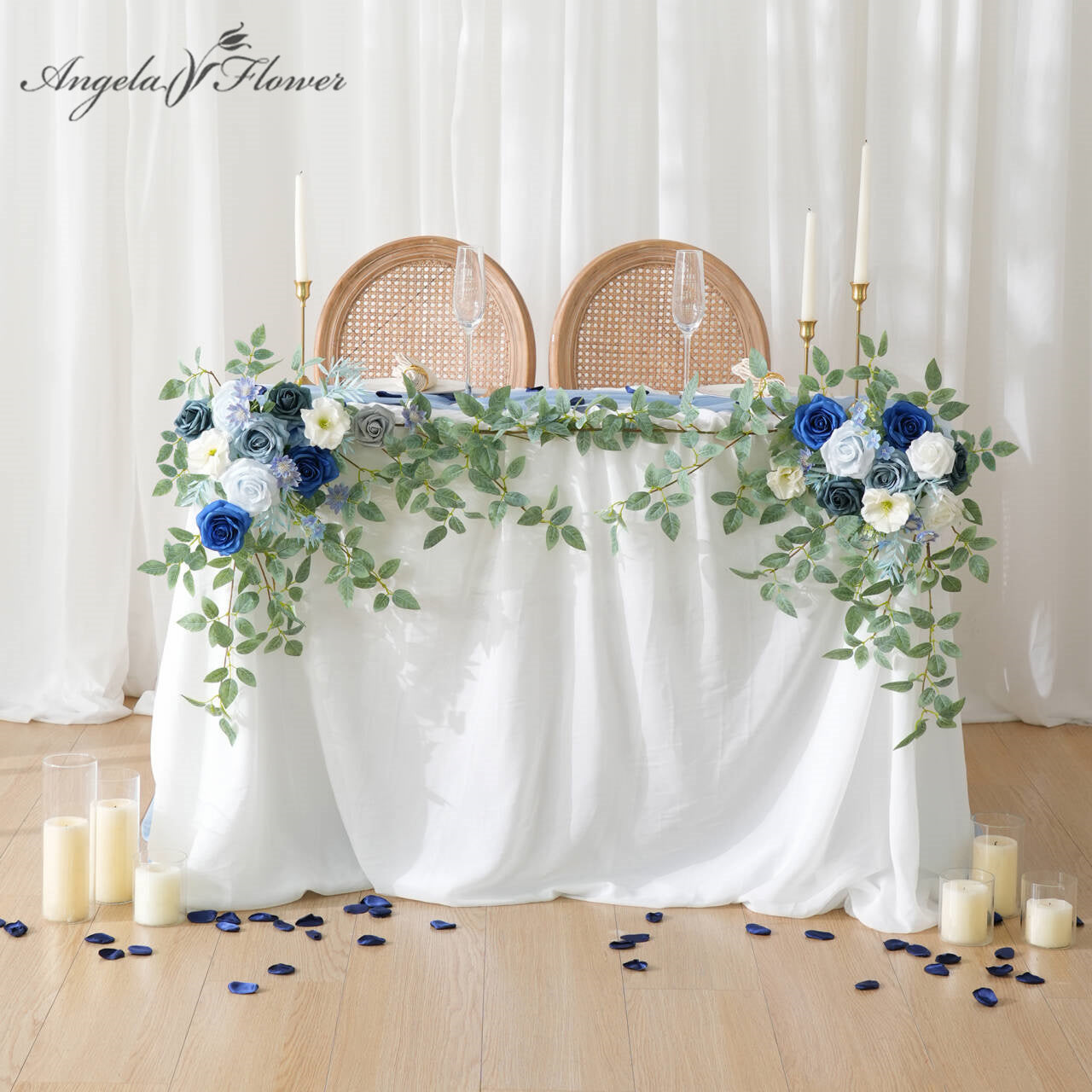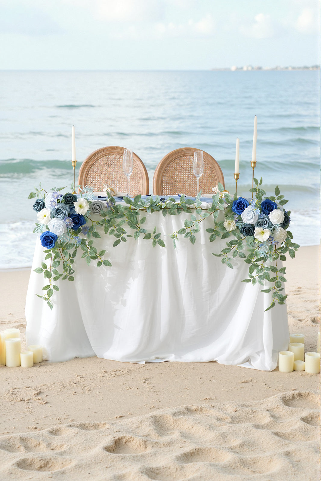 Color Inspiration: Elevate your event with our Blue White Rose Garland Table Centerpieces. This set of two features a stunning blend of various blue and white roses, artfully intertwined with lush greenery. Perfect for weddings, parties, or adding elegance to your home, these garlands create a captivating focal point.