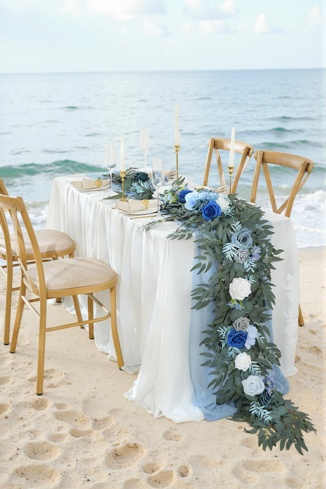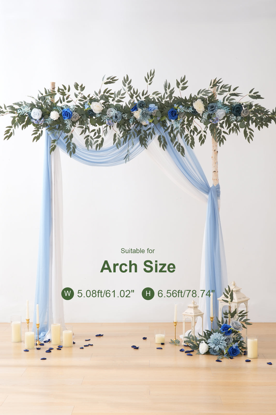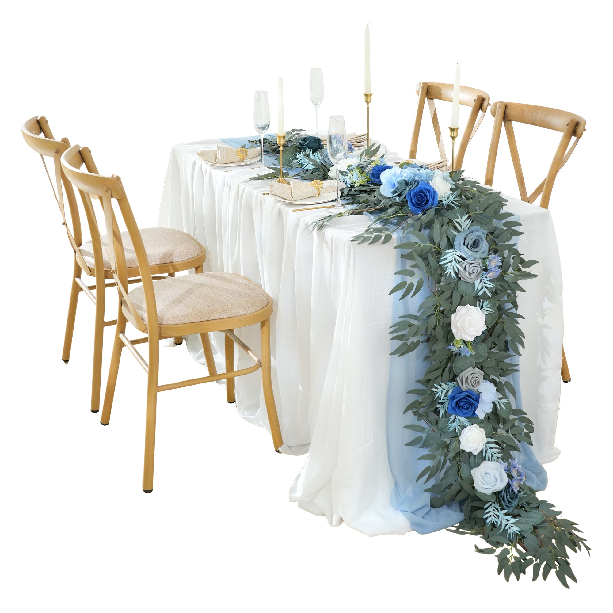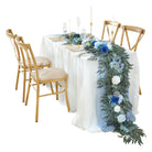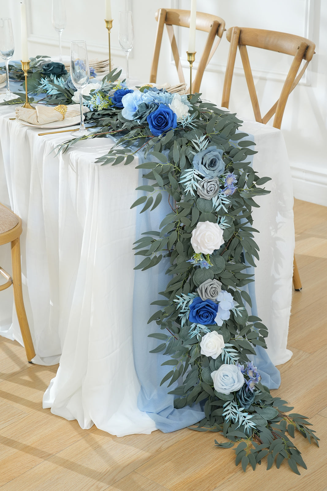 Color Inspiration: Transform your wedding with our 7ft blue greenery garland! Featuring a mix of white, royal blue, and other blue florals amidst lush greenery, it's perfect for arches, tables, or walls. High-quality materials provide a realistic look and long-lasting beauty. Easily customize your wedding décor with this versatile and stunning garland.