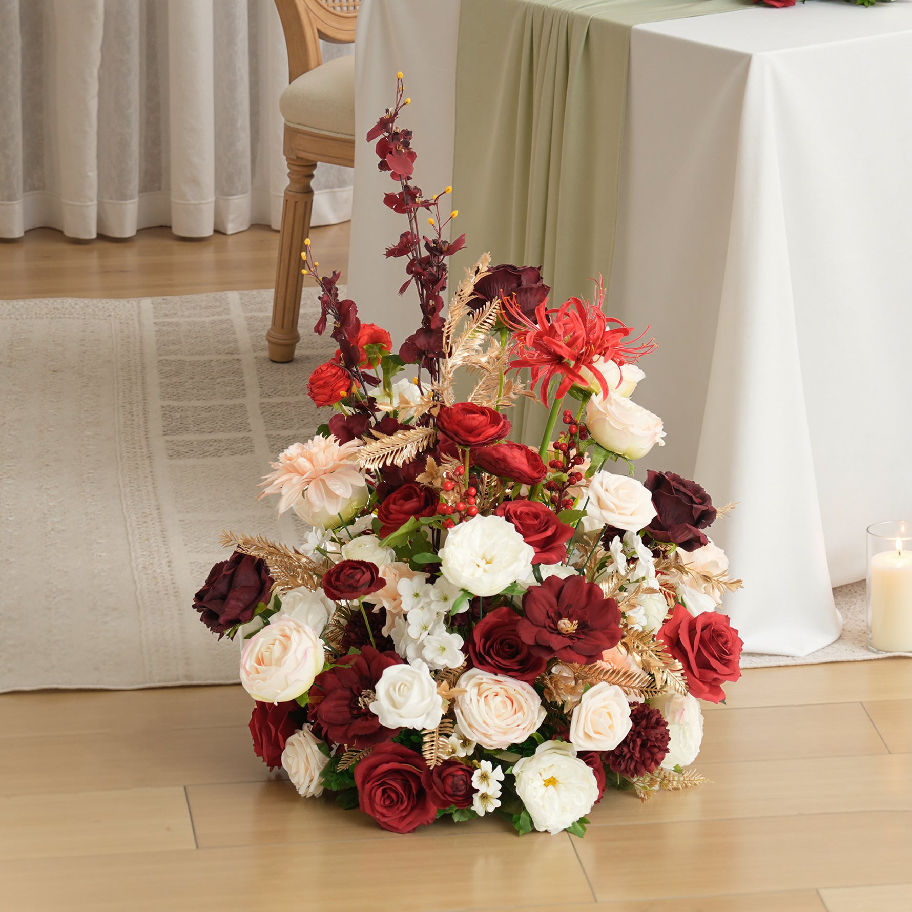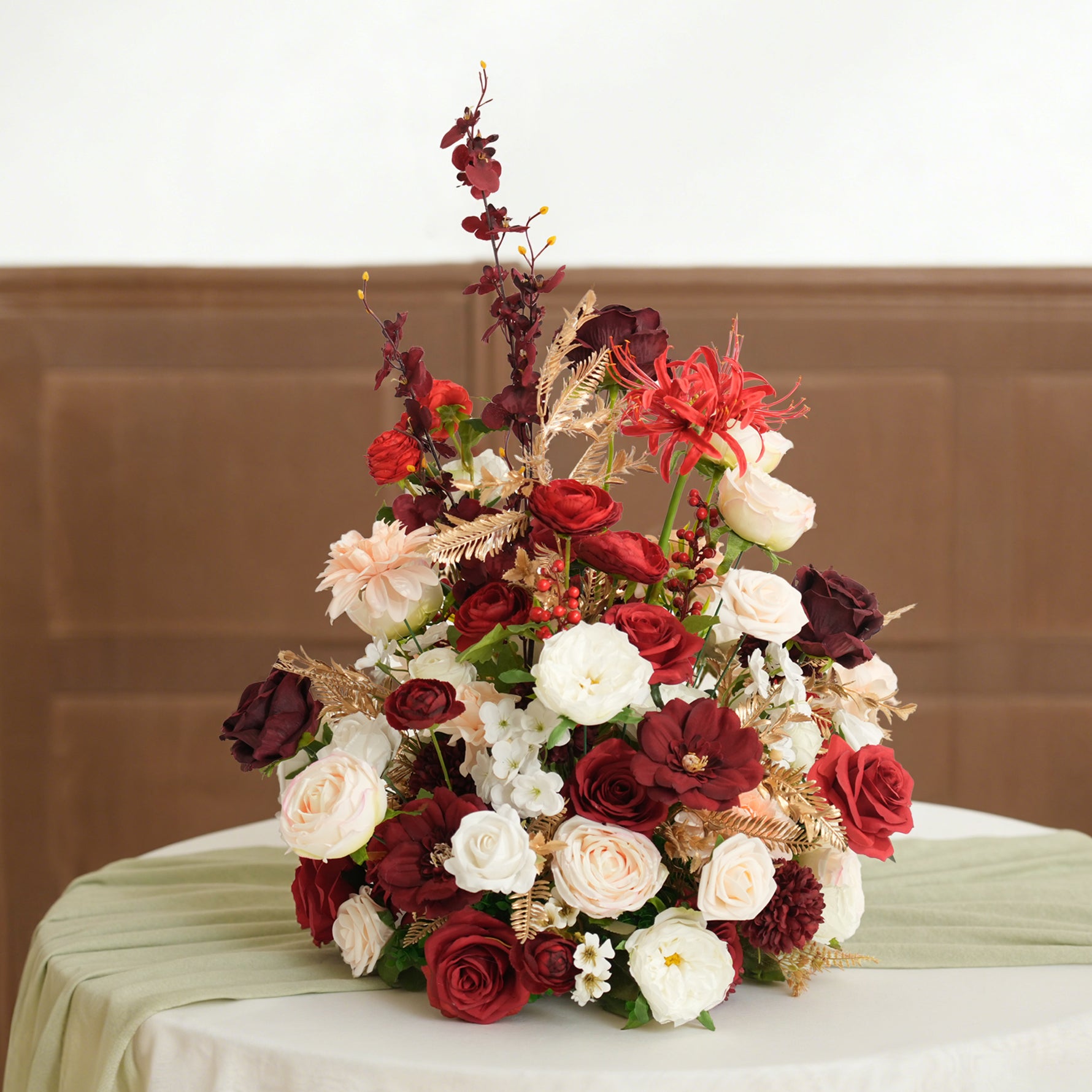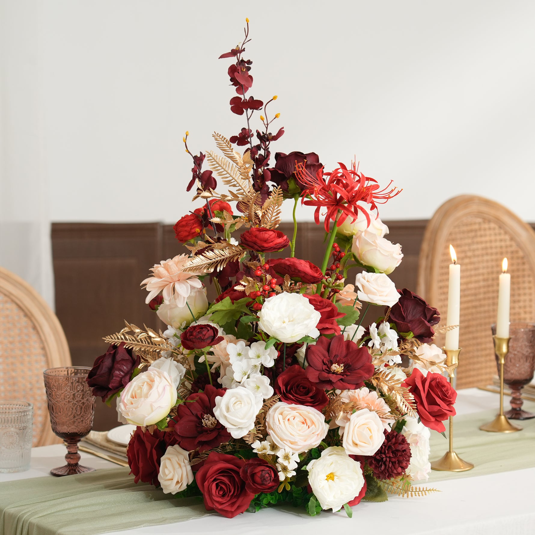 Color Inspiration: This elegant 1.64ft table flower arrangement is perfect for weddings and special events. Featuring a romantic blend of pink, white, and red blooms accented with delicate golden leaves, it adds a touch of luxury to any setting. Lightweight and easy to place, it’s ready to beautify your celebration instantly.