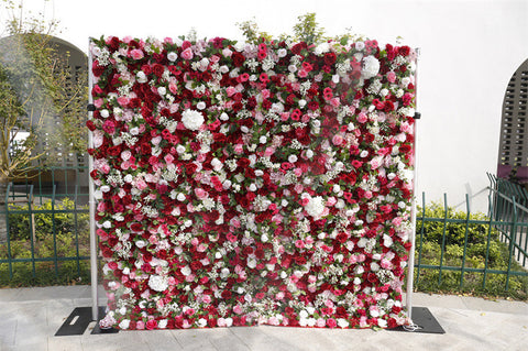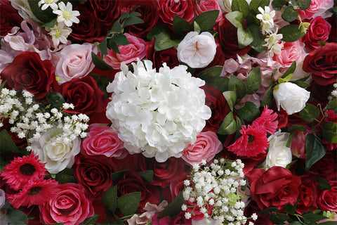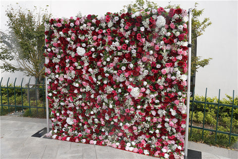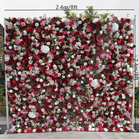 5D Ruĝa Rozkolora Flora Mura Aranĝo Artificial Hortensia Bebo Spiro Roll Up Ŝtofo Flora Muro Geedziĝa Fono Dekoracio Planto muro