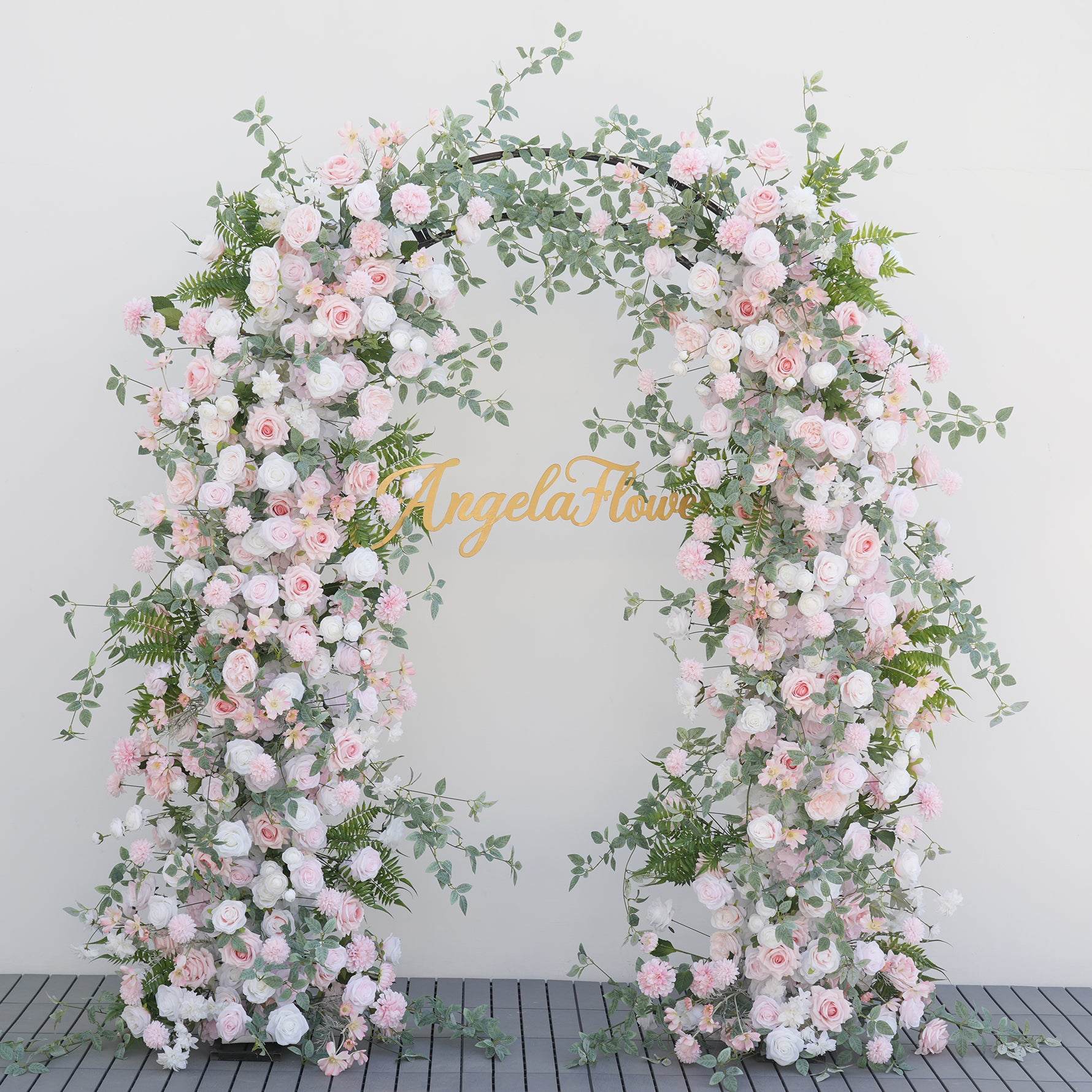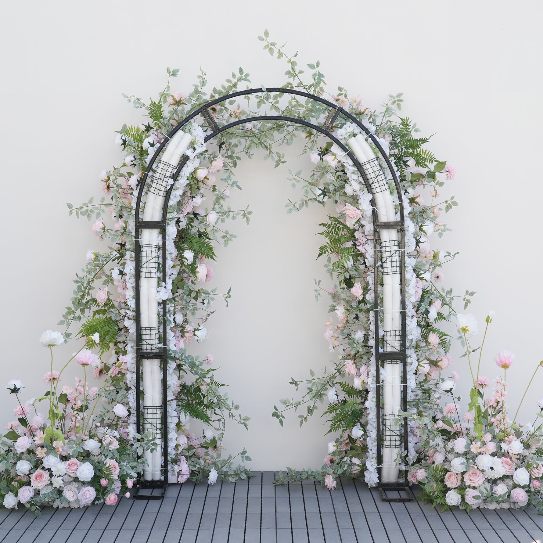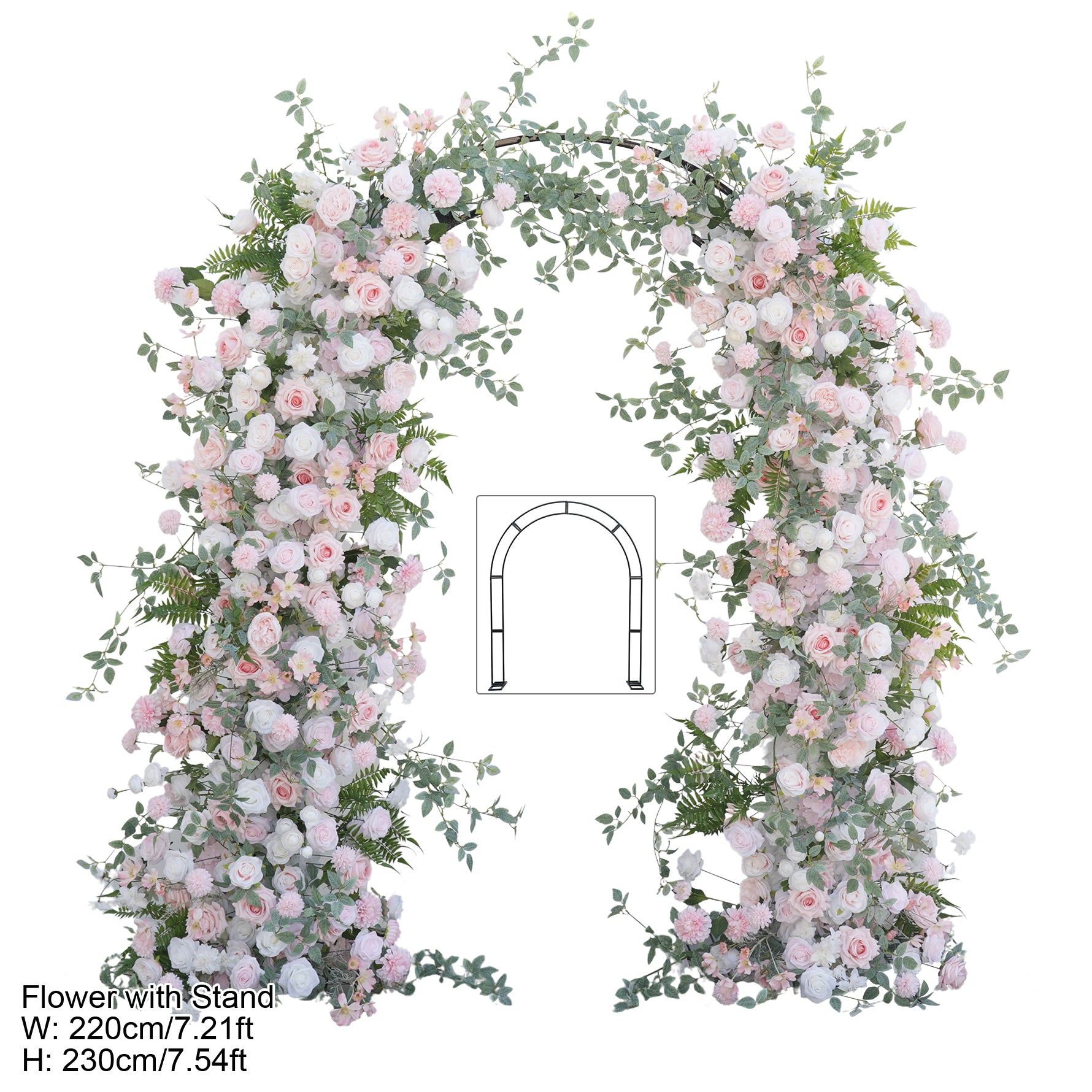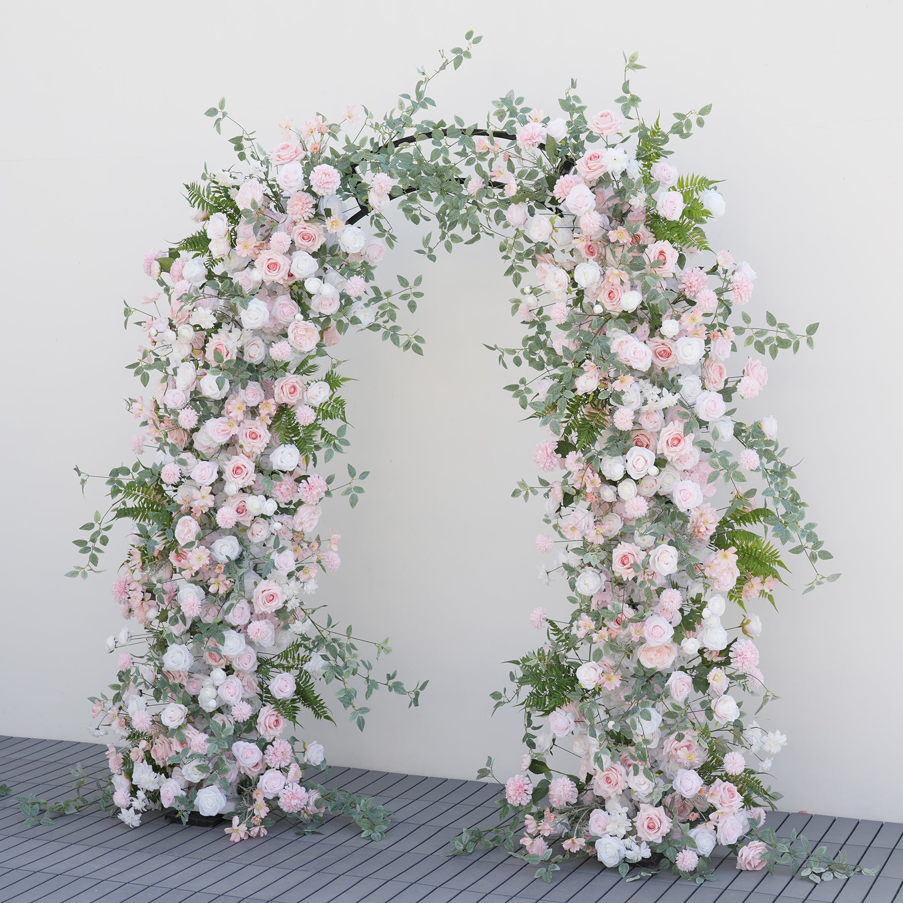 Color Inspiration: Elevate your wedding or event with our stunning floral arch and aisle decorations. Featuring delicate pink and white roses intertwined with lush greenery, this arrangement creates a romantic and enchanting ambiance. Perfect for ceremonies, receptions, or photo backdrops, our durable and easy-to-install design ensures a beautiful and lasting impression.