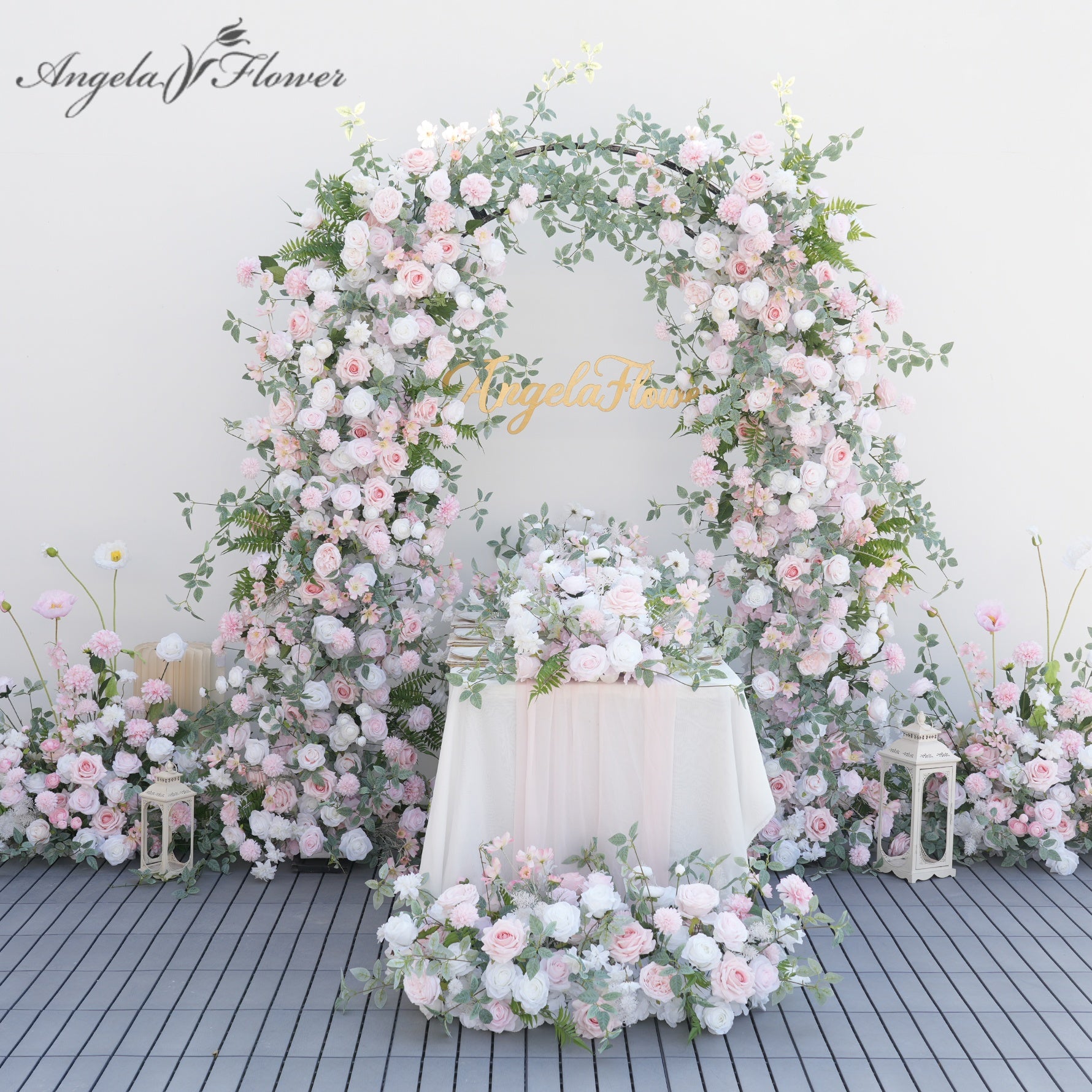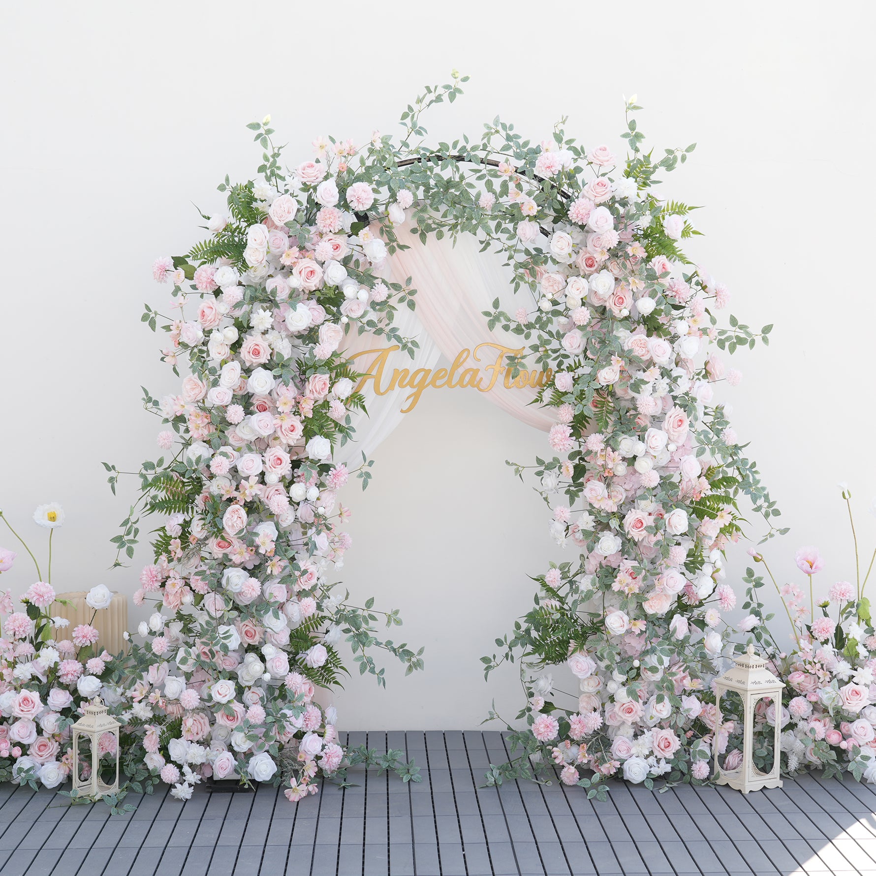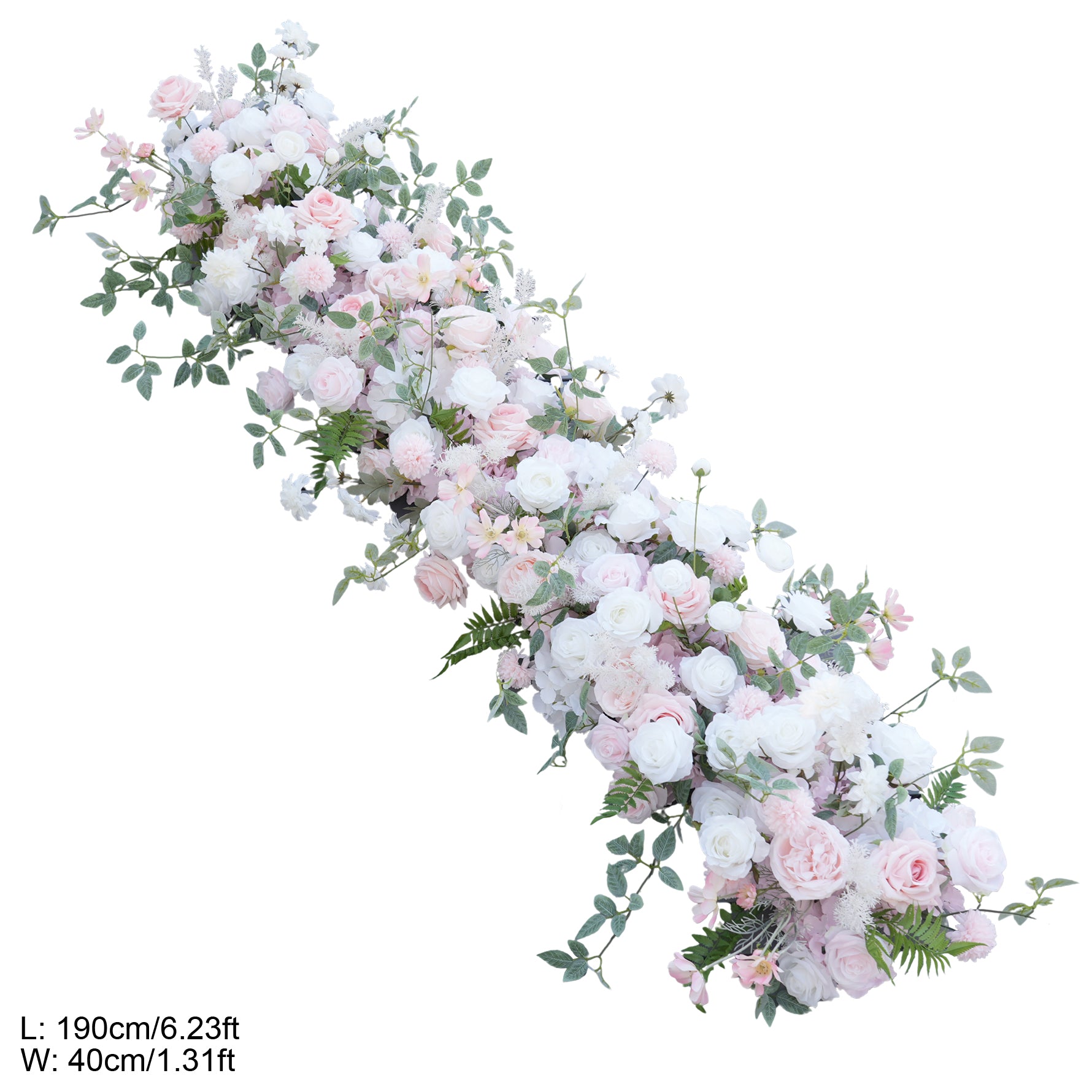 Color Inspiration: Elevate your wedding or event with our stunning floral arch and aisle decorations. Featuring delicate pink and white roses intertwined with lush greenery, this arrangement creates a romantic and enchanting ambiance. Perfect for ceremonies, receptions, or photo backdrops, our durable and easy-to-install design ensures a beautiful and lasting impression.