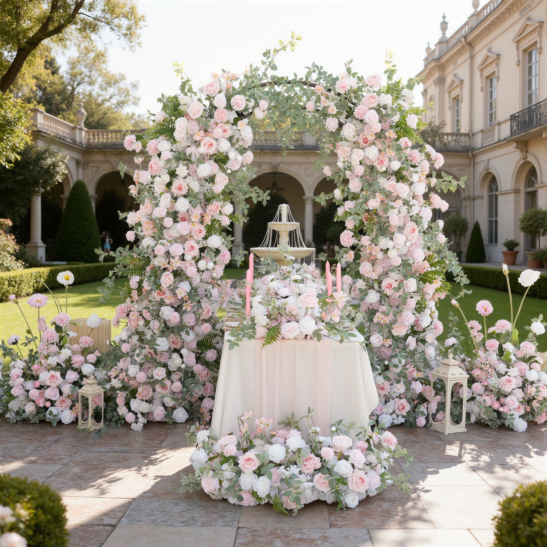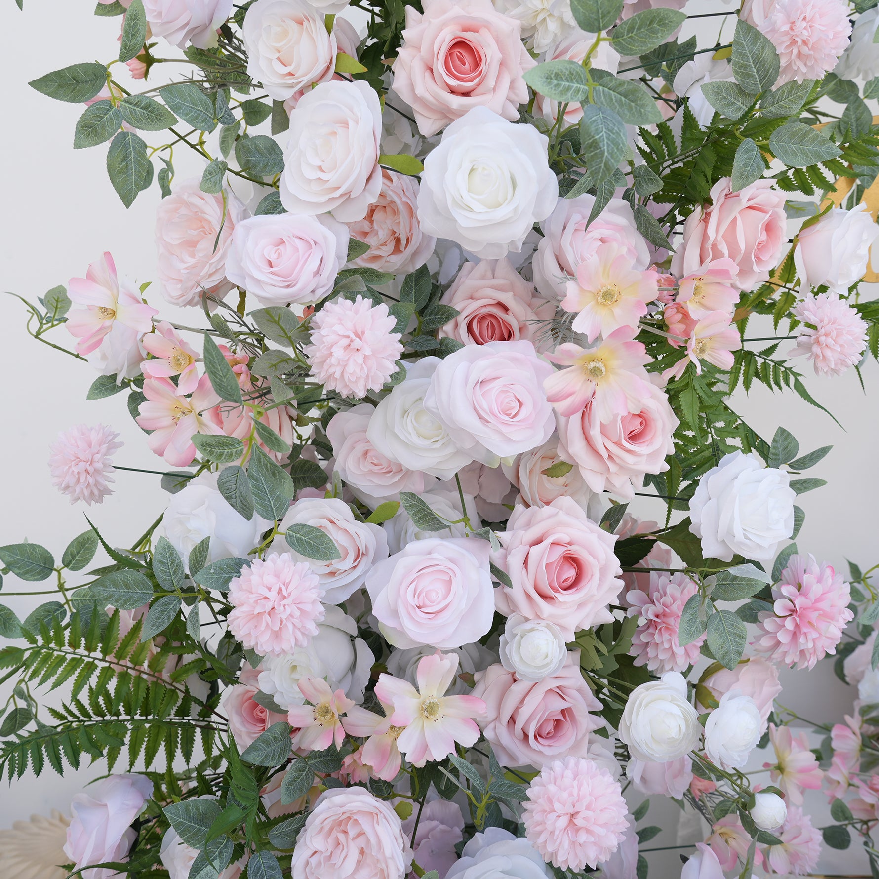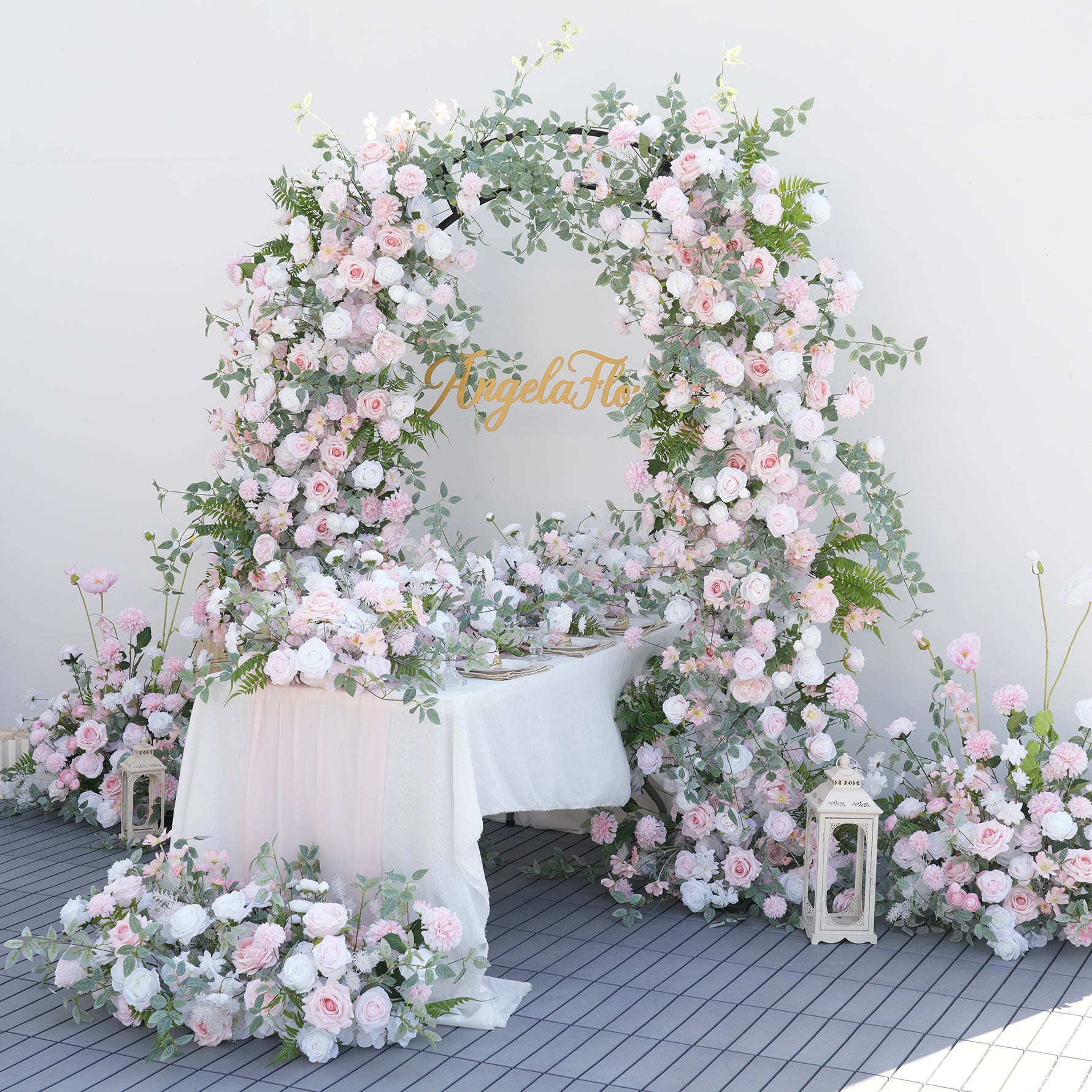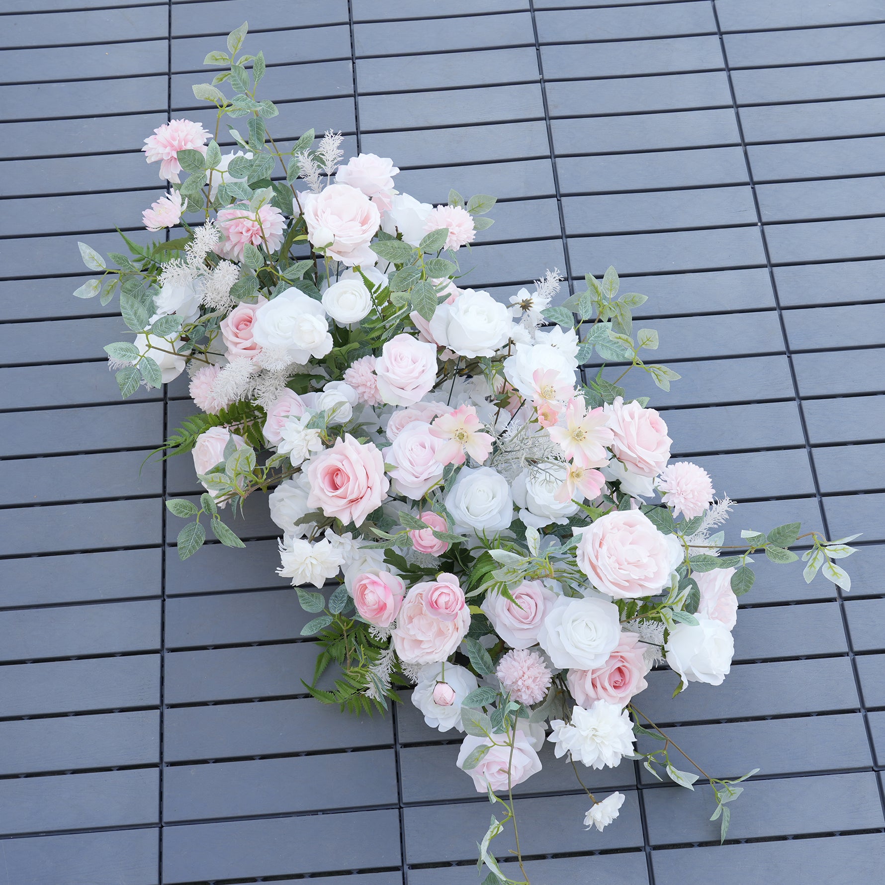 Color Inspiration: Elevate your wedding or event with our stunning floral arch and aisle decorations. Featuring delicate pink and white roses intertwined with lush greenery, this arrangement creates a romantic and enchanting ambiance. Perfect for ceremonies, receptions, or photo backdrops, our durable and easy-to-install design ensures a beautiful and lasting impression.