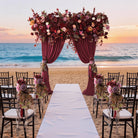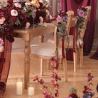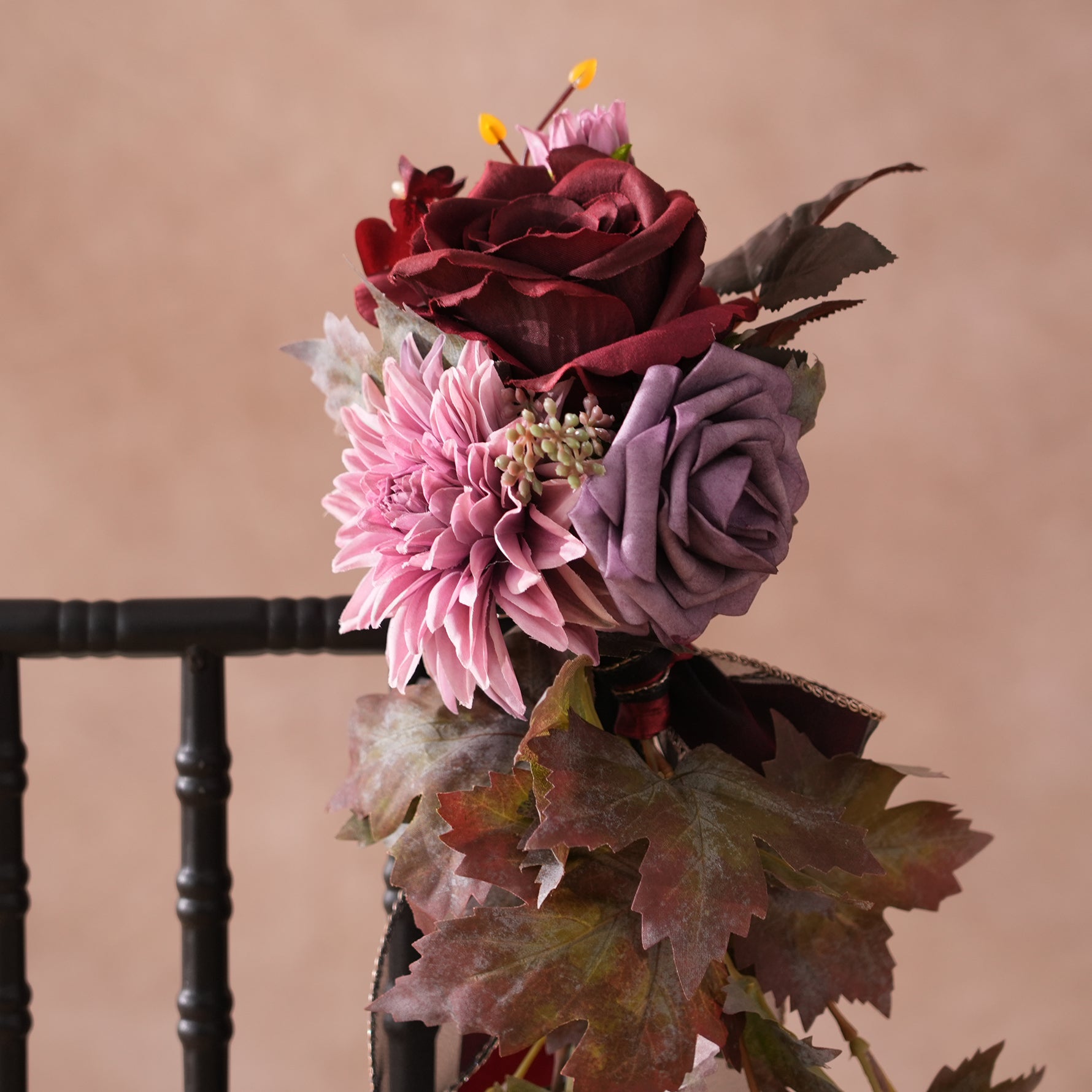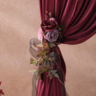 Color Inspiration: Elevate your event with our Burgundy Rose Chair Flowers (4-Piece Set). These exquisite decorations feature rich, wine-red roses artfully combined with vibrant maple leaves, creating a touch of autumnal romance.