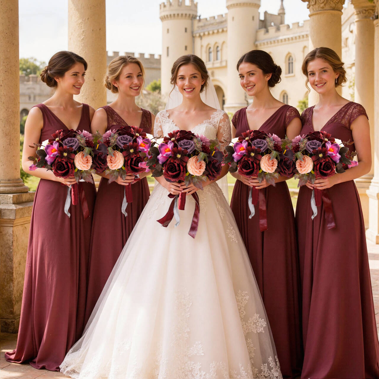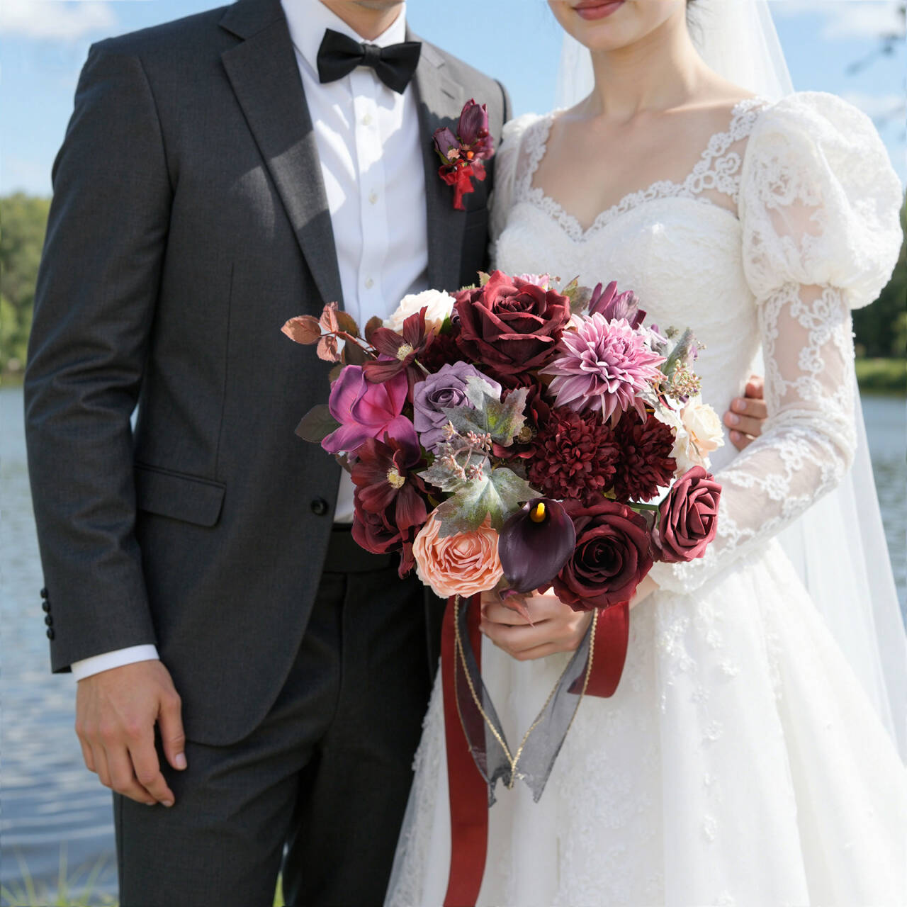 Color Inspiration: Embrace timeless romance with our Burgundy Bridal Bouquet. This exquisite collection features various wine-red blooms, creating a captivating cascade of color. Perfect for the modern bride seeking sophistication and elegance.