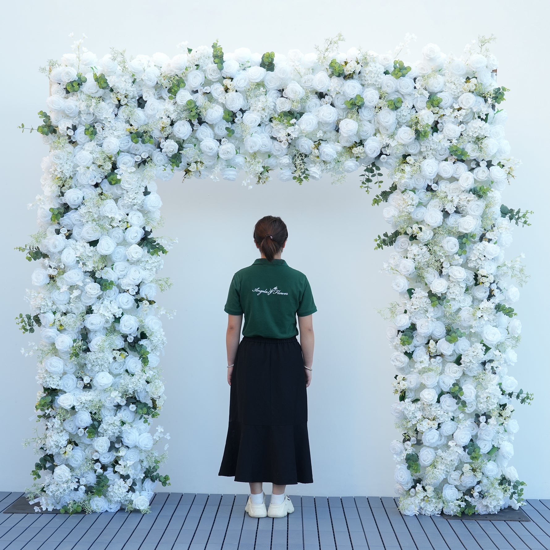 Color Inspiration: Elevate your space with this elegant white rose and baby's breath arch. Perfect for weddings, parties, or home décor, its square design offers modern simplicity. Delicate eucalyptus leaves add a touch of natural beauty. The combination of pure white roses and twinkling baby's breath creates a romantic and timeless atmosphere, ideal for stunning photo backdrops.