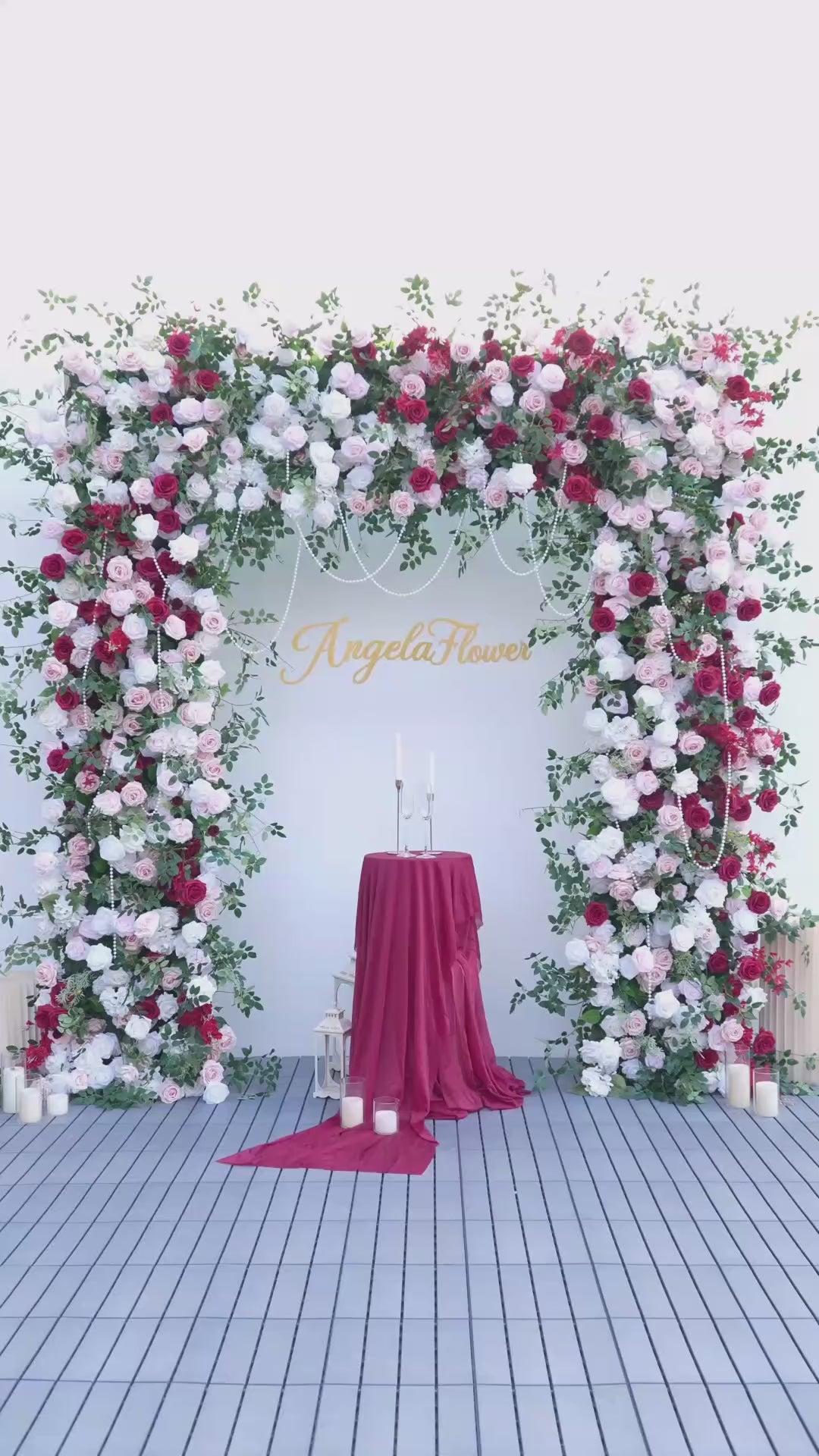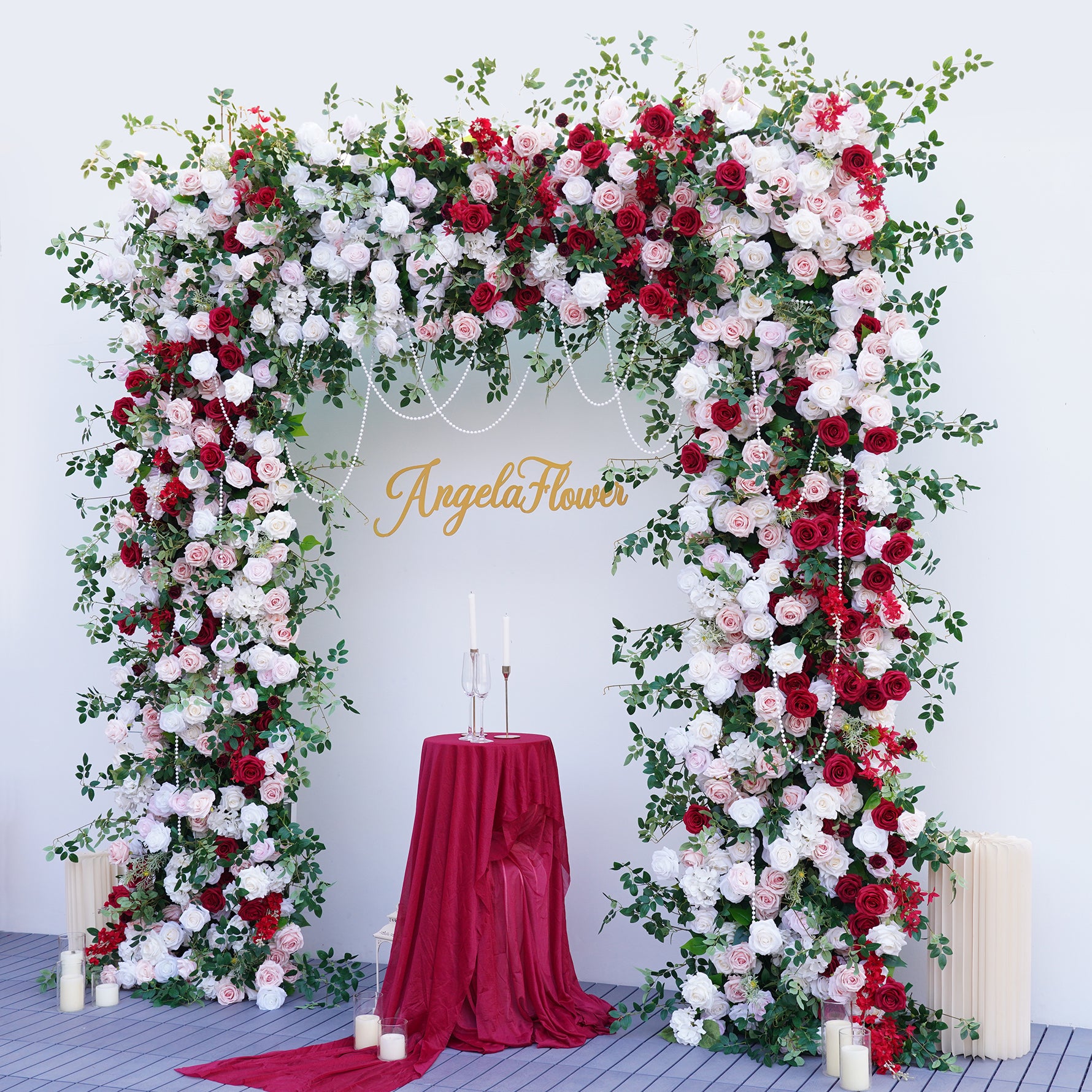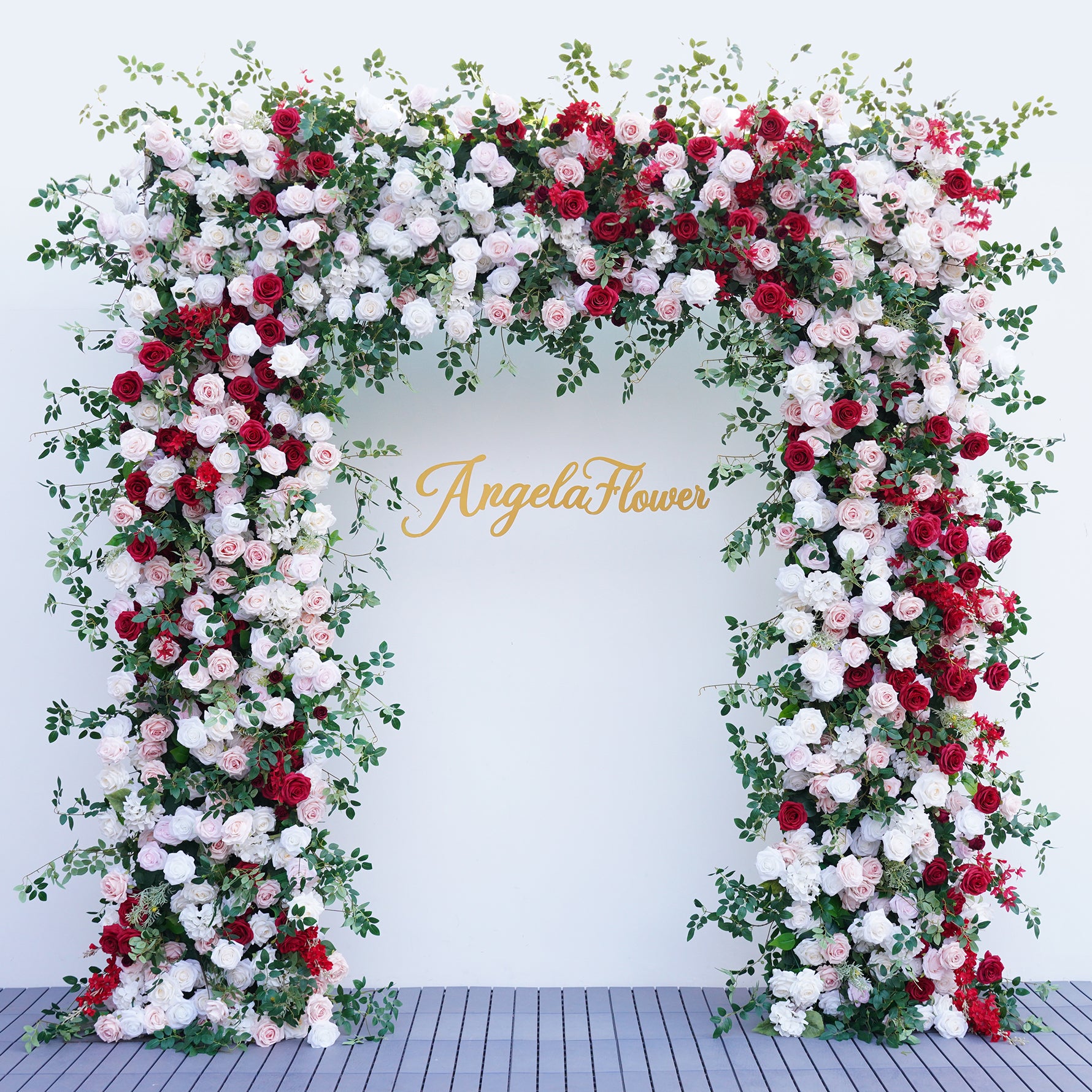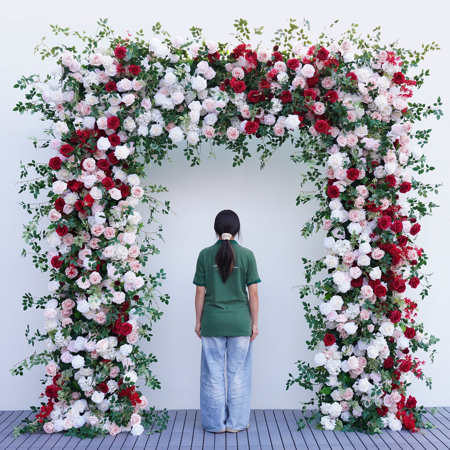 Color Inspiration: Elevate any space with our stunning faux floral archway! Vibrant red and pink roses, lush greenery on a fabric-backed square frame create a captivating focal point. Perfect for weddings, events, or home decor. Lightweight, easy to assemble, and durable for indoor/outdoor use.