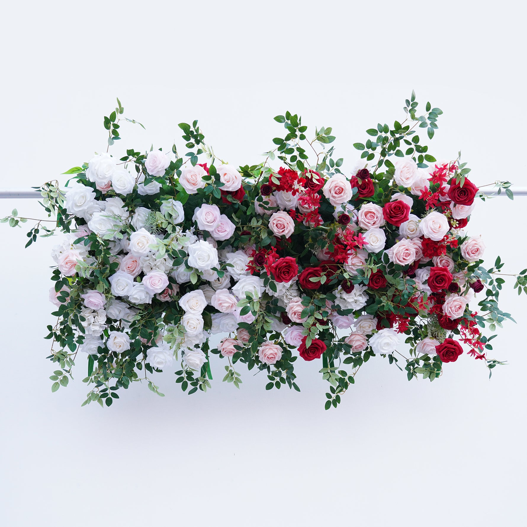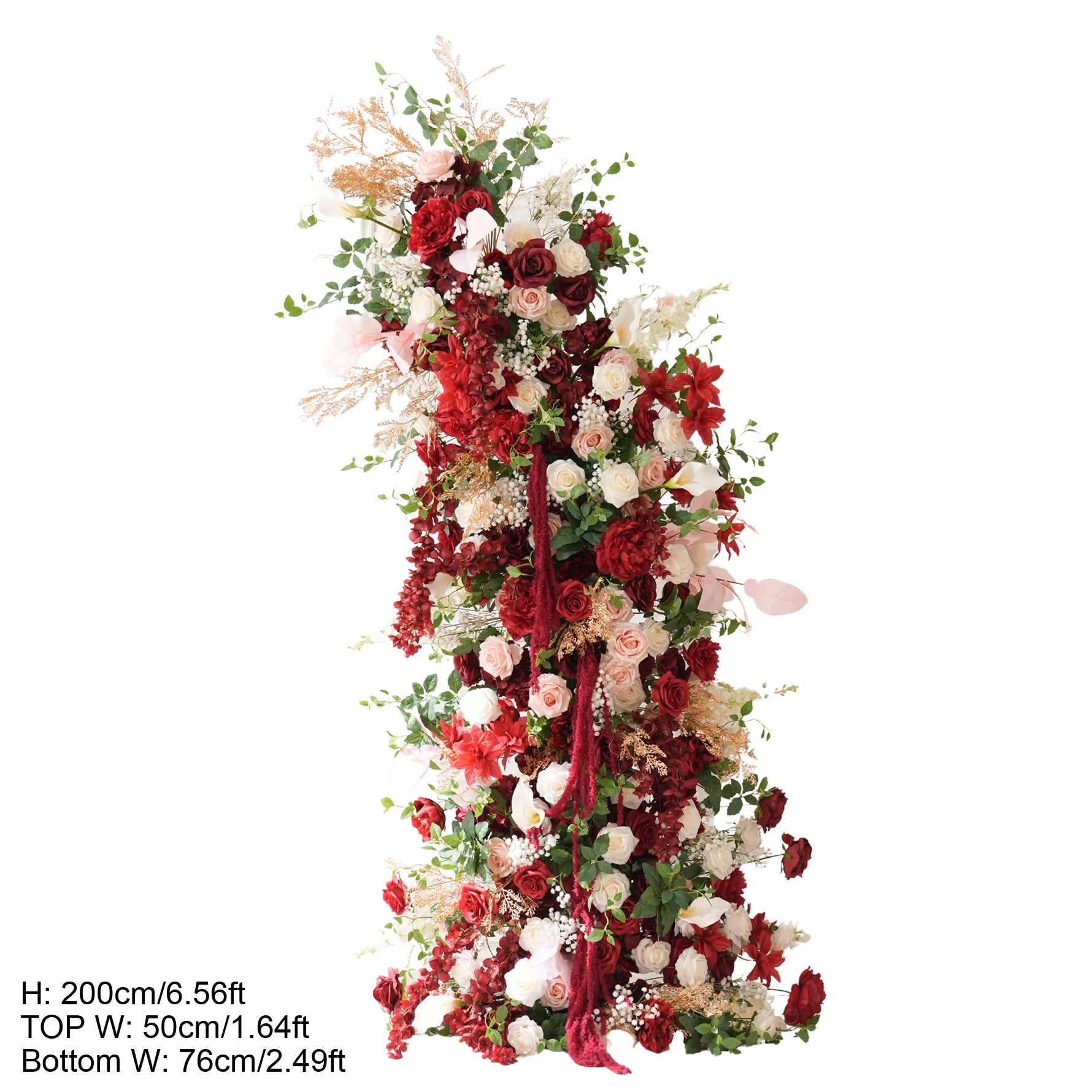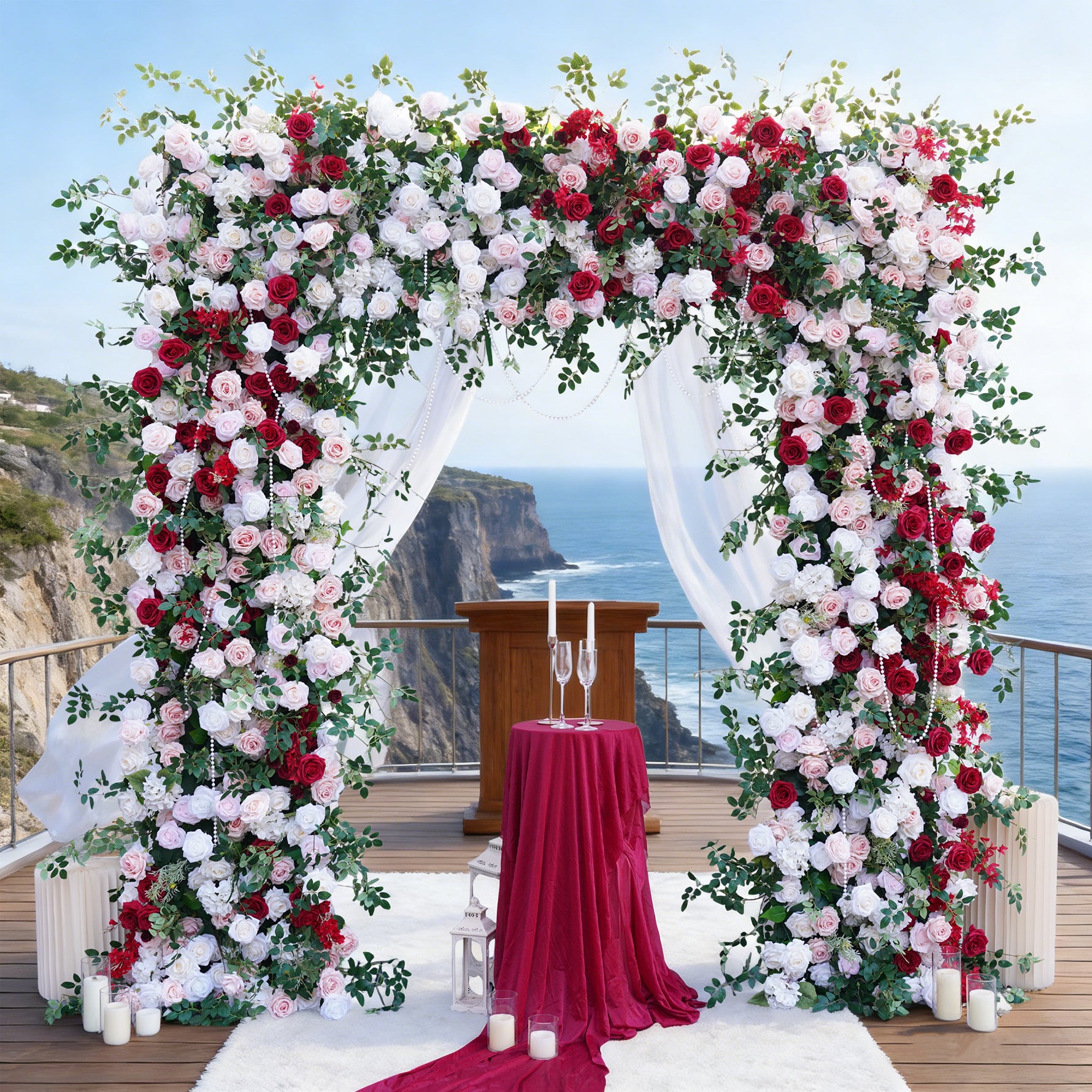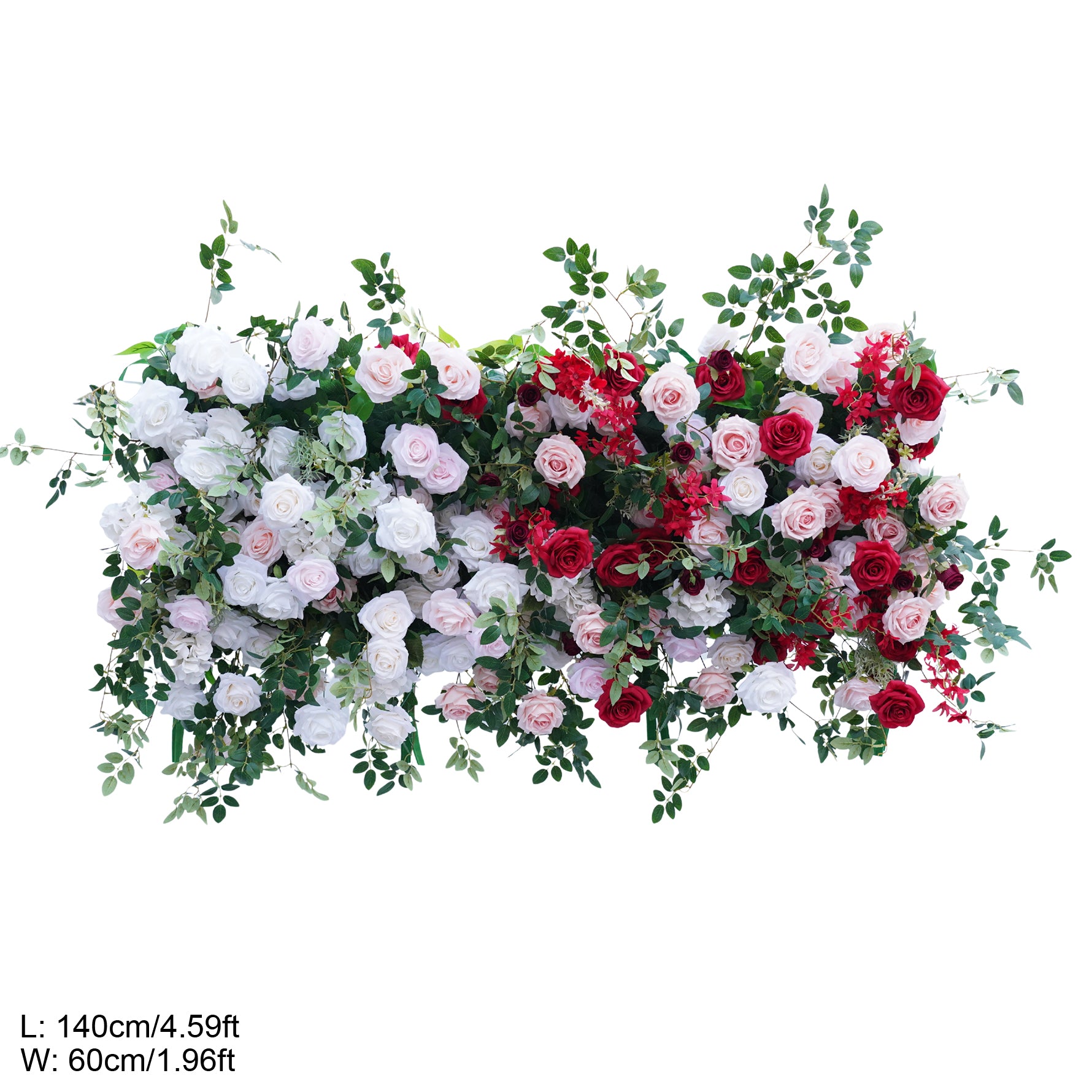 Color Inspiration: Elevate any space with our stunning faux floral archway! Vibrant red and pink roses, lush greenery on a fabric-backed square frame create a captivating focal point. Perfect for weddings, events, or home decor. Lightweight, easy to assemble, and durable for indoor/outdoor use.