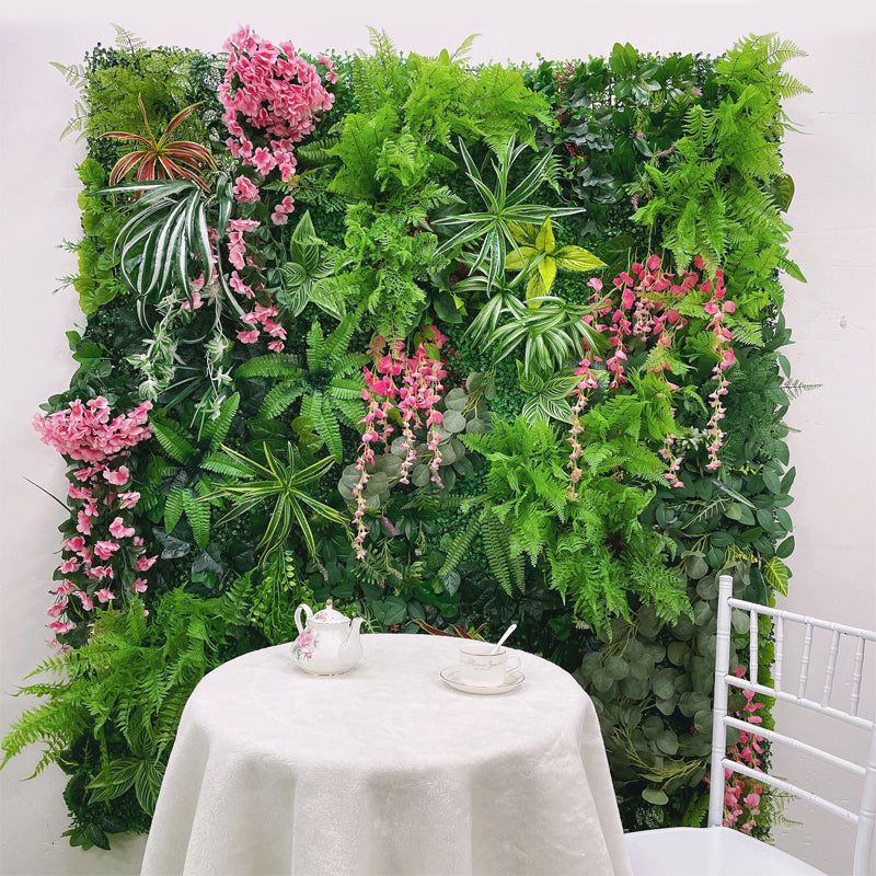 Pertsonalizatutako Luxuzko 3D Ehunezko Landareen Hormako Karpetak Artifizialko Lore Hormako Belar Turf Kanpoko Ezkonduko Atzeko Planoko Dekorazioa Belarretako Jardina Paisaia A5503