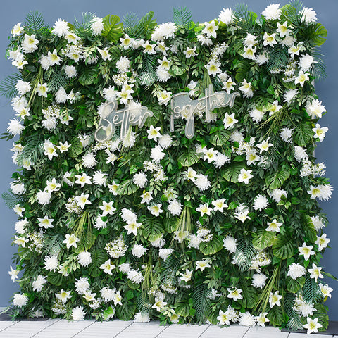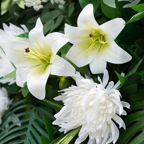 Angela Lore Kanpo Ezkon Atzeko Dekorazioa 5D Ehuna Lore Horma Lili Zuri Kraboko Claw Chrysanthemum Palmako Hostoa Lore Konposaketa A8106