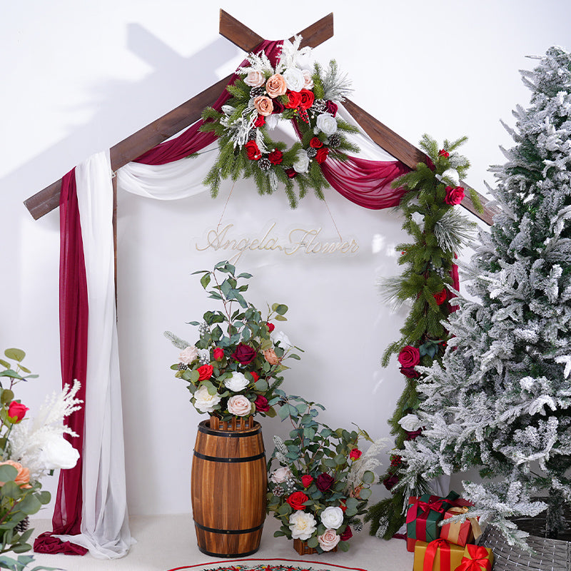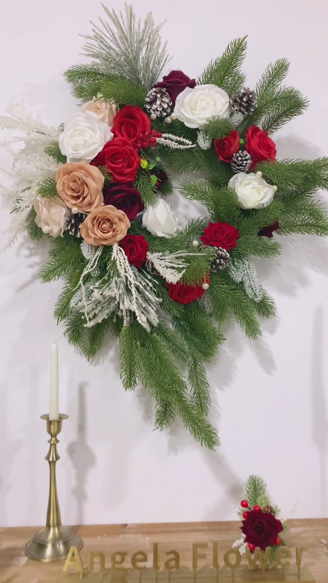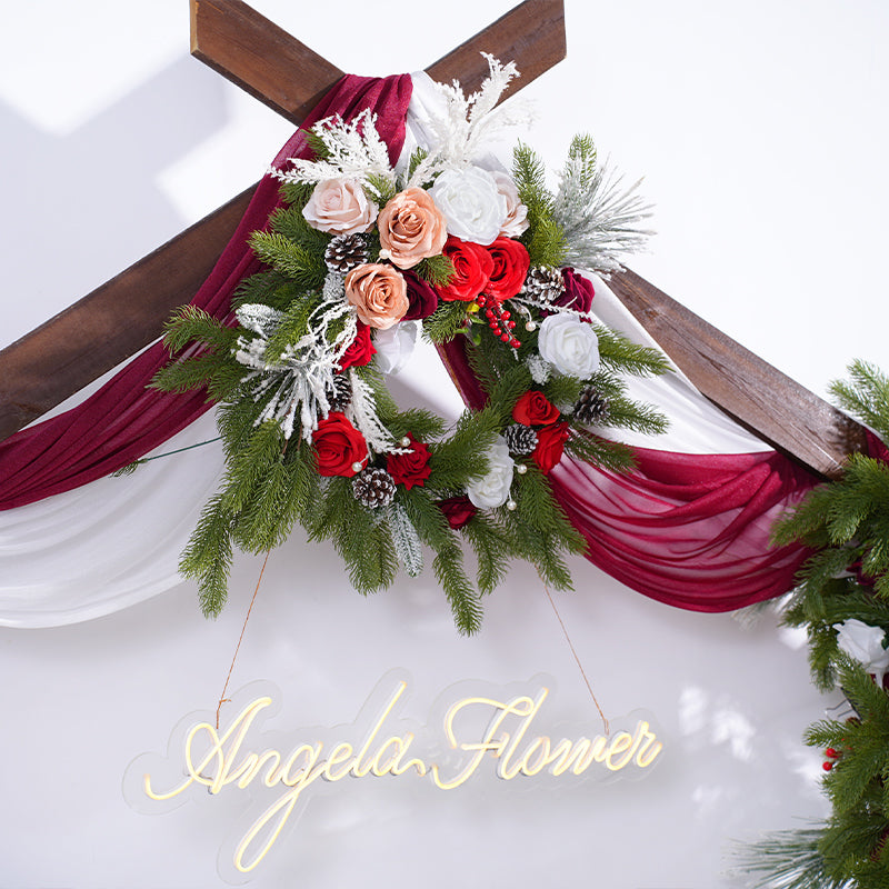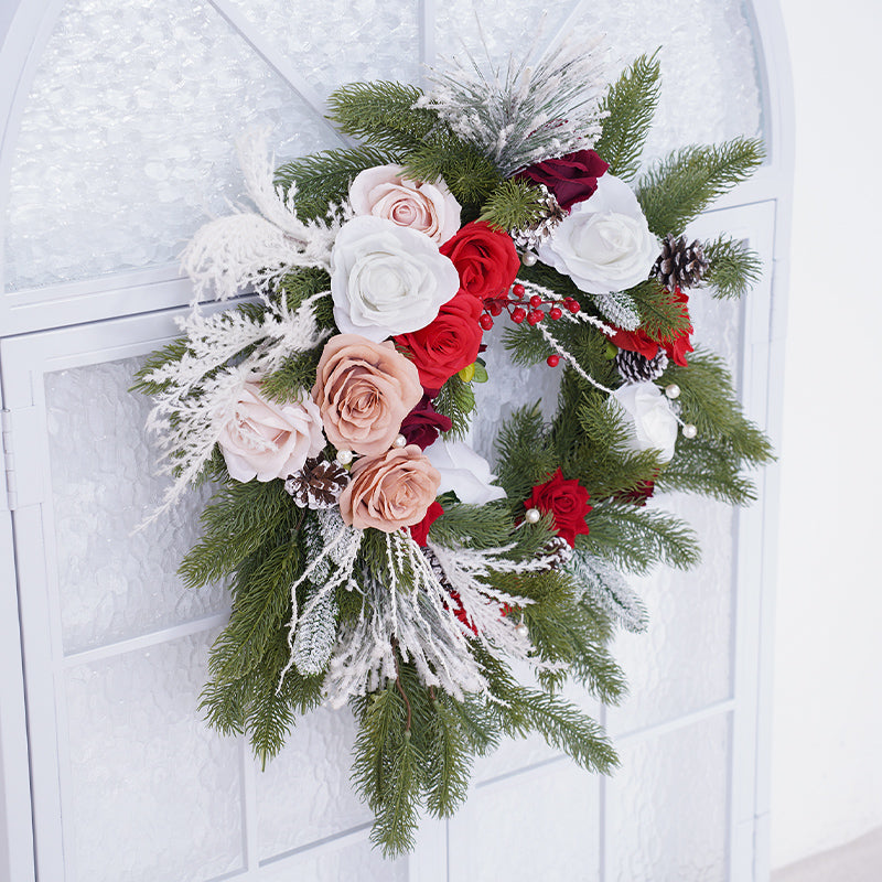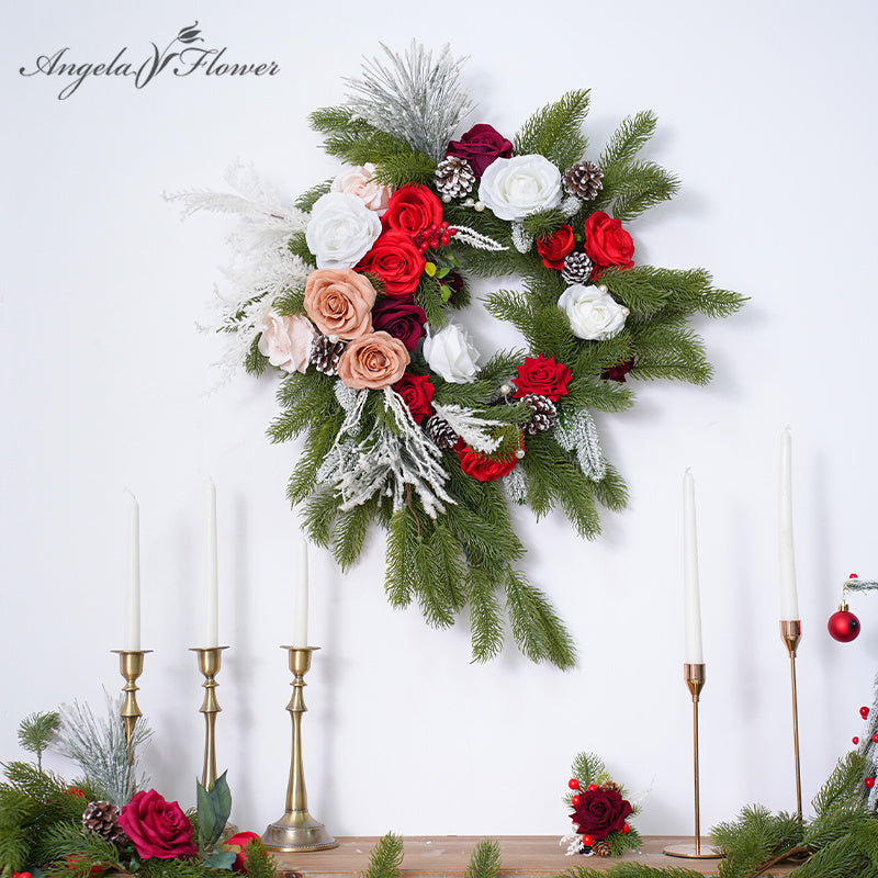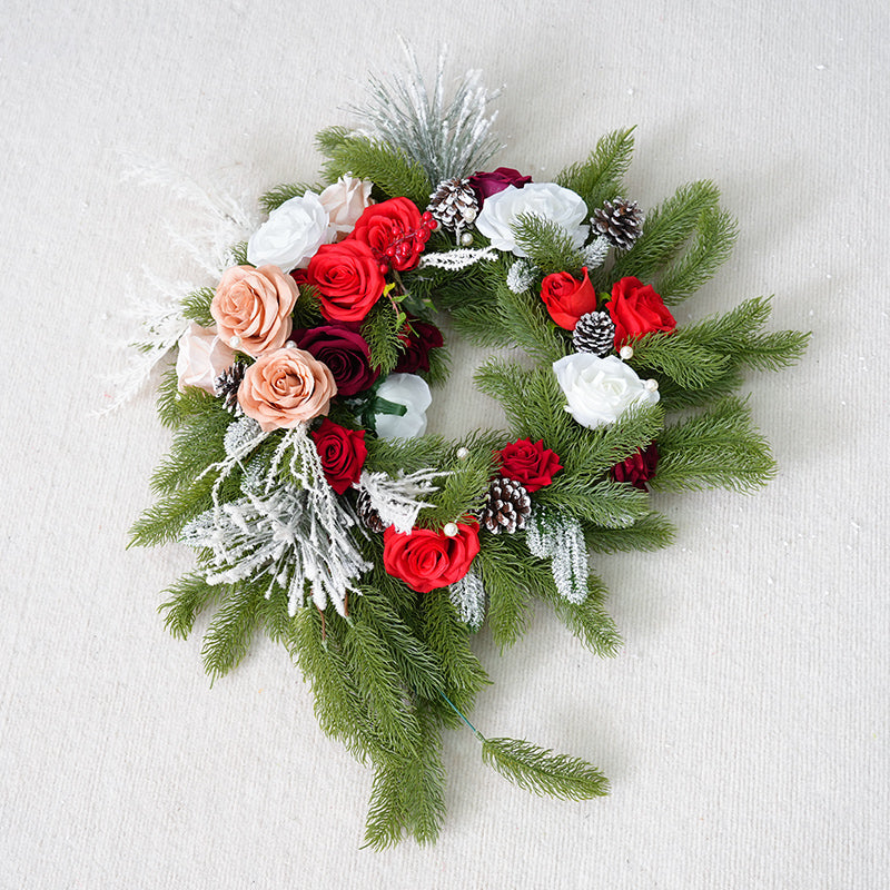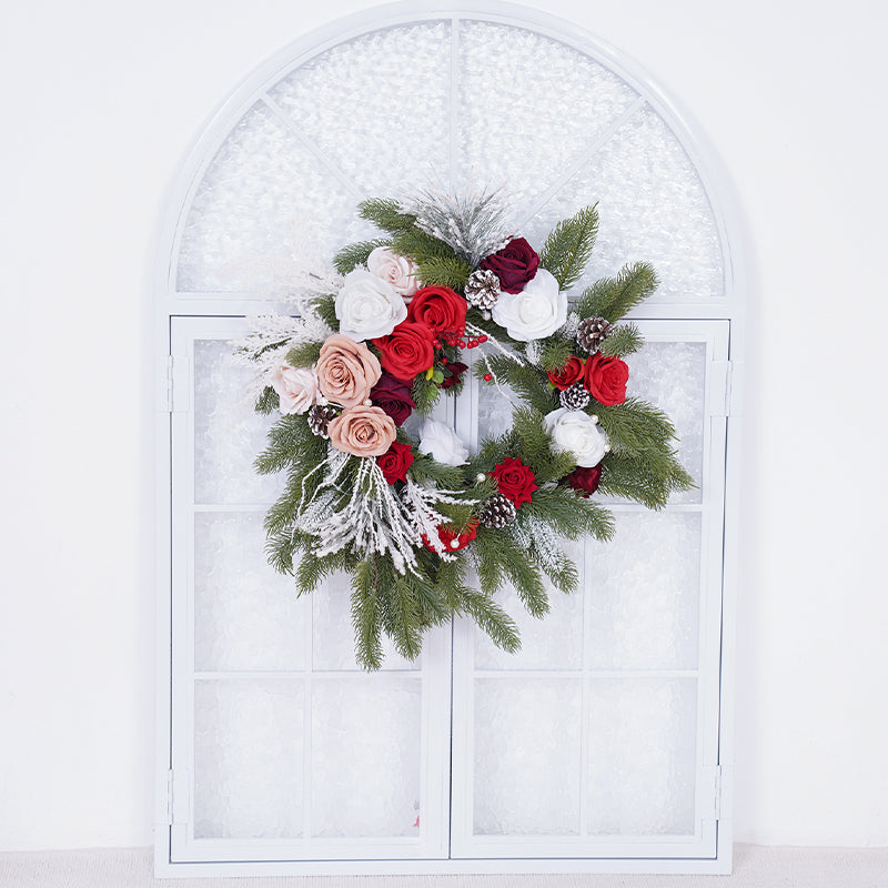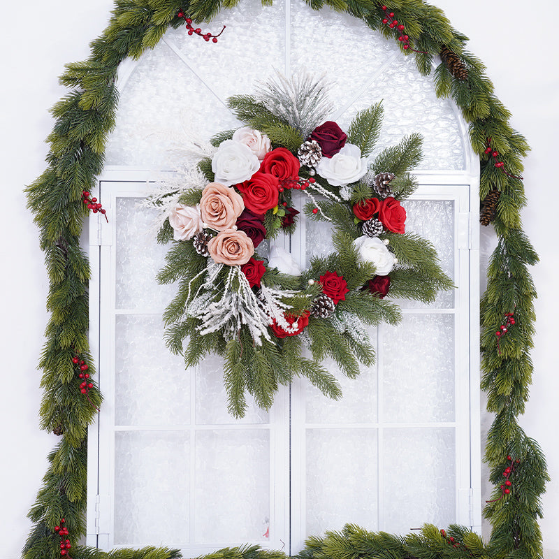 A866214 Christmas Series Red Rose Pine Needle Rattan Wreath