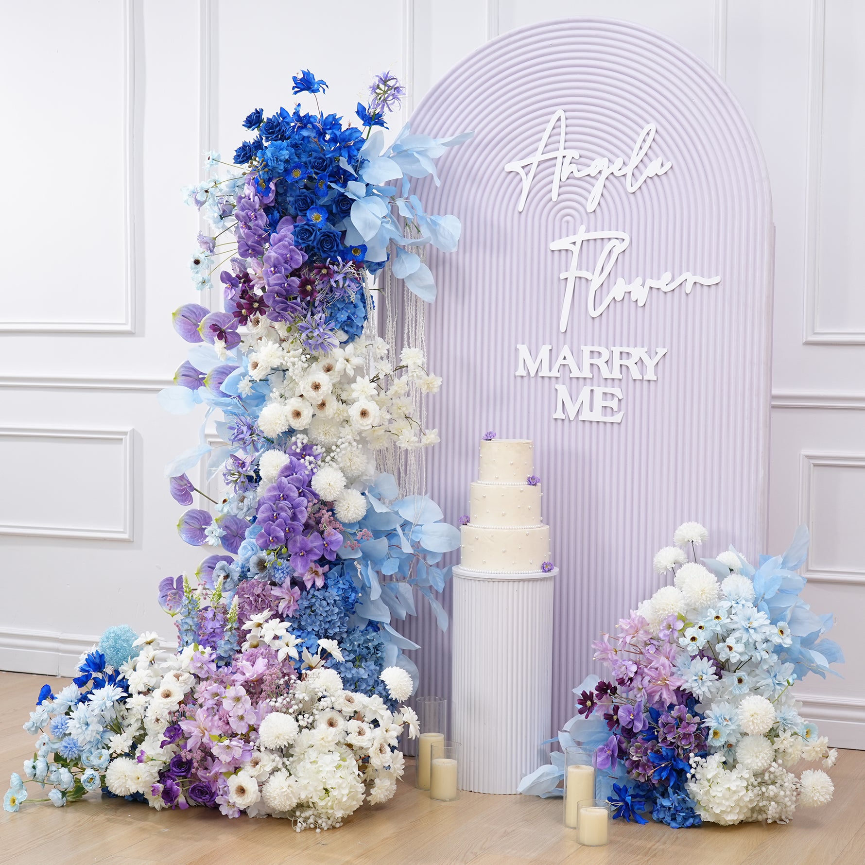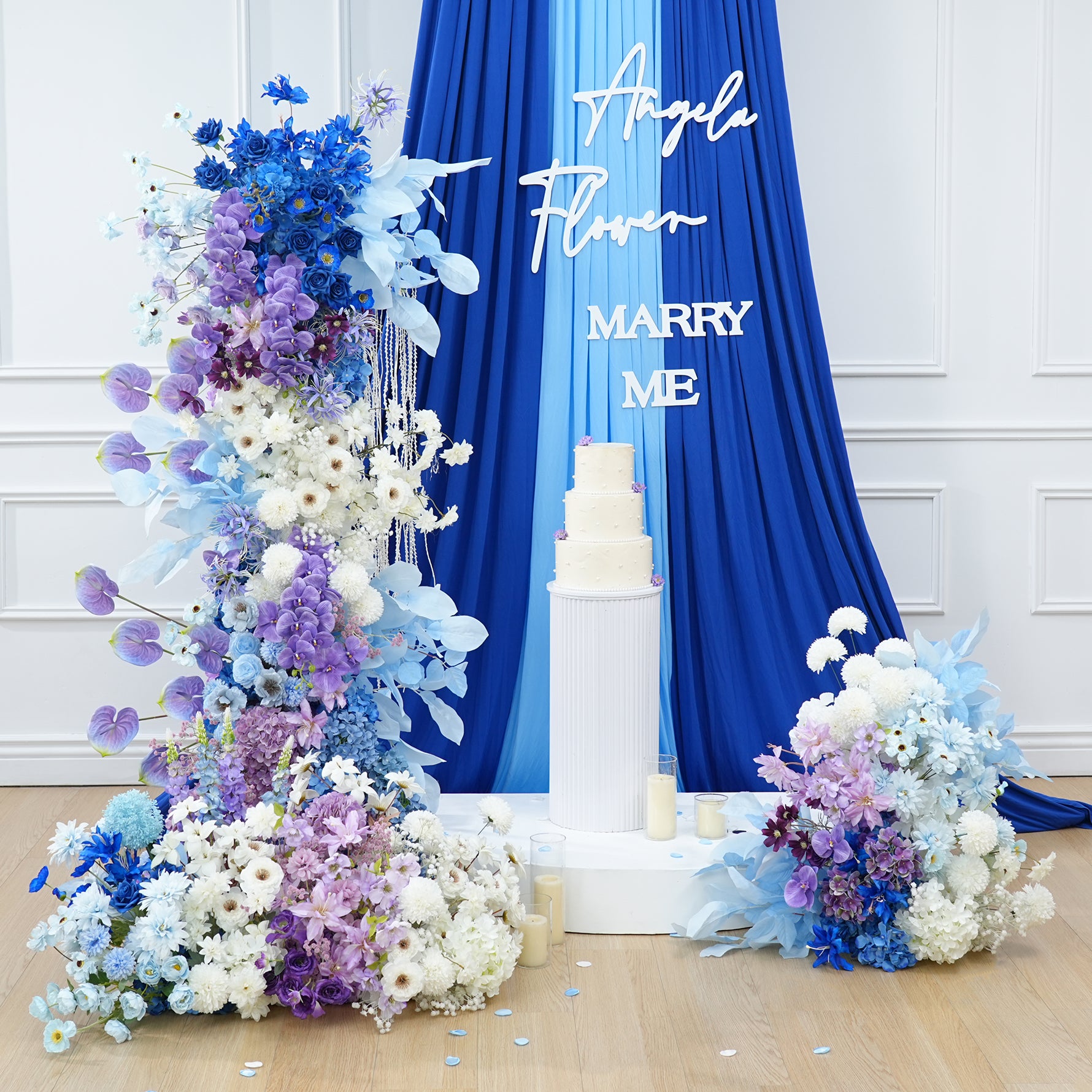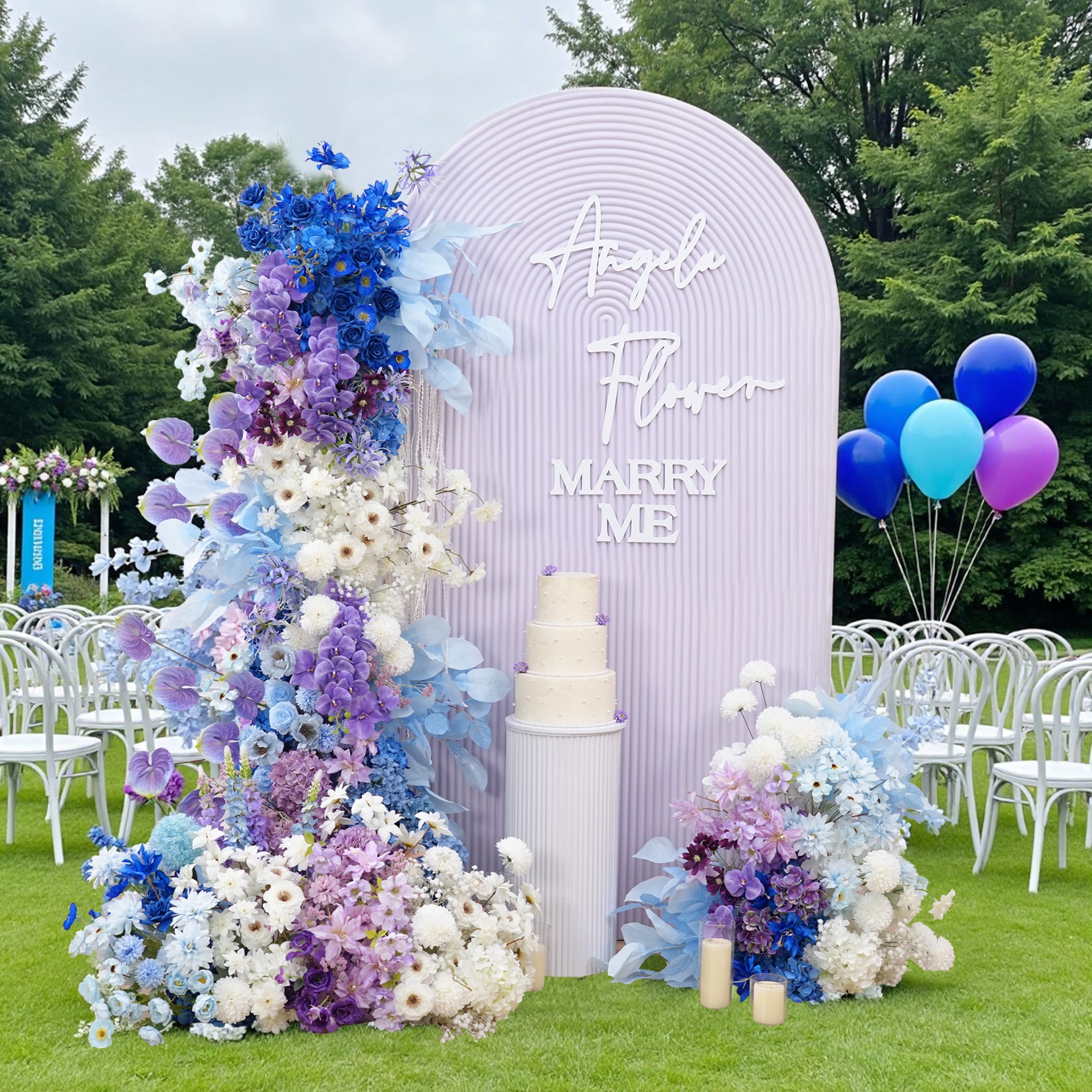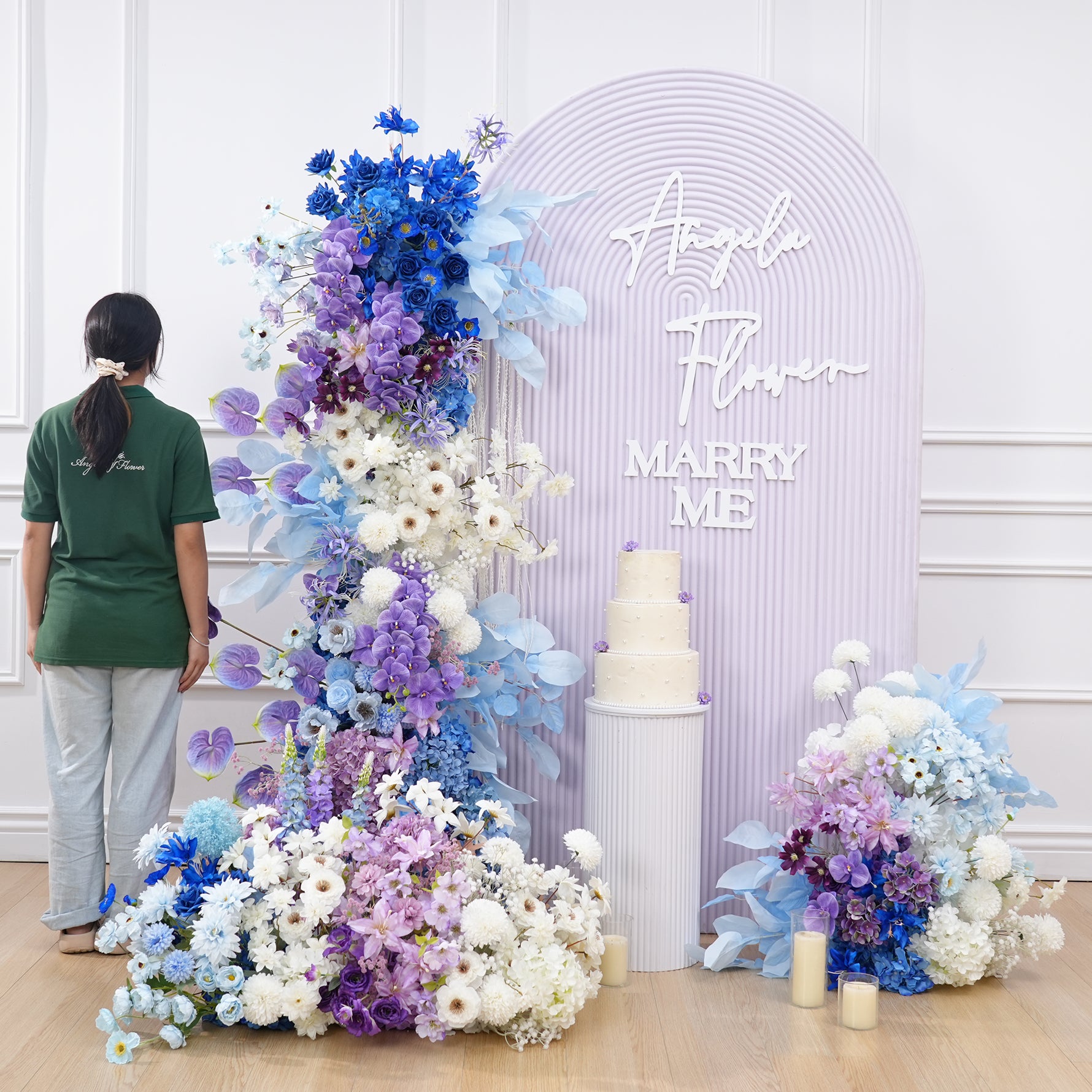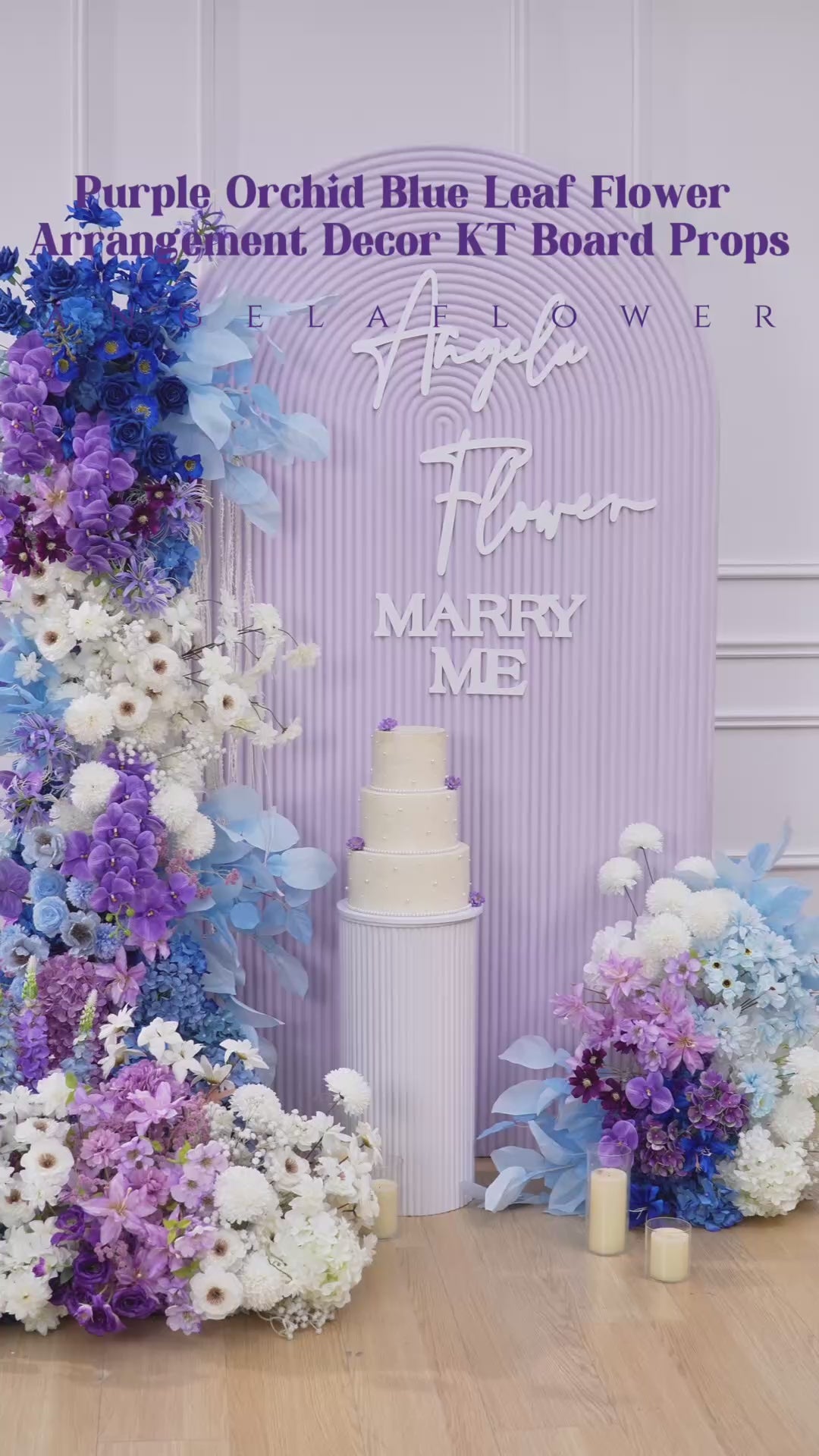 Color Inspiration: This KT board background flower arrangement uses selected blue leaves with vibrant, thick texture and clear leaf veins; delicate purple Phalaenopsis orchids spread their petals and have an elegant and moving posture. A variety of blue flowers are staggered, and the main flowers echo each other, forming a richly layered three-dimensional landscape. Imagine this row of flowers as the background of the wedding, framing the happiest moments of the couple.