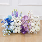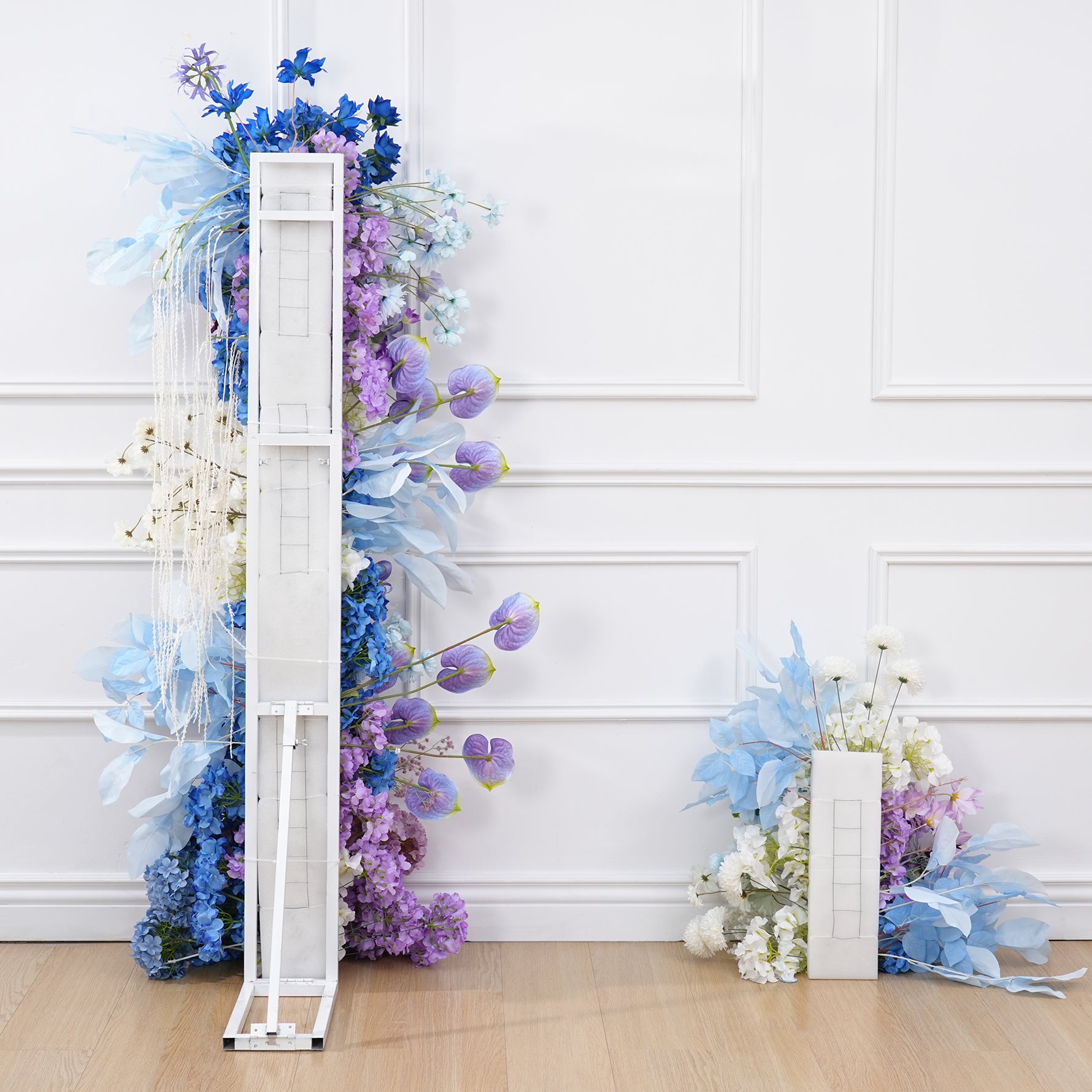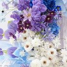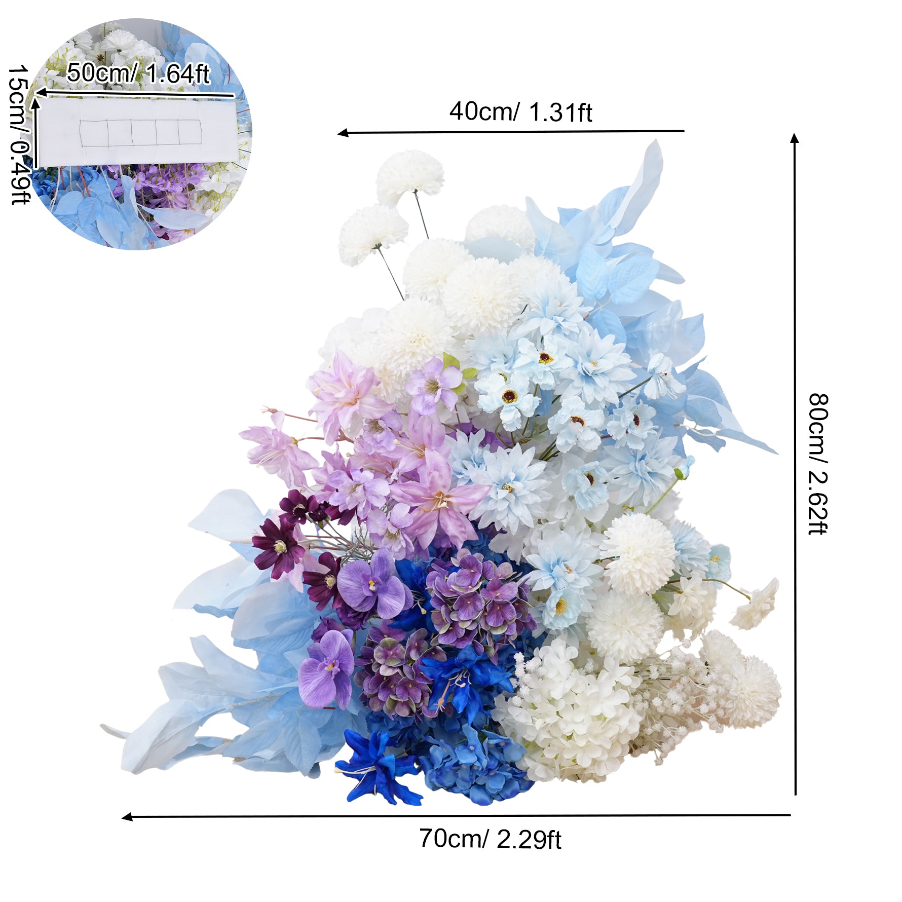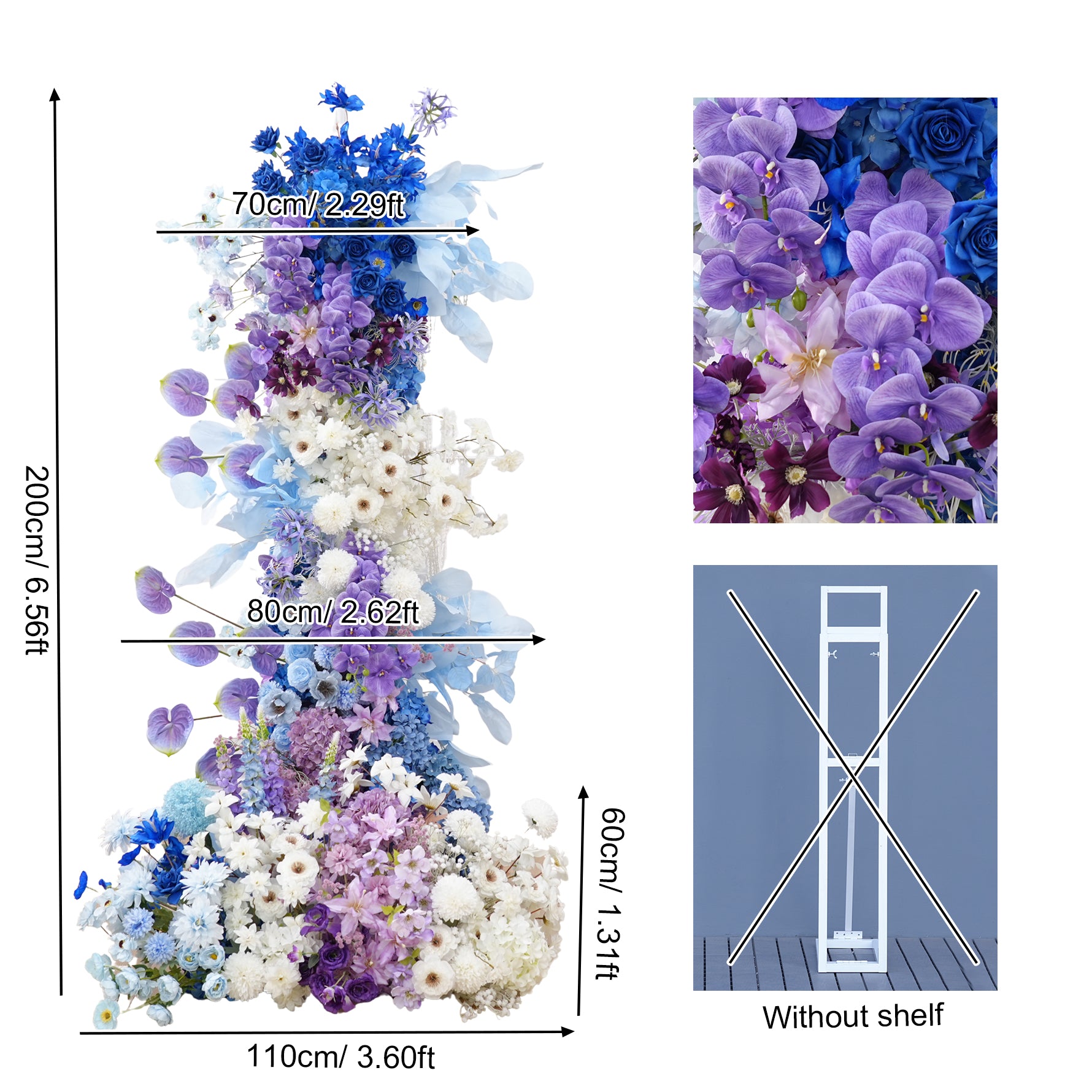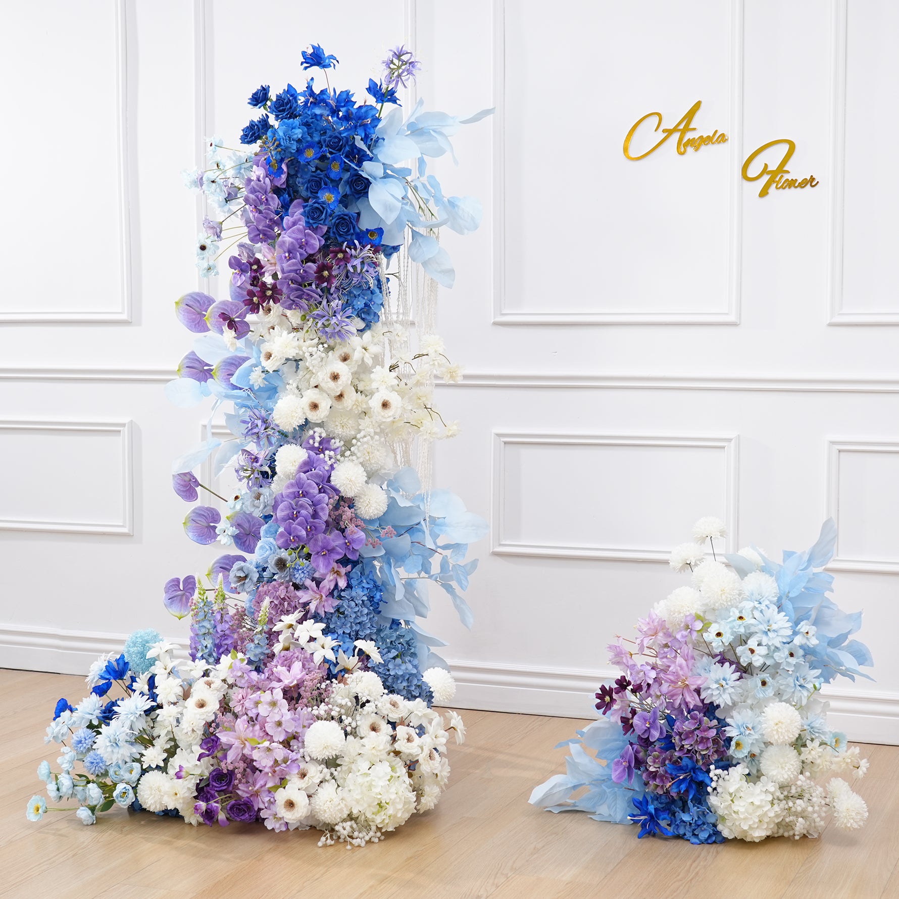 Color Inspiration: This KT board background flower arrangement uses selected blue leaves with vibrant, thick texture and clear leaf veins; delicate purple Phalaenopsis orchids spread their petals and have an elegant and moving posture. A variety of blue flowers are staggered, and the main flowers echo each other, forming a richly layered three-dimensional landscape. Imagine this row of flowers as the background of the wedding, framing the happiest moments of the couple.