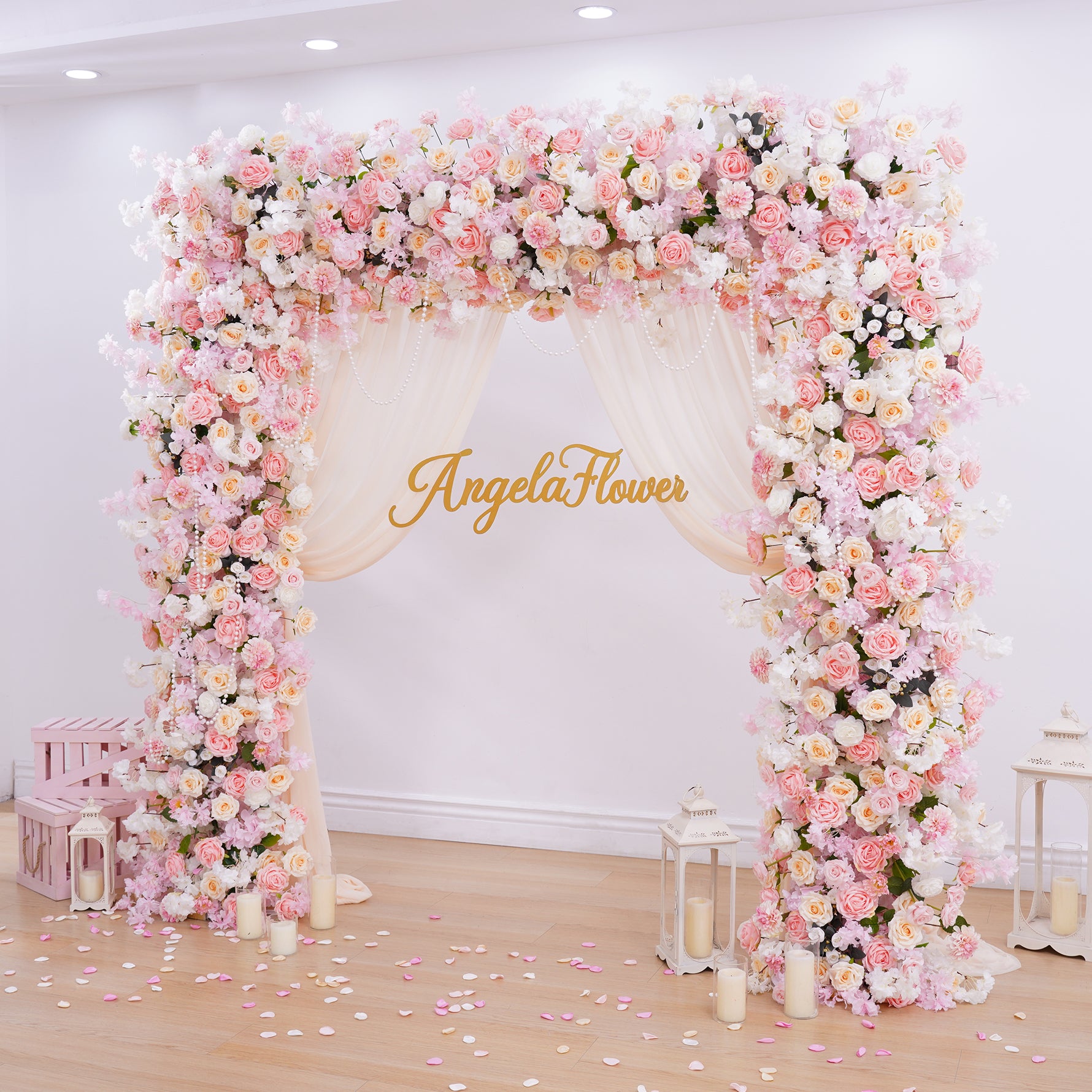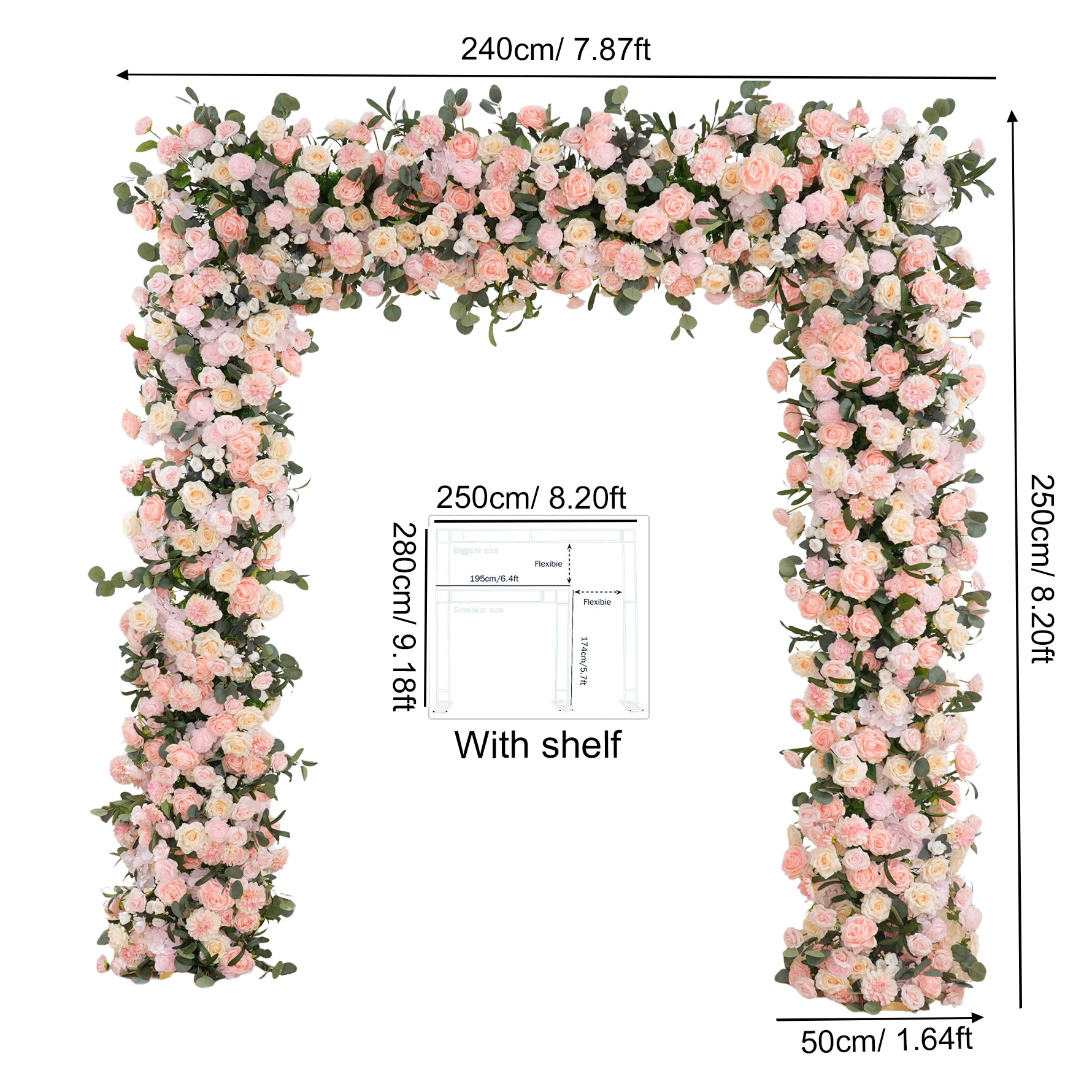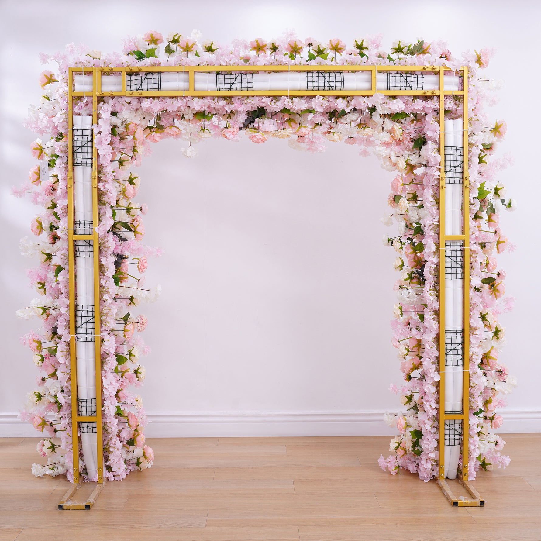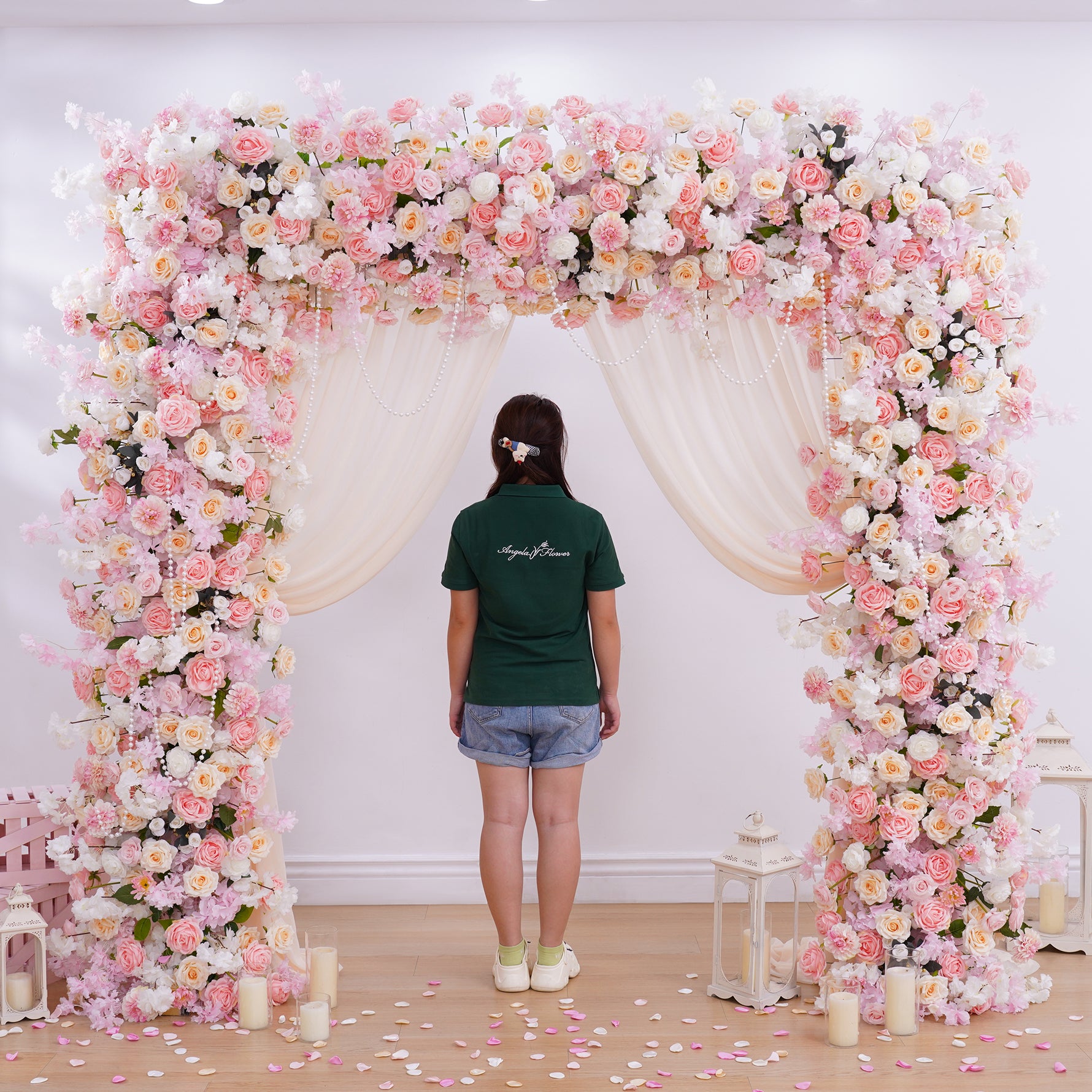 Color Inspiration: Add a touch of rosy charm to any setting with our elegant square arch, made from artificial pink and champagne roses, interspersed with delicate cherry blossoms. The gentle colors create a soft, romantic ambiance perfect for weddings, photo booths, or home decor. Create unforgettable memories with this stunning floral accent.