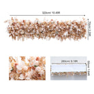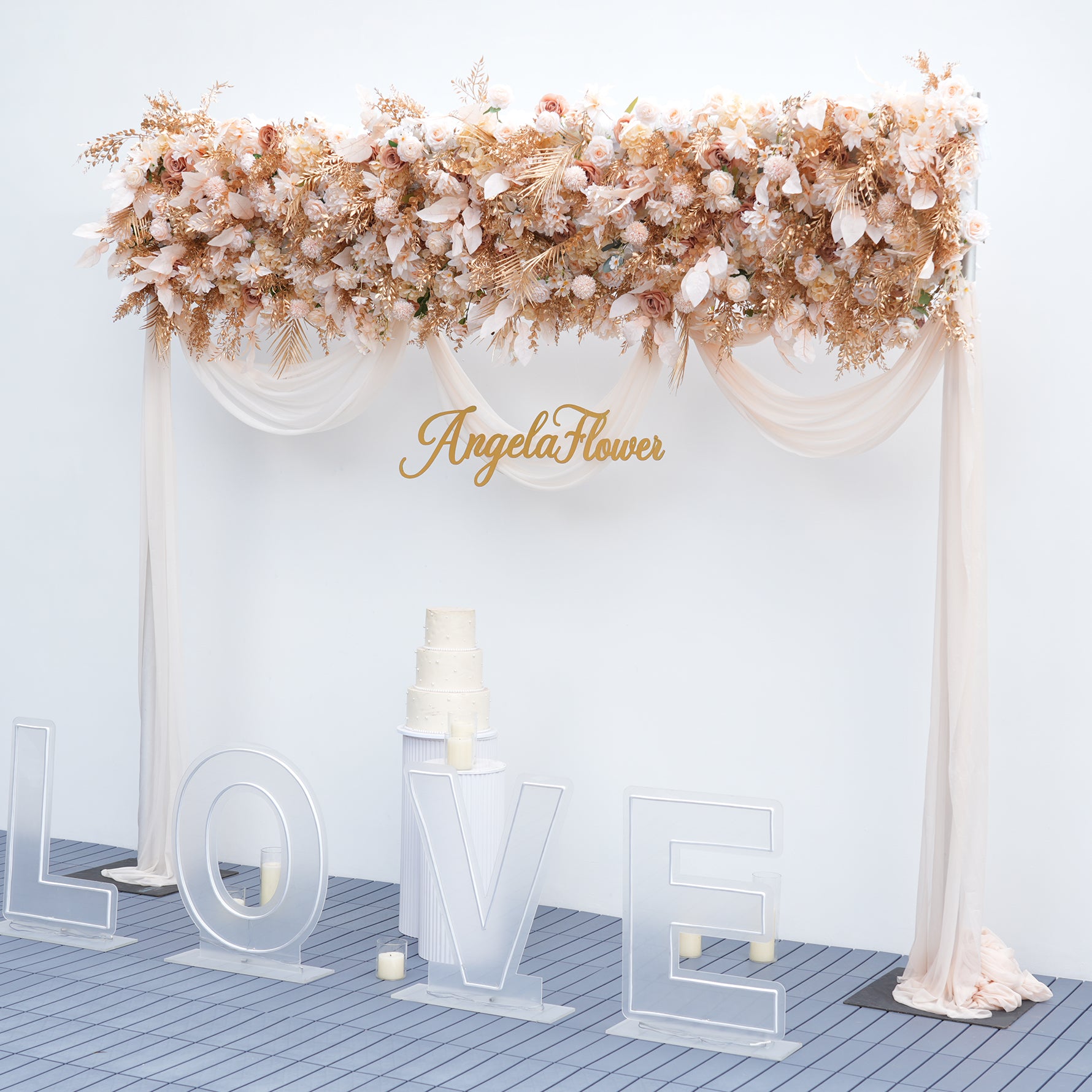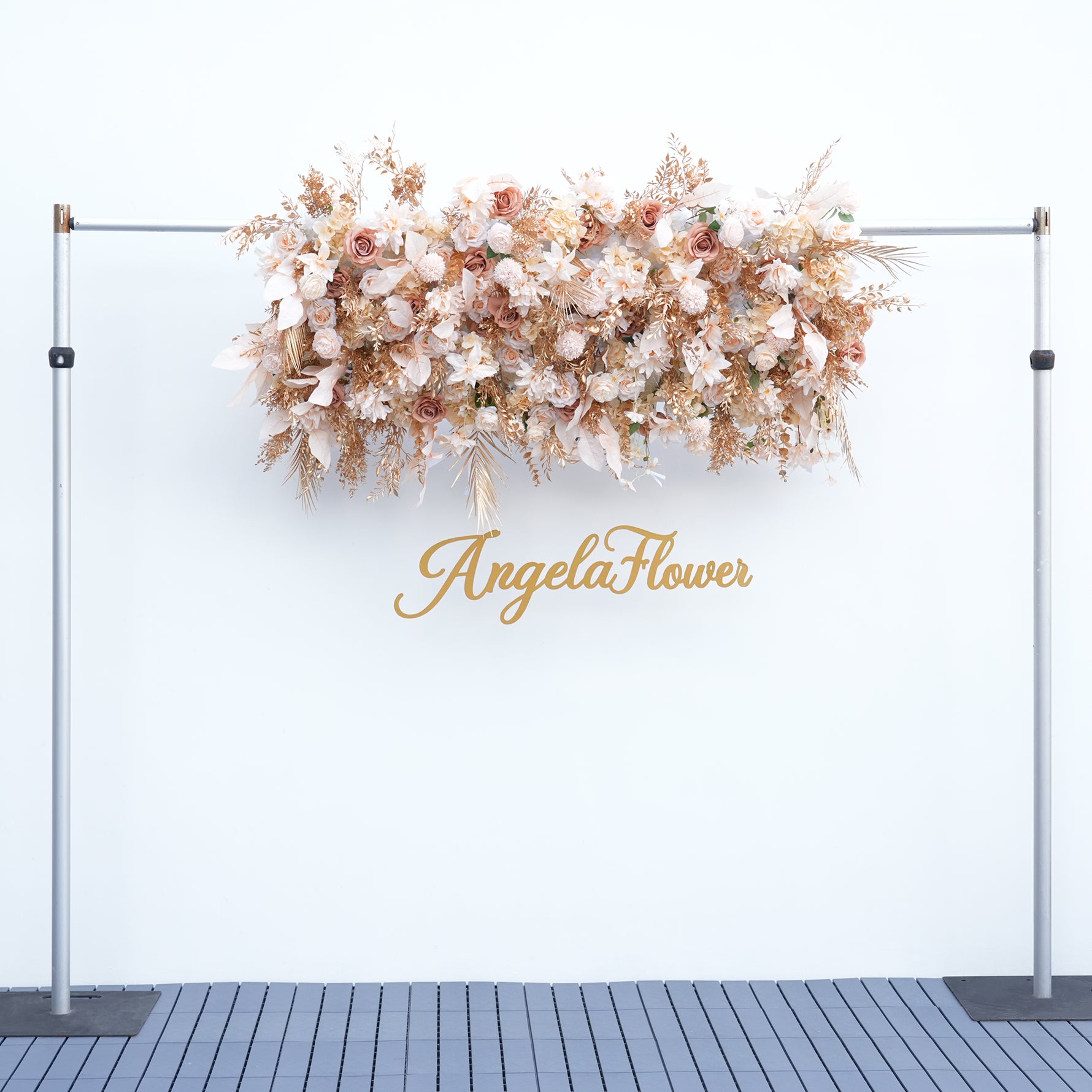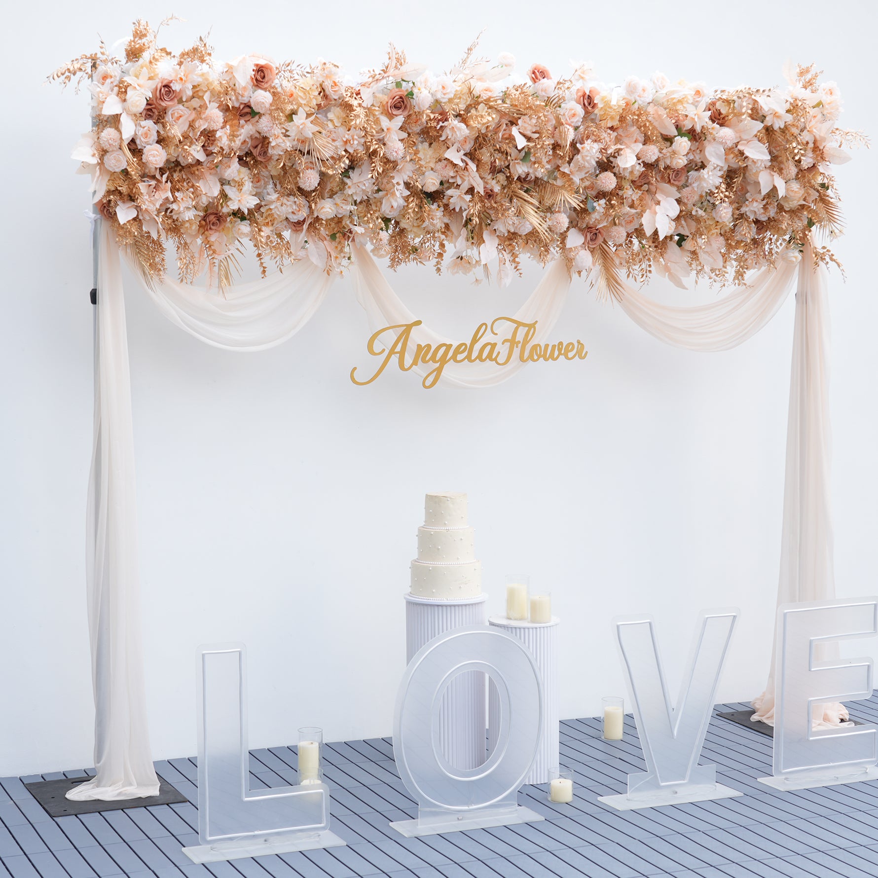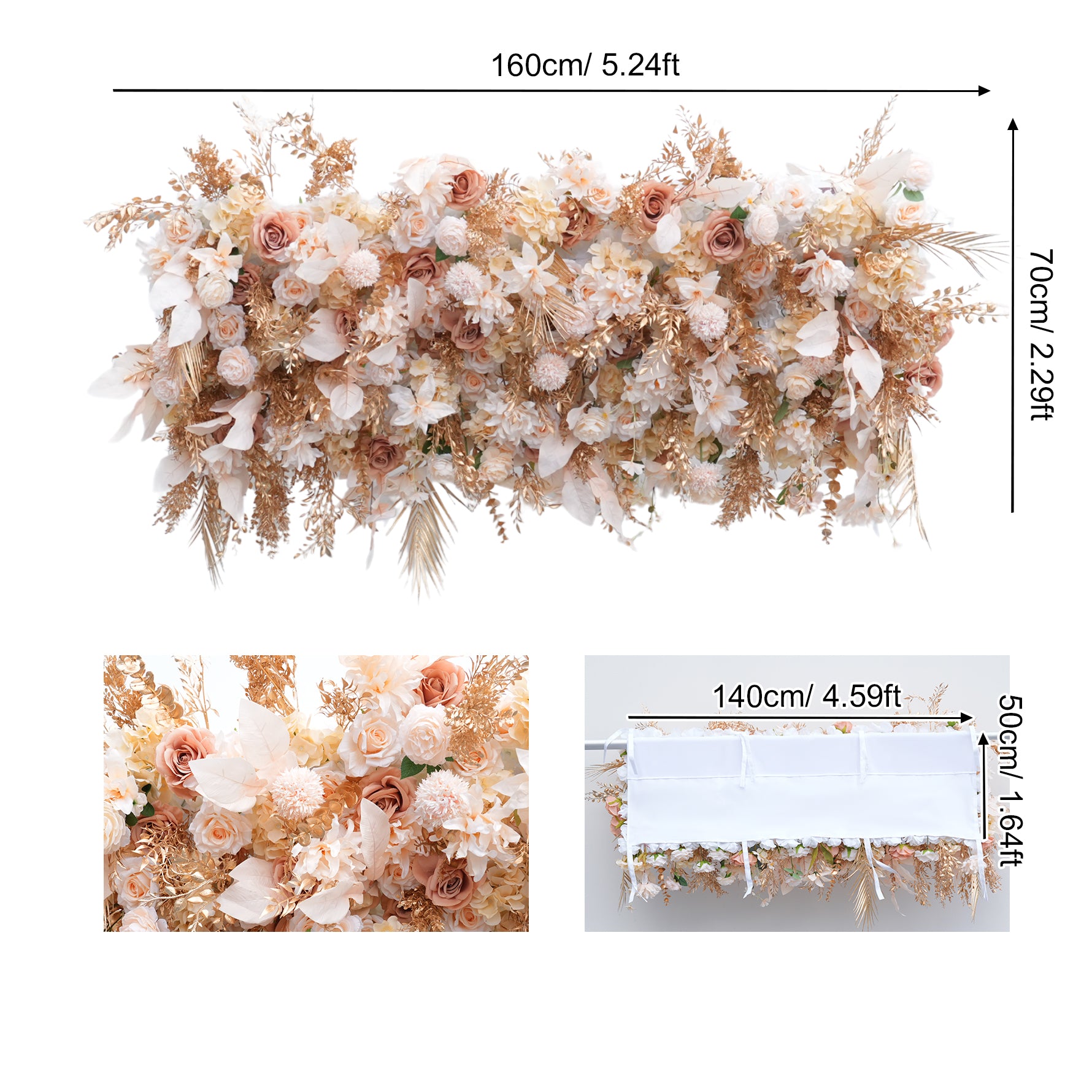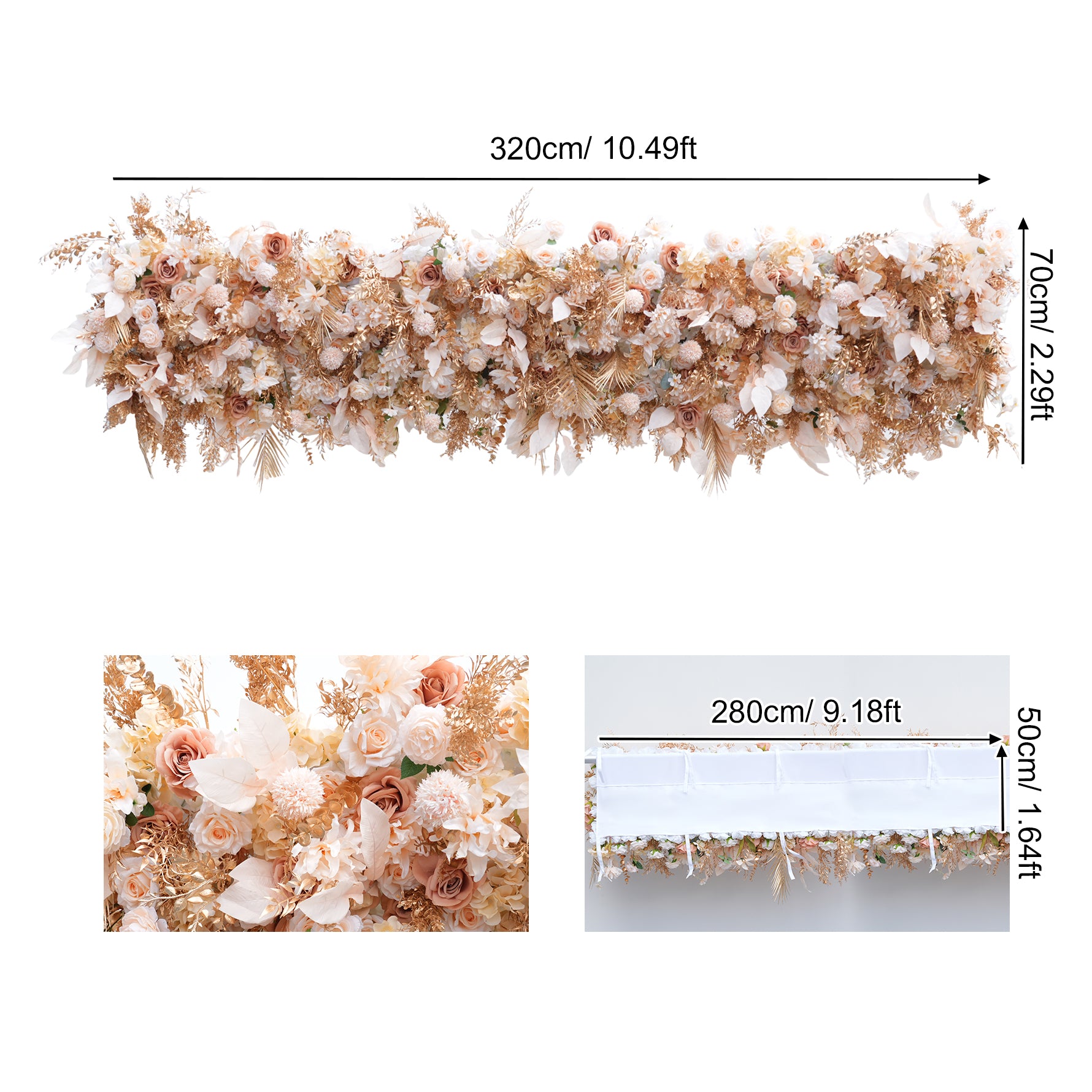 Color Inspiration: Add a touch of opulent glamour to your event with our stunning floral row! This exquisite piece features shimmering gold leaves intertwined with delicate champagne roses. The soft, romantic hue of the roses complements the rich gold tones, creating a luxurious display. Perfect for weddings, parties, or adding a touch of sophistication to your home décor.