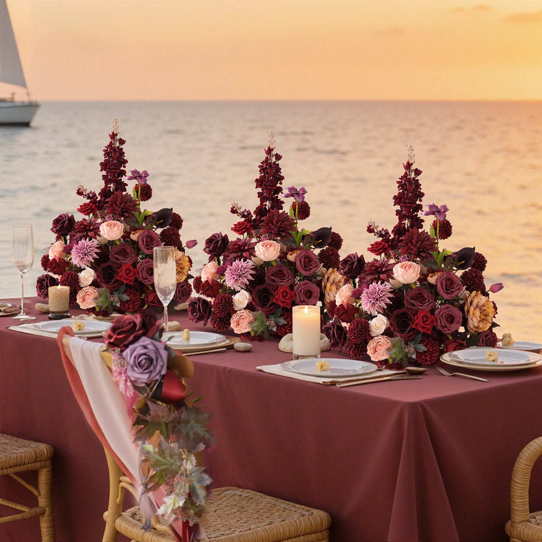 Color Inspiration: Elevate your table setting with our exquisite burgundy centerpiece. Featuring a blend of romantic roses and airy delphiniums in rich wine hues, this 1.64ft arrangement creates a sophisticated and dramatic focal point. Perfect for weddings, banquets, or elegant home décor.