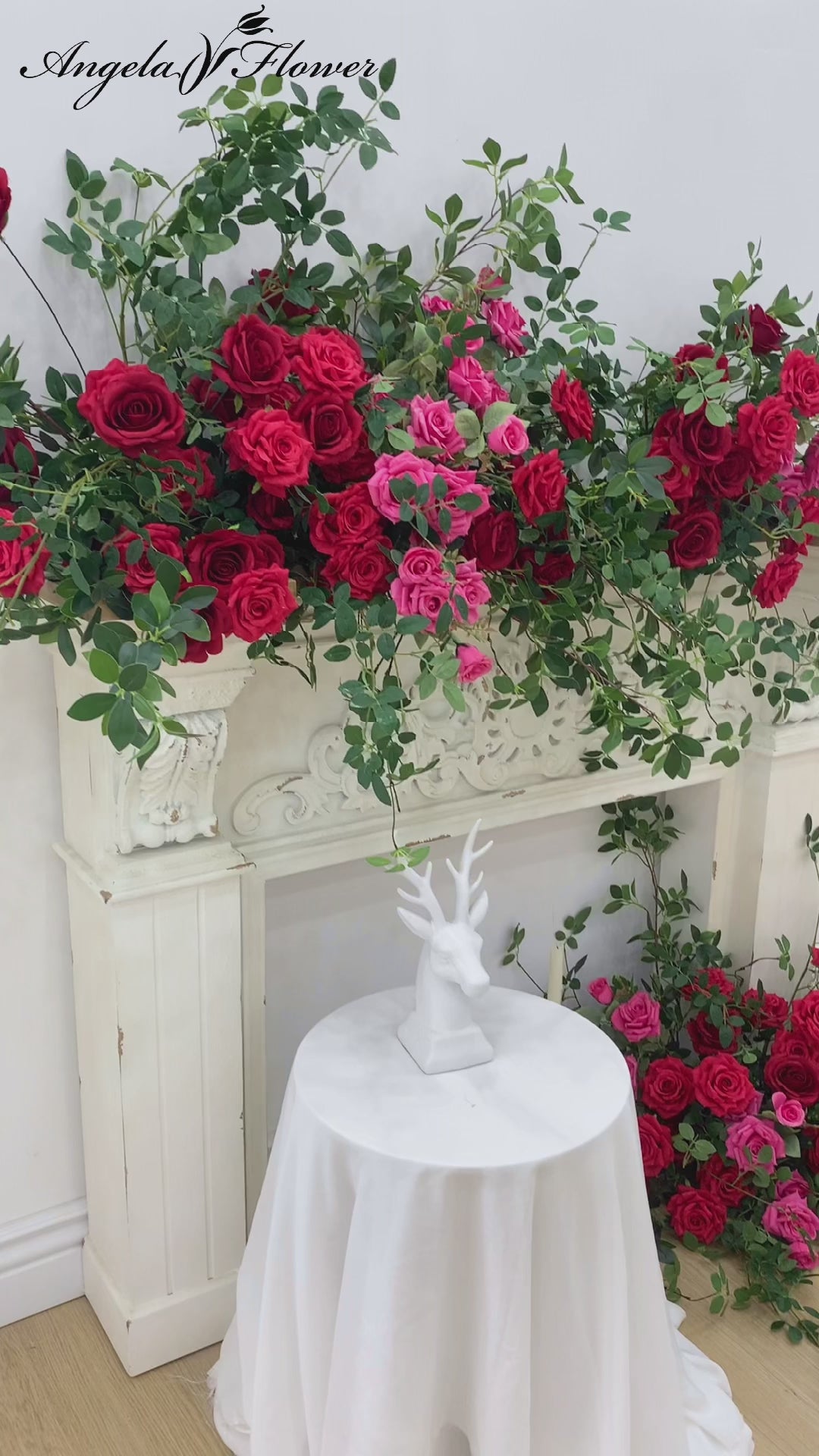 A7874 Red Hot Pink Rose Greenery Hang Floral Row Decor Wedding Backdrop Arch