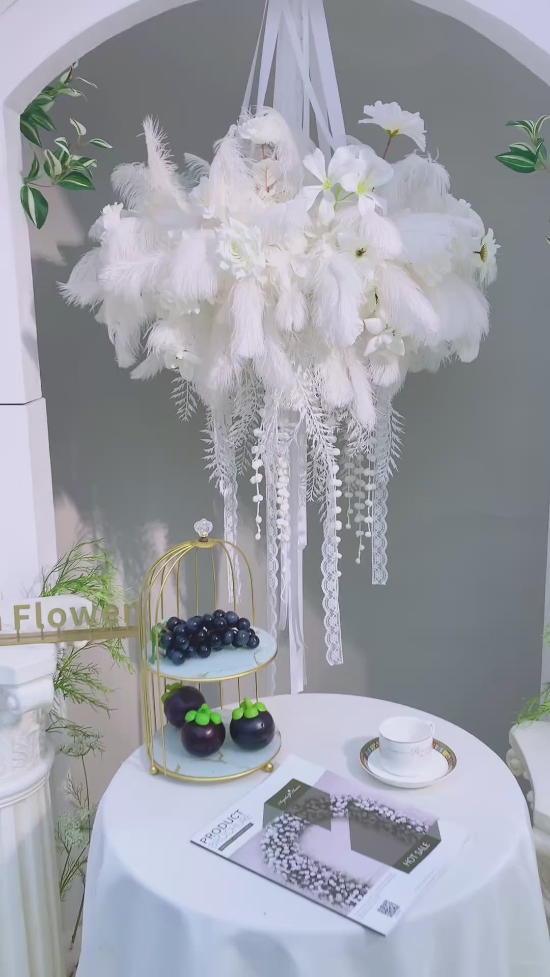 A8845 White Feather Vine Hanging Wreath Wedding Background Ceiling Hoop Flower Row