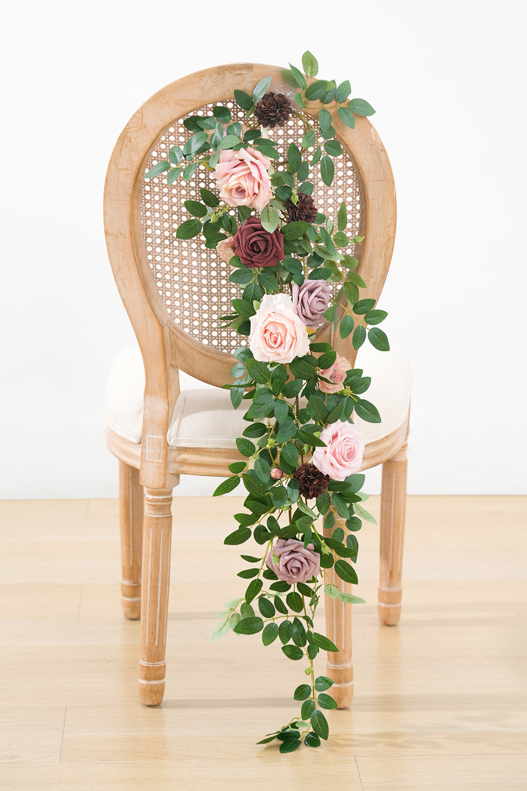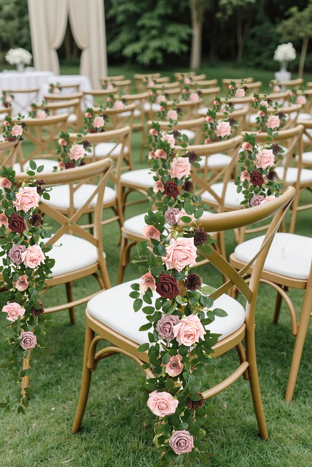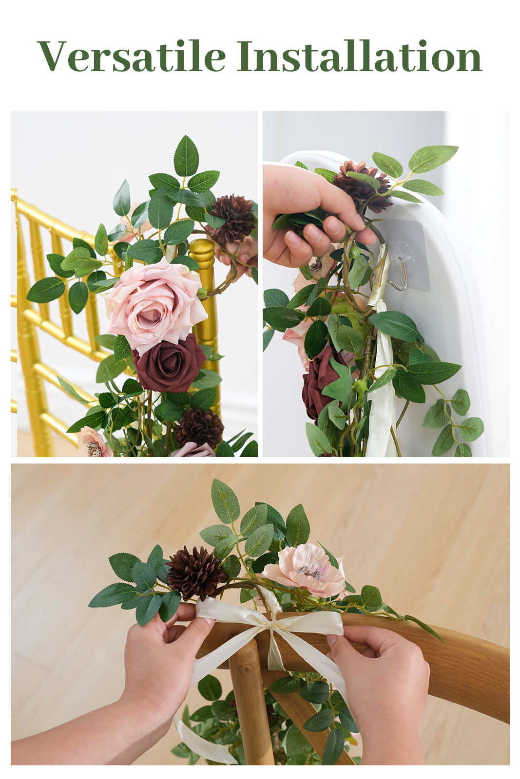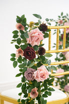 Color Inspiration: Enhance your wedding decor with our bean paste chair flower Set! This 4-piece collection features silk roses, delicate rose buds, and verdant green vines, creating a subtle and romantic touch. The muted ean paste tones evoke a sense of understated elegance. Perfectly complementing these chair adornments, our eucalyptus garland wedding decorations for reception add a touch of natural charm.
