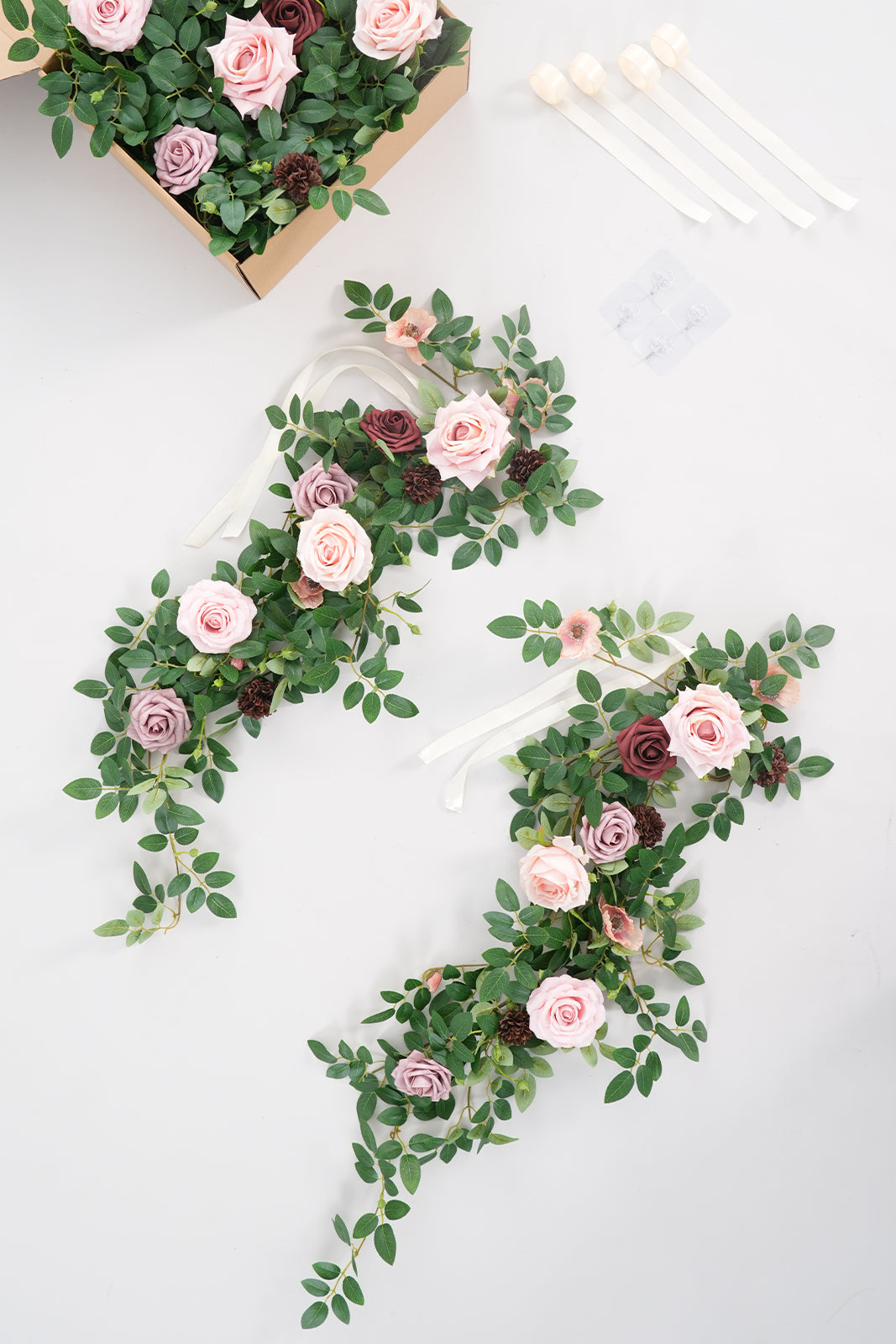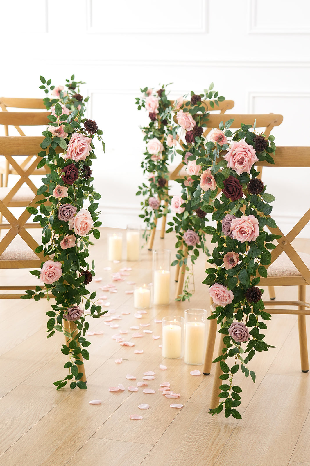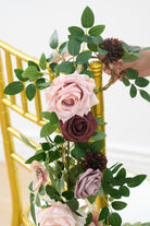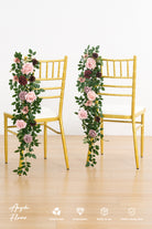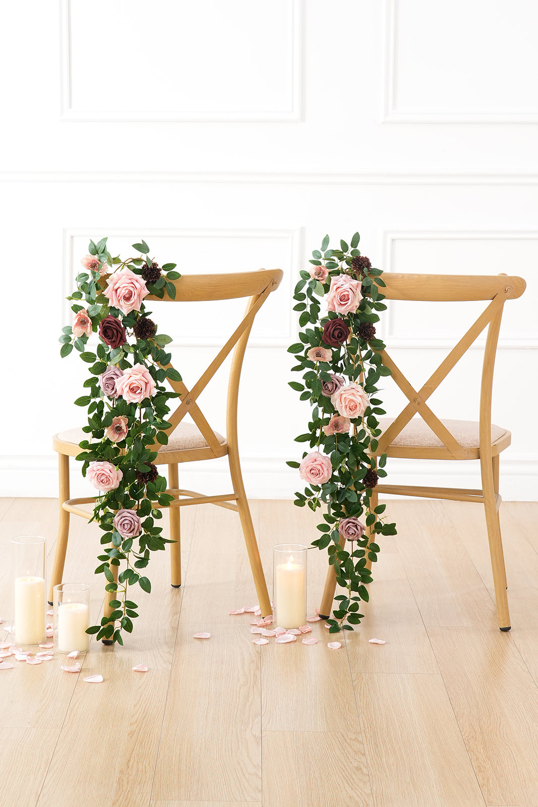 Color Inspiration: Enhance your wedding decor with our bean paste chair flower Set! This 4-piece collection features silk roses, delicate rose buds, and verdant green vines, creating a subtle and romantic touch. The muted ean paste tones evoke a sense of understated elegance. Perfectly complementing these chair adornments, our eucalyptus garland wedding decorations for reception add a touch of natural charm.
