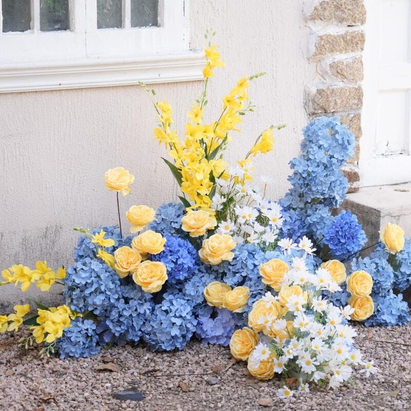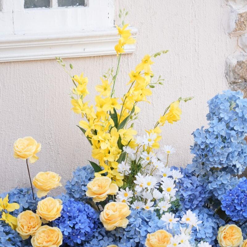 Color Inspiration: Featuring lush blue hydrangeas paired with vibrant yellow accent blooms, this hang flowwer and aisle flower combination evokes the rich texture and emotion of a classic oil painting. Perfect for adding a touch of refined elegance to weddings, parties, or everyday décor.
